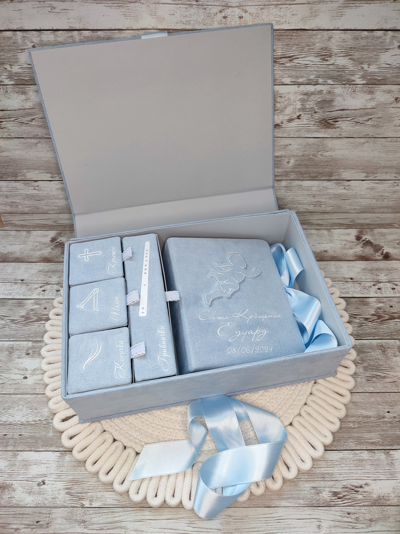 Кутия, облечена във велур, в която може да съхраните най-ценните предмети за спомен, свързани в появата на Вашето бебе. Включва: ~ Кутия за пъпче ~ Кутия за гривнички ~ Кутия за косичка ~ Кутия за кръстче ~ Свободно място за други неща, които искате да запазите за спомен Може да се съчетае с комплект за кръщене. Може да бъде изработена по индивидуален размер, цвят, тема и съдържанието да бъде по Ваш избор: ~ Мини албум с фолийни джобчета за 100бр снимки 10/15 ~ Кутия за тест за бременност ~ Кутия за зъбче ~ други