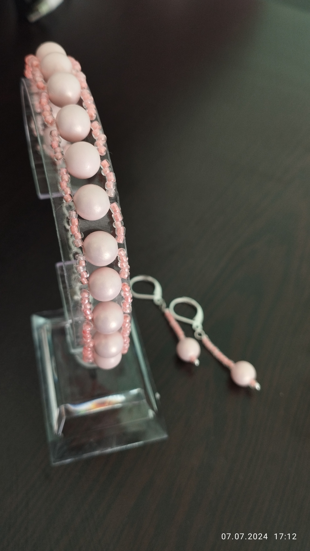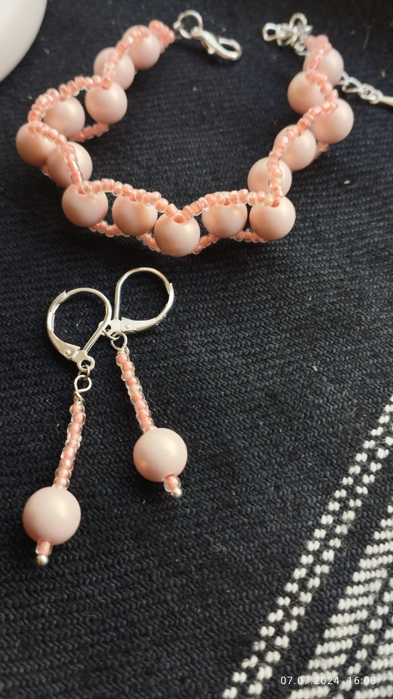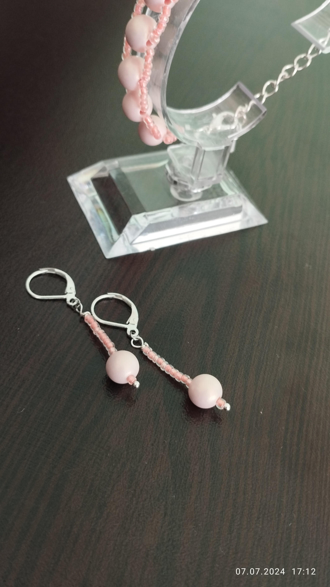 Гривна и обеци, изработени със стъклени мъниста в коралов цвят и бледо розови акрилни мъниста. Кукичките на обеците са сребърни. Обеците могат да бъдат изработени с няколко различни вида кукички.