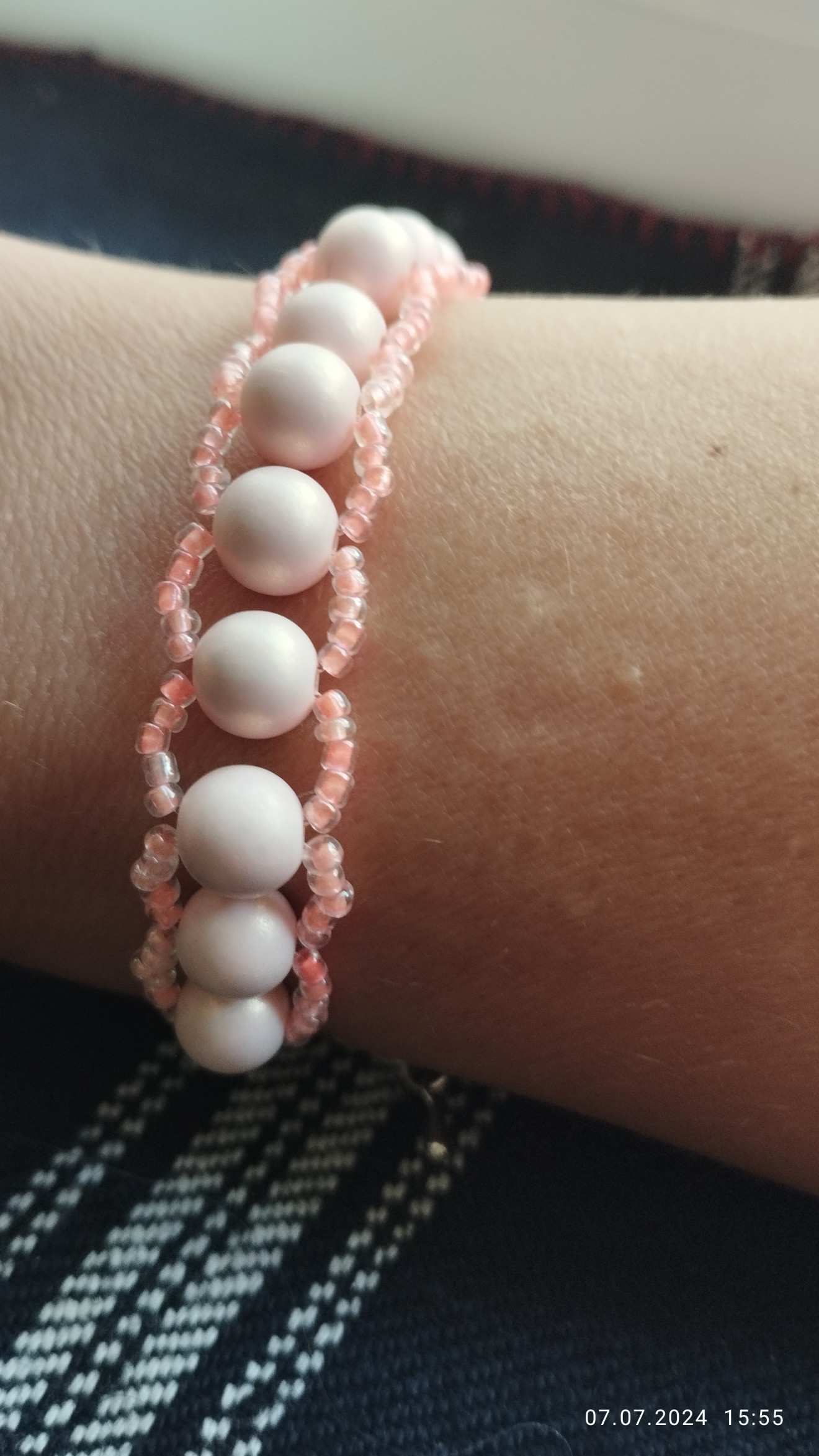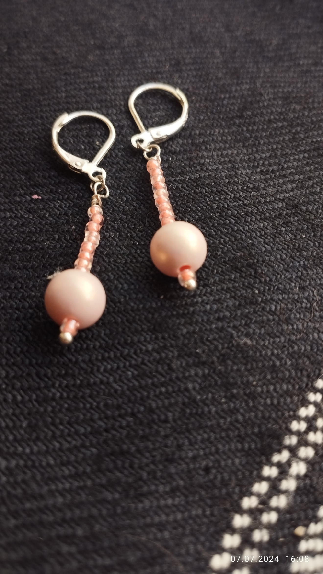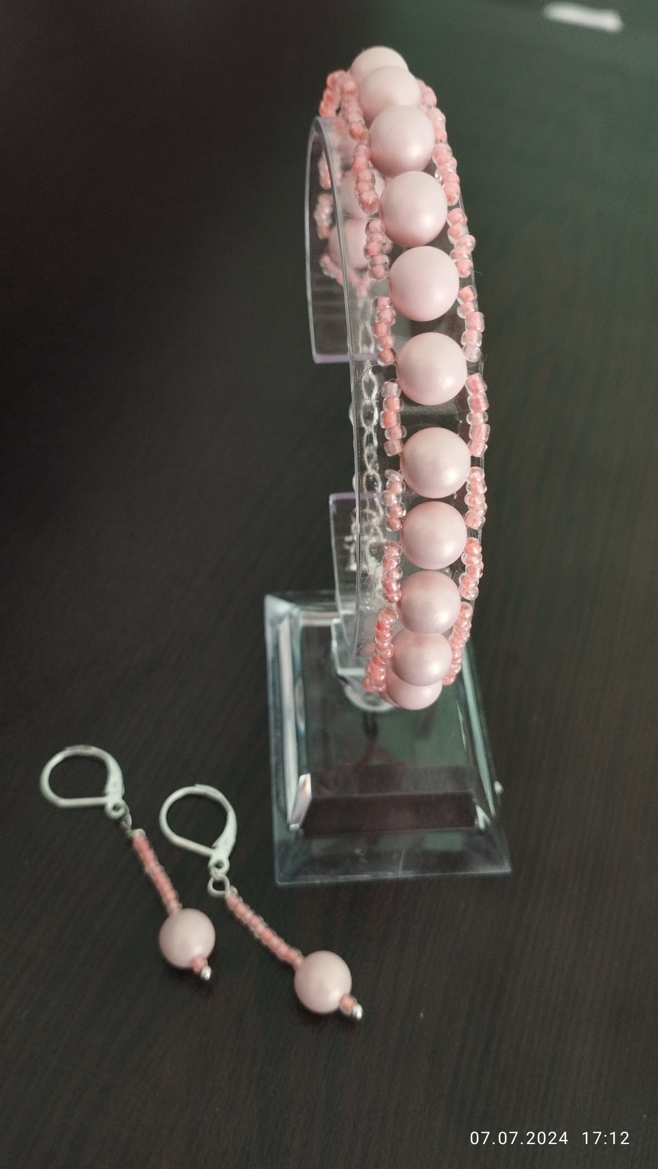 Гривна и обеци, изработени със стъклени мъниста в коралов цвят и бледо розови акрилни мъниста. Кукичките на обеците са сребърни. Обеците могат да бъдат изработени с няколко различни вида кукички.