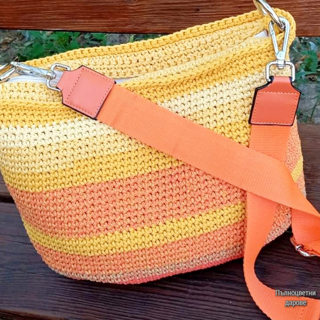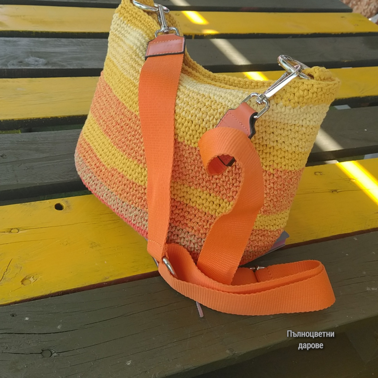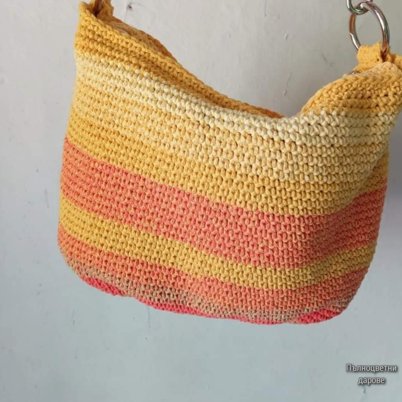 Дамска чанта с цветовете на яркото лято. С гъвкаво овално дъно, което й придава женственост. Изплетена от тънко памучно въже в няколко топли нюанса жълто и оранжево. Размери (приблизително): Височина 28 см. Обиколка 74 см. Ширина от горната страна, където е ципът 34 см. Подплата с два вътрешни джоба. Тъкана текстилна дръжка с изкуствена кожа и метални елементи. Регулиране на дължината от 100 до 144 см. Всички чанти пристигат опаковани в кутия с панделка. Възможност за добавяне на лично пожелание, когато е за подарък. И разбира се, с инструкции за пране и почистване. Напишете съобщение, за да уточним детайлите. Поздрави, Пълноцветни дарове ?