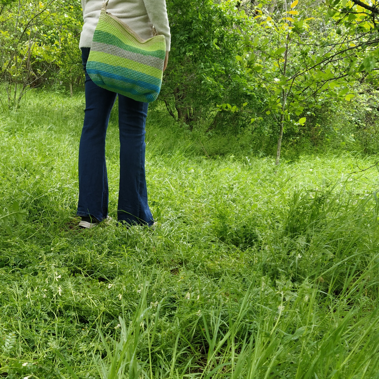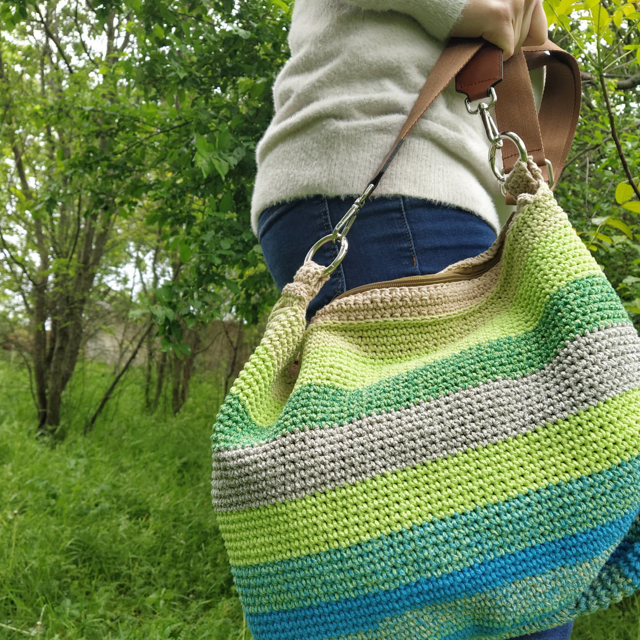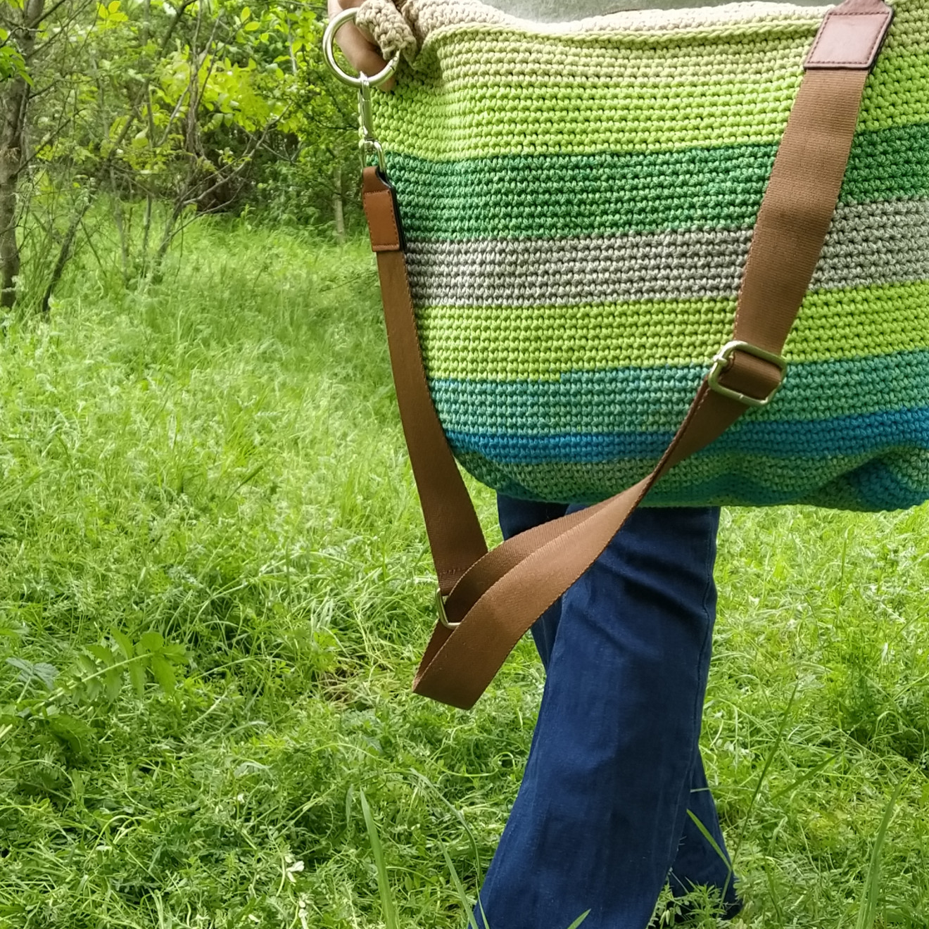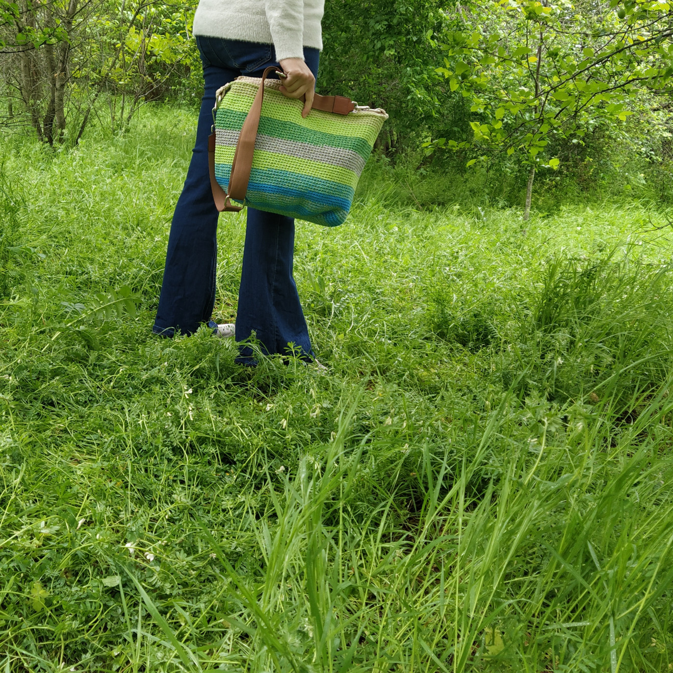 Снимана в дъждовниен ден, когато тревата, храстите и дърветата са толкова свежи. В същите нюанси, като на чантата. И чудесно си паснаха. С каква идея я започнах? Исках моделът да е с приятна форма. Чантата да бъде женствена, практична и голяма. И в същото време, да може да се свие, за да е по-компактна. Когато не е натъпкана до безкрай, естествено. Изплетена е от тънко памучно въже. Достатъчно лека и гъвкава, но същевременно здрава. Има подплата с два вътрешни джоба, закопчаване с цип отгоре и текстилна дръжка, която се сваля. Размери (приблизително): Обиколка 80 см., височина 31 см. Всички чанти пристигат опаковани в кутия с панделка. Възможност за добавяне на лично пожелание, когато е за подарък. И разбира се, с инструкции за пране и почистване. Напишете съобщение, ако сте я познали за себе си или за подарък. ???