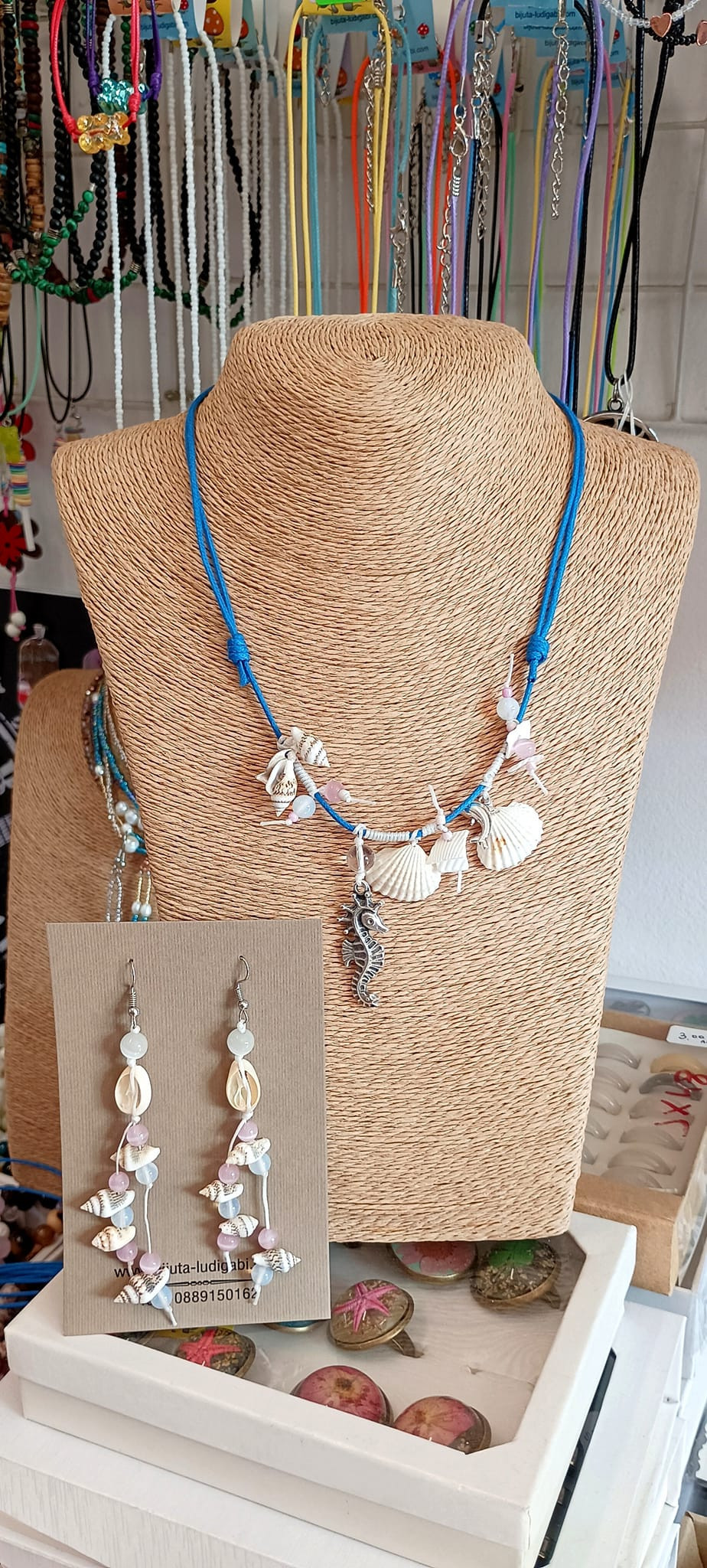 Дамски комплект колие и обеци с морски охлювчета, мидички и естествени камъни