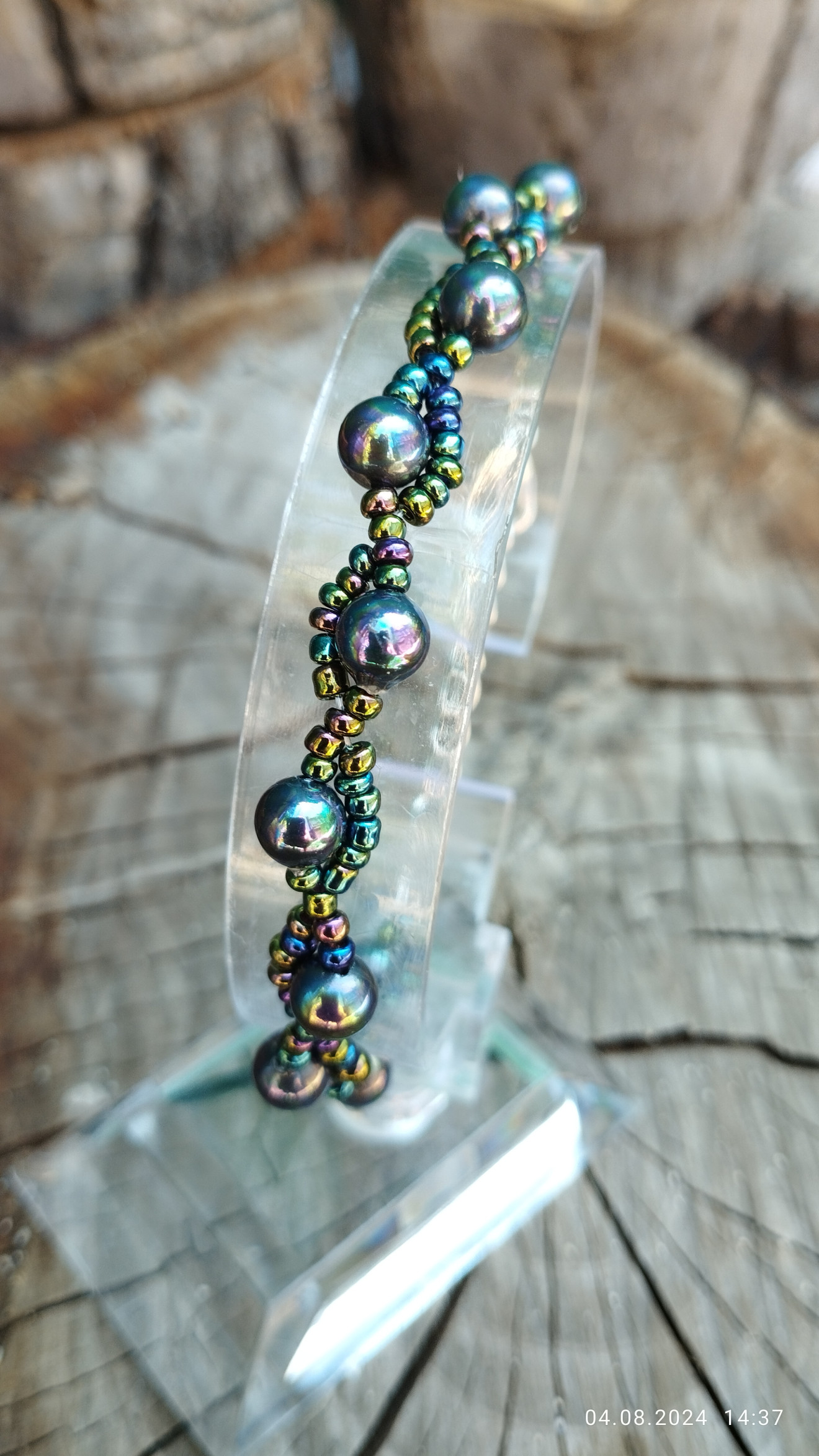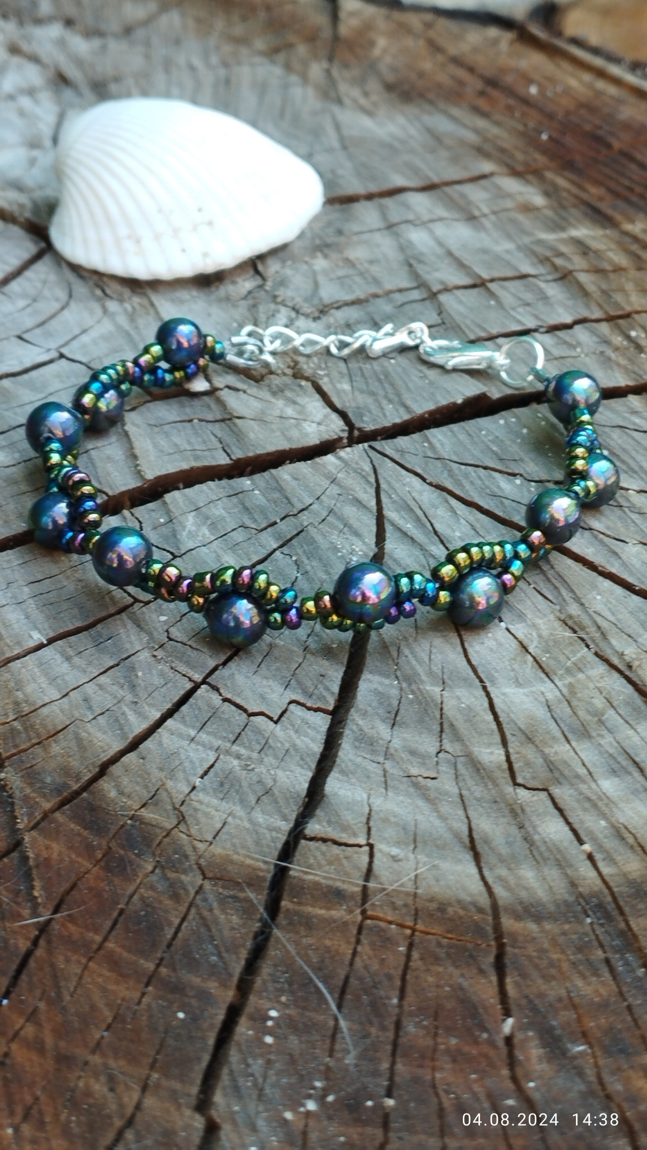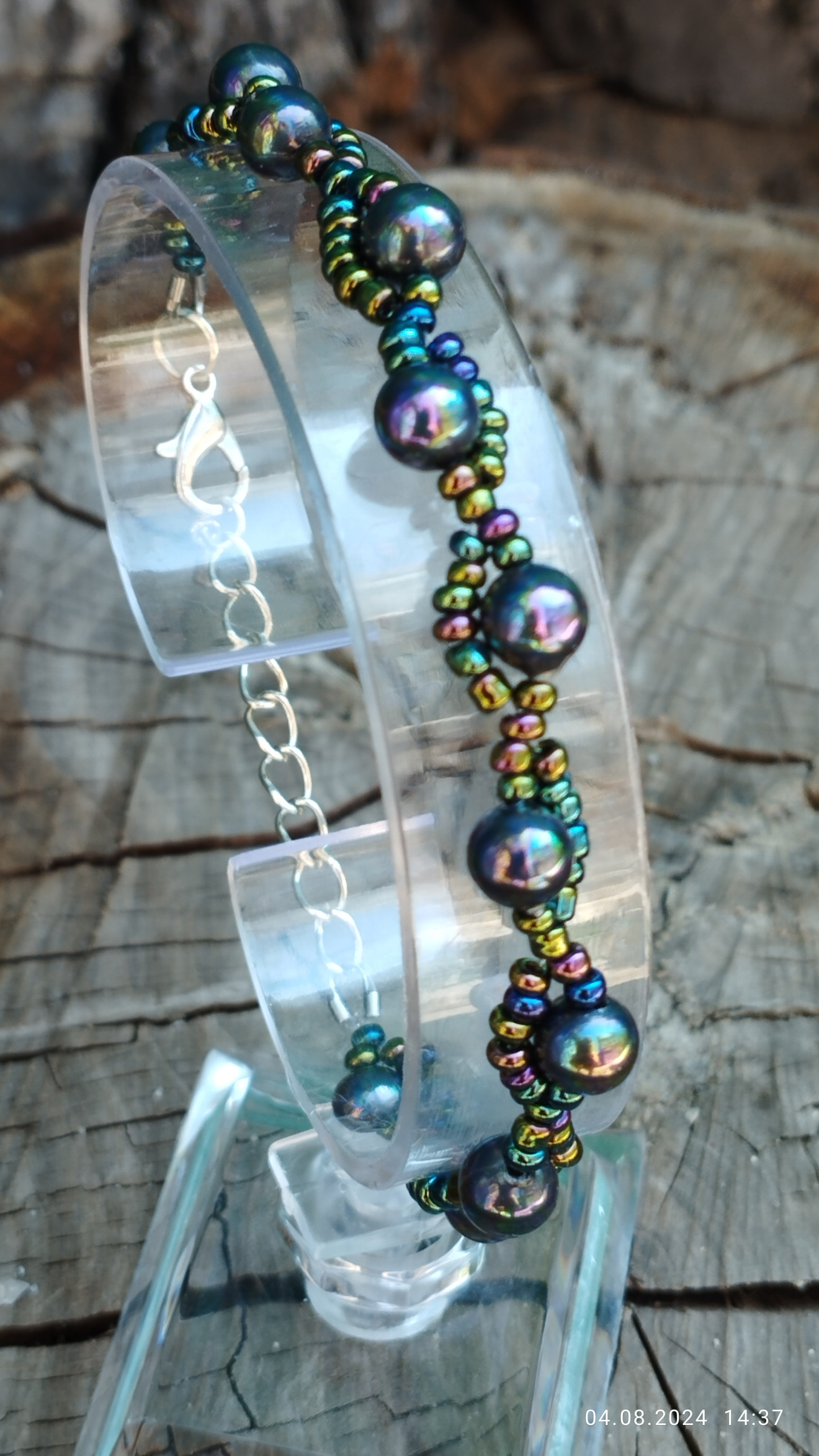 Гривната е изработена със седефени перли и стъклени мъниста в цвят хамелеон. Ширината се регулира. Може да бъде изработена и в други варианти.