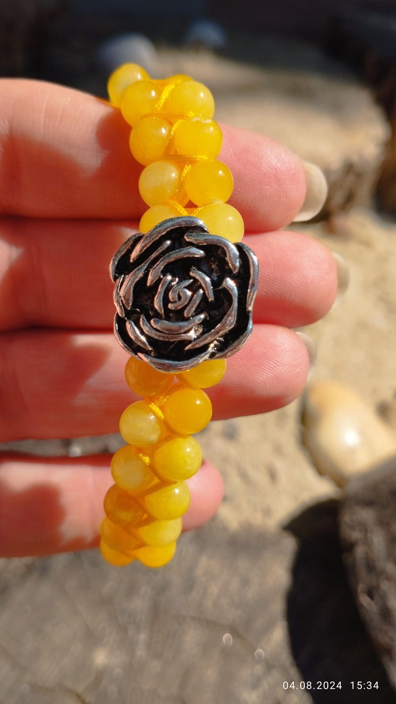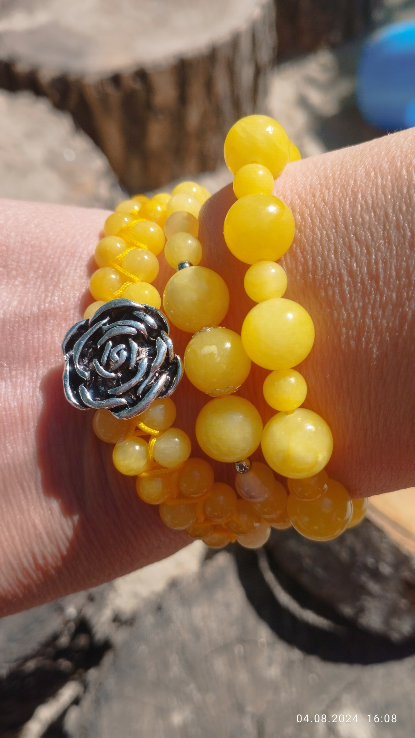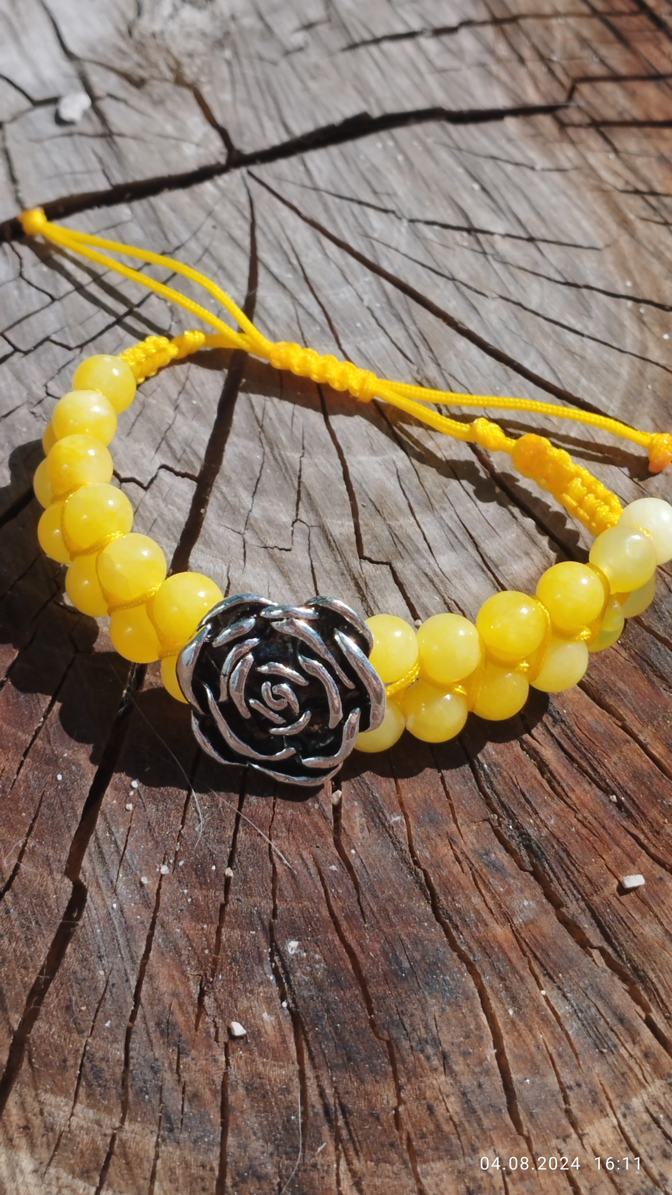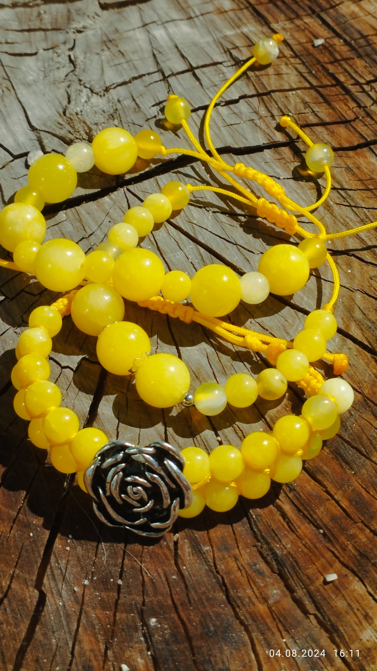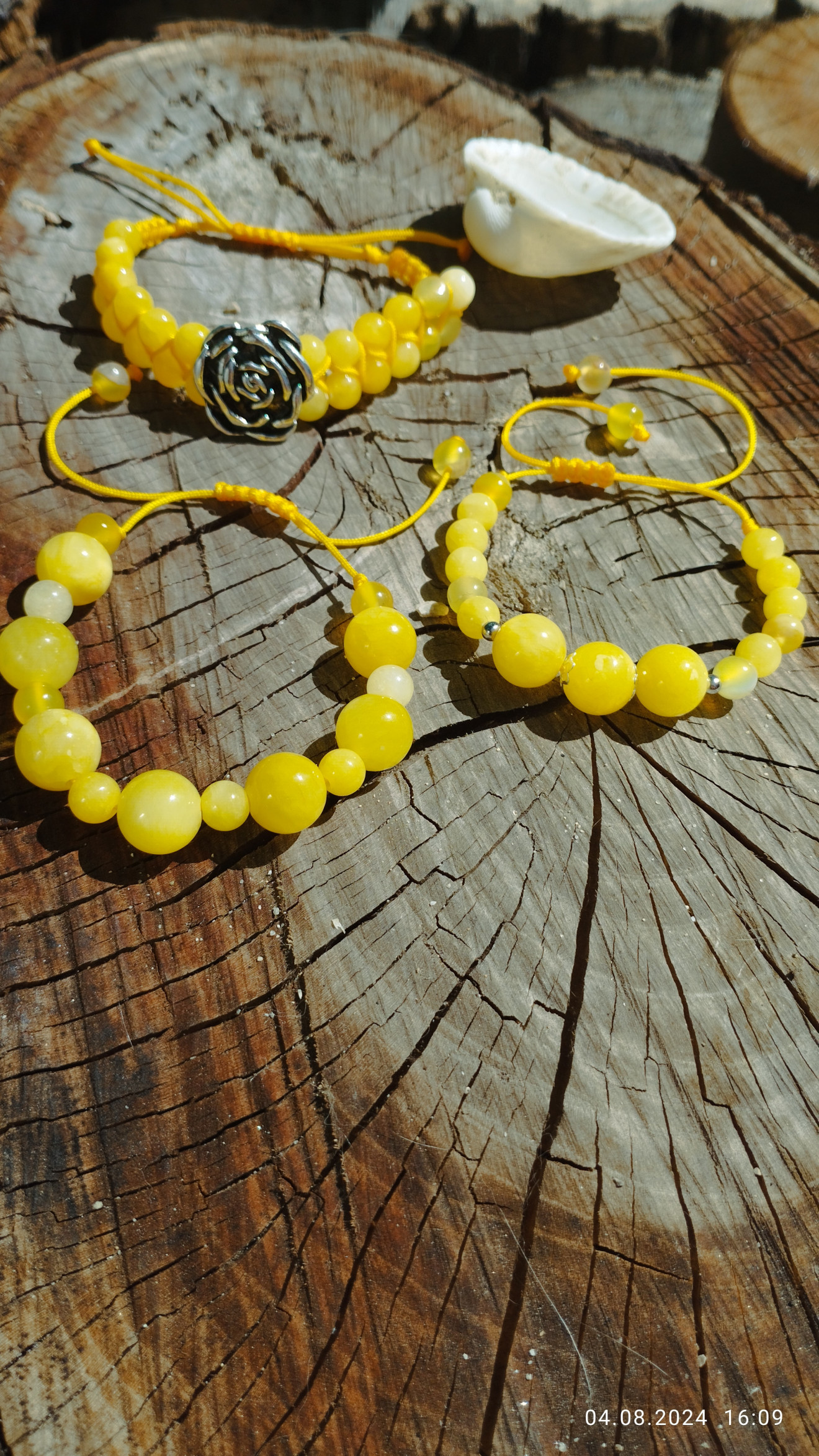 Трите гривни са изработени с естествени камъни и полиестерен конец в жълт цвят. Цената им в комплект е 45 лв. По отделно двете единични са по 15 лв., а тази с цветето - 25 лв.