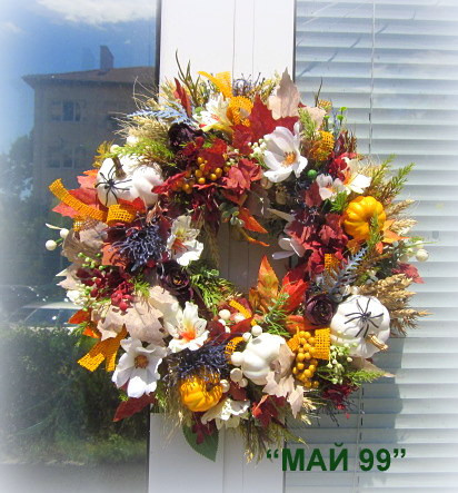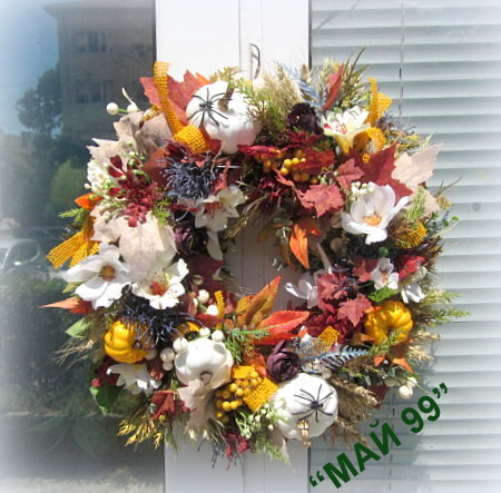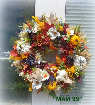Богат и пъстър венец ф 43 см.на основа слама ф 30 см. от изкуствени клони, цветя,листа и елементи в преливащи есенни багри,бели и жълти тиквички,панделки зебло! Уникален!