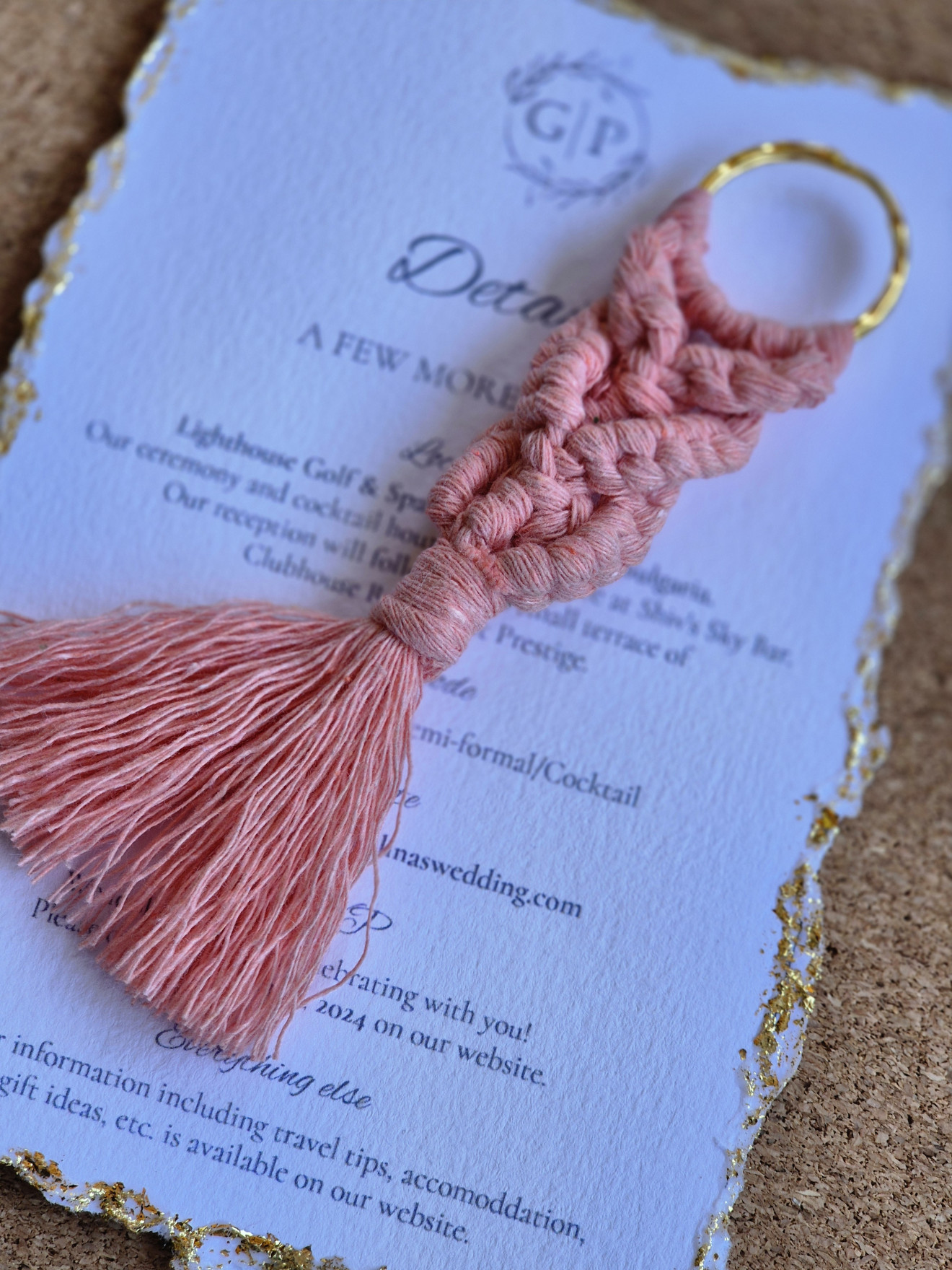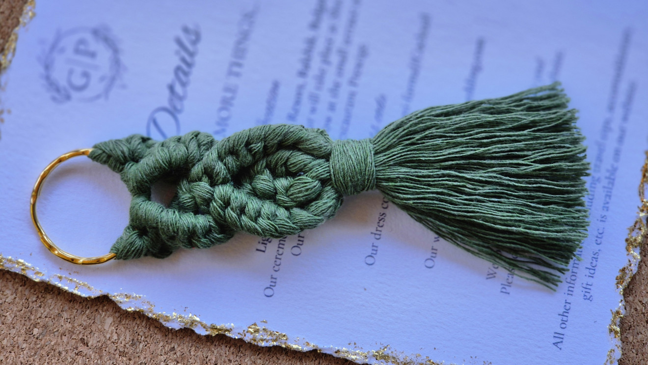 Ключодържател изработен с техниката макраме. Подходящ за подаръчета като спомен от сватби, кръщенета, юбилей. Могат да се изплетат в различни цветове. Дължина 10 см.