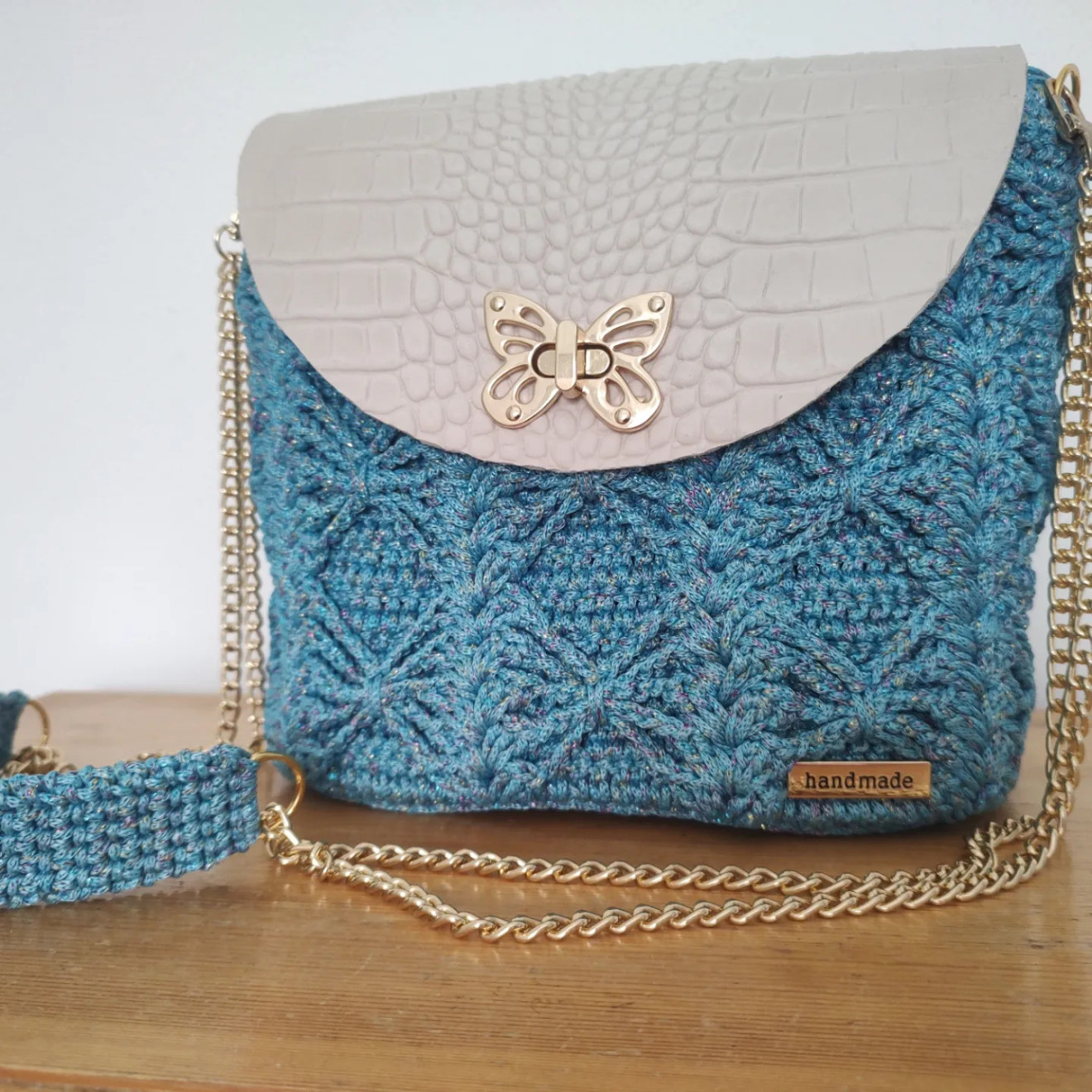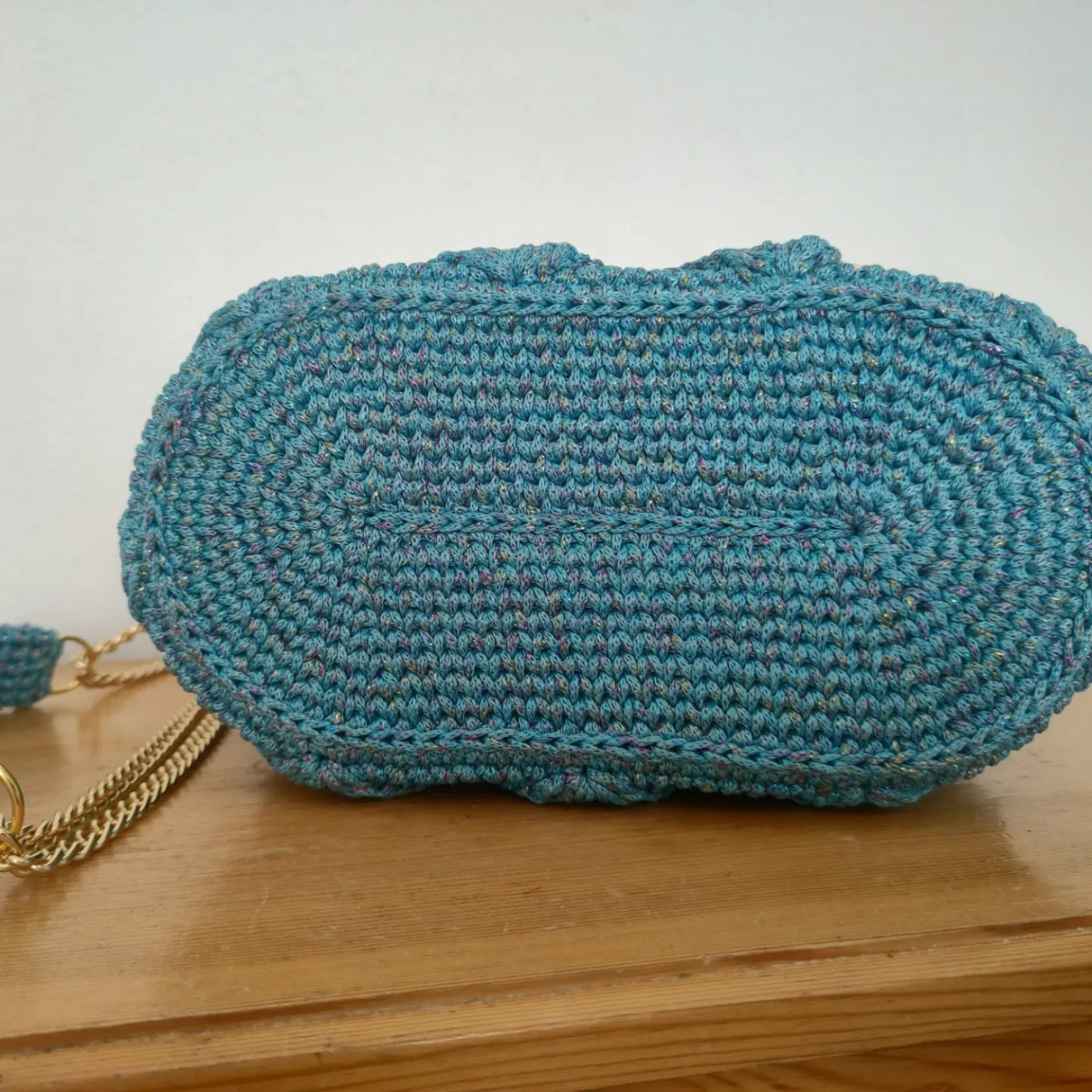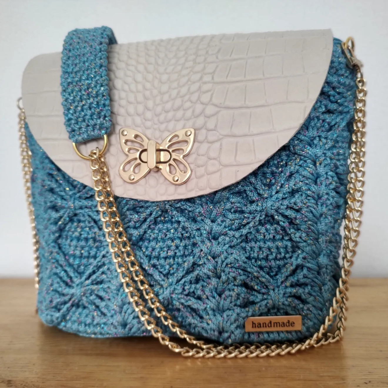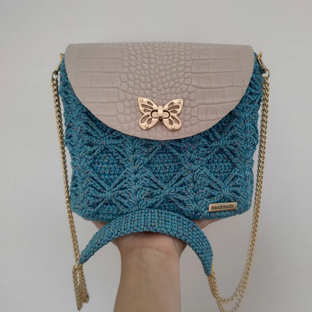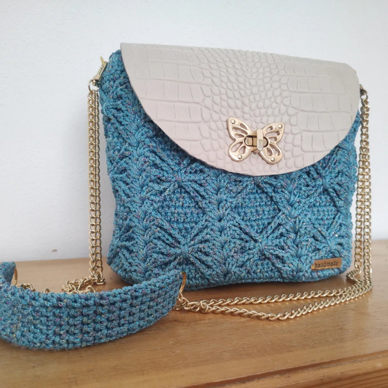Полиестерно макраме с цветно ламе в комбинация с капак от естествена кожа ( лично скроен) и метални елементи в златисто, дъното е плетено и подсилено . Дръжката през рамо е комбинация от синджир и плетиво Може да се изработи и в други цветови комбинации