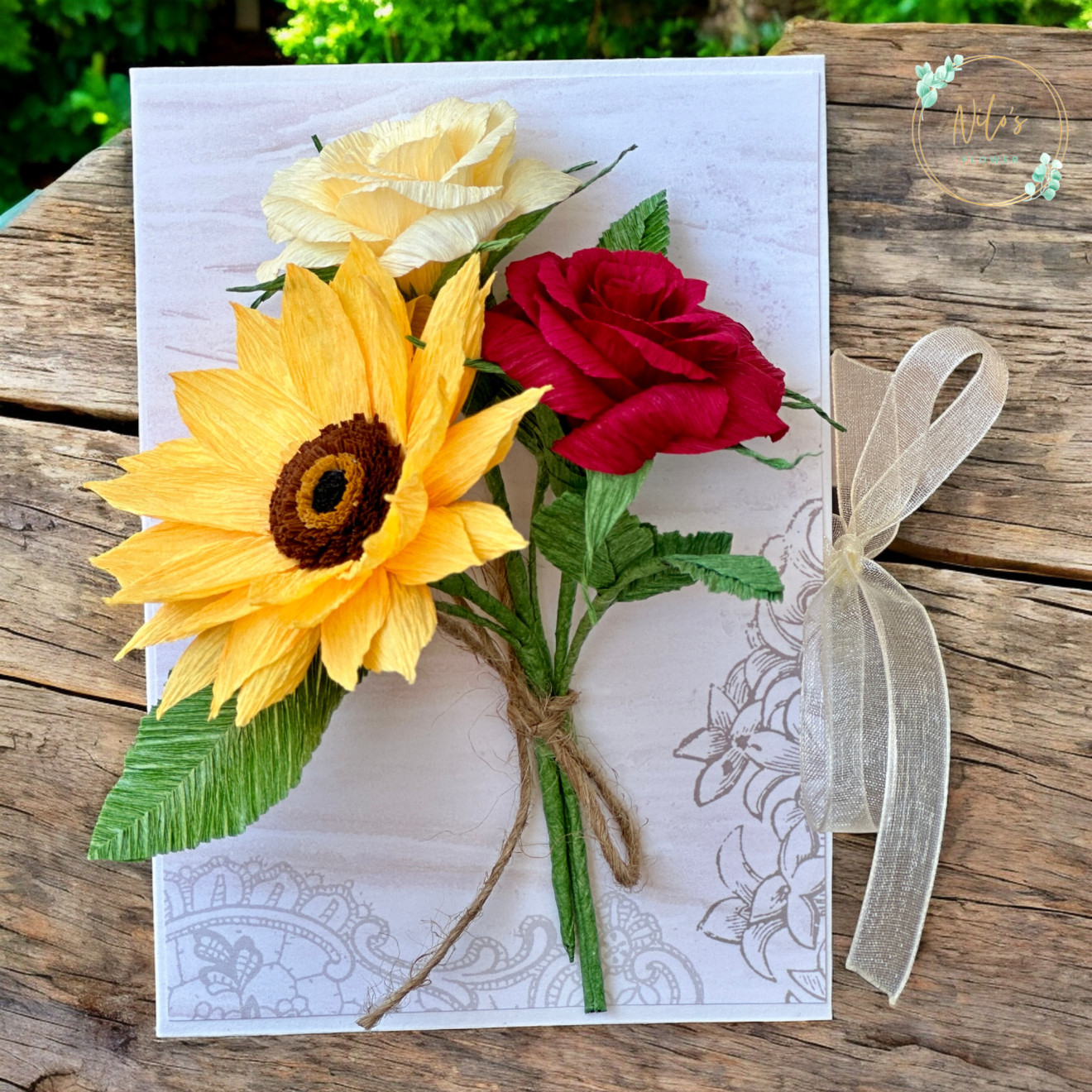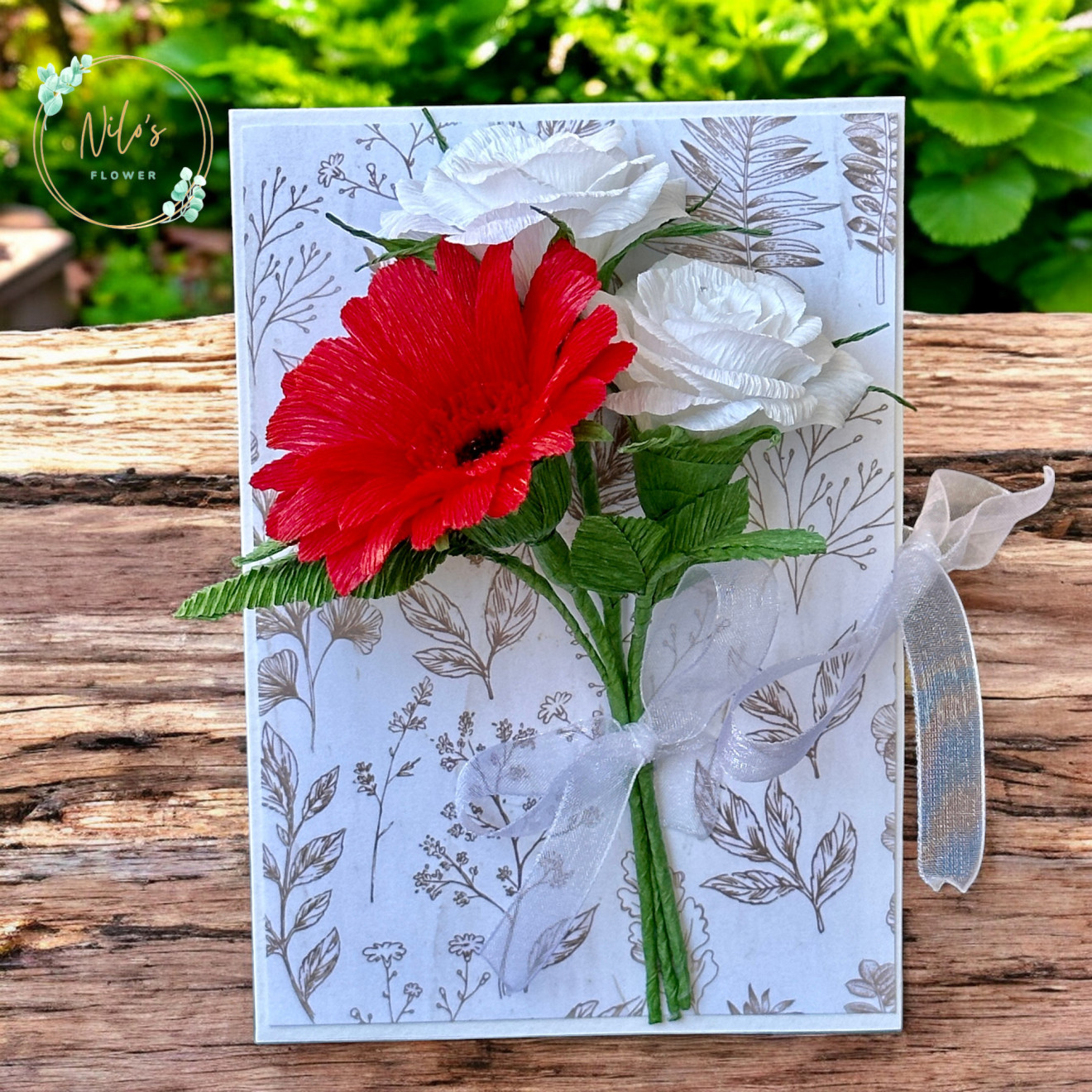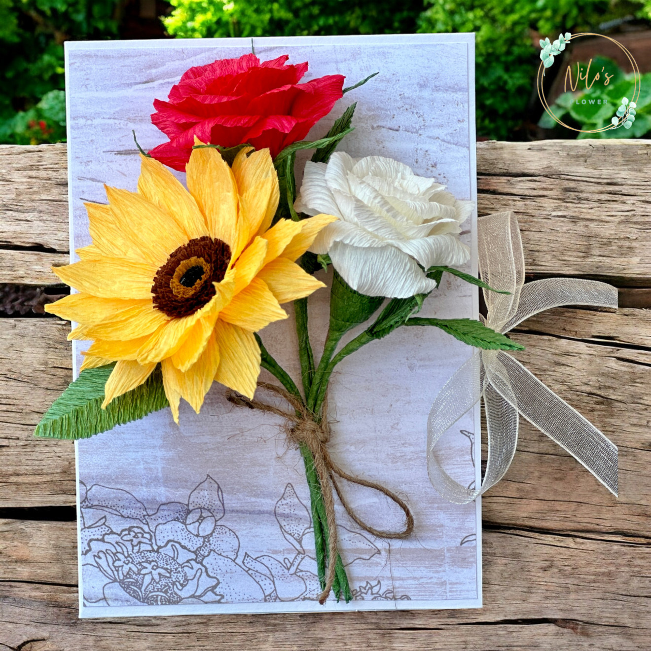 Картички с ръчно изработени цветя от креп хартия с размери около 10 х 15 см. Придружени са и от плик за паричен или друг малък подарък. Срокът за изработка може да е различен в зависимост от натовареността към момента на поръчката.
