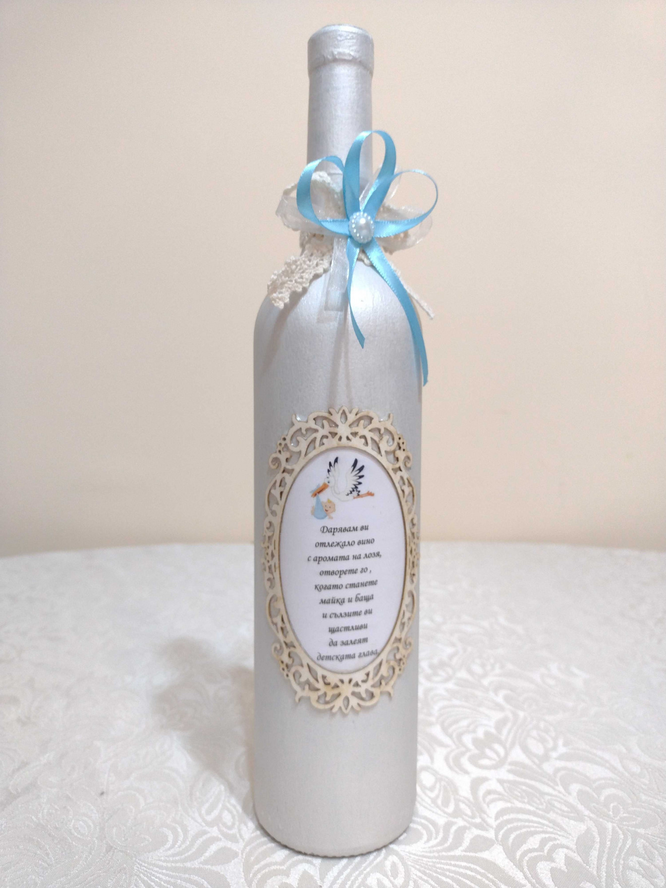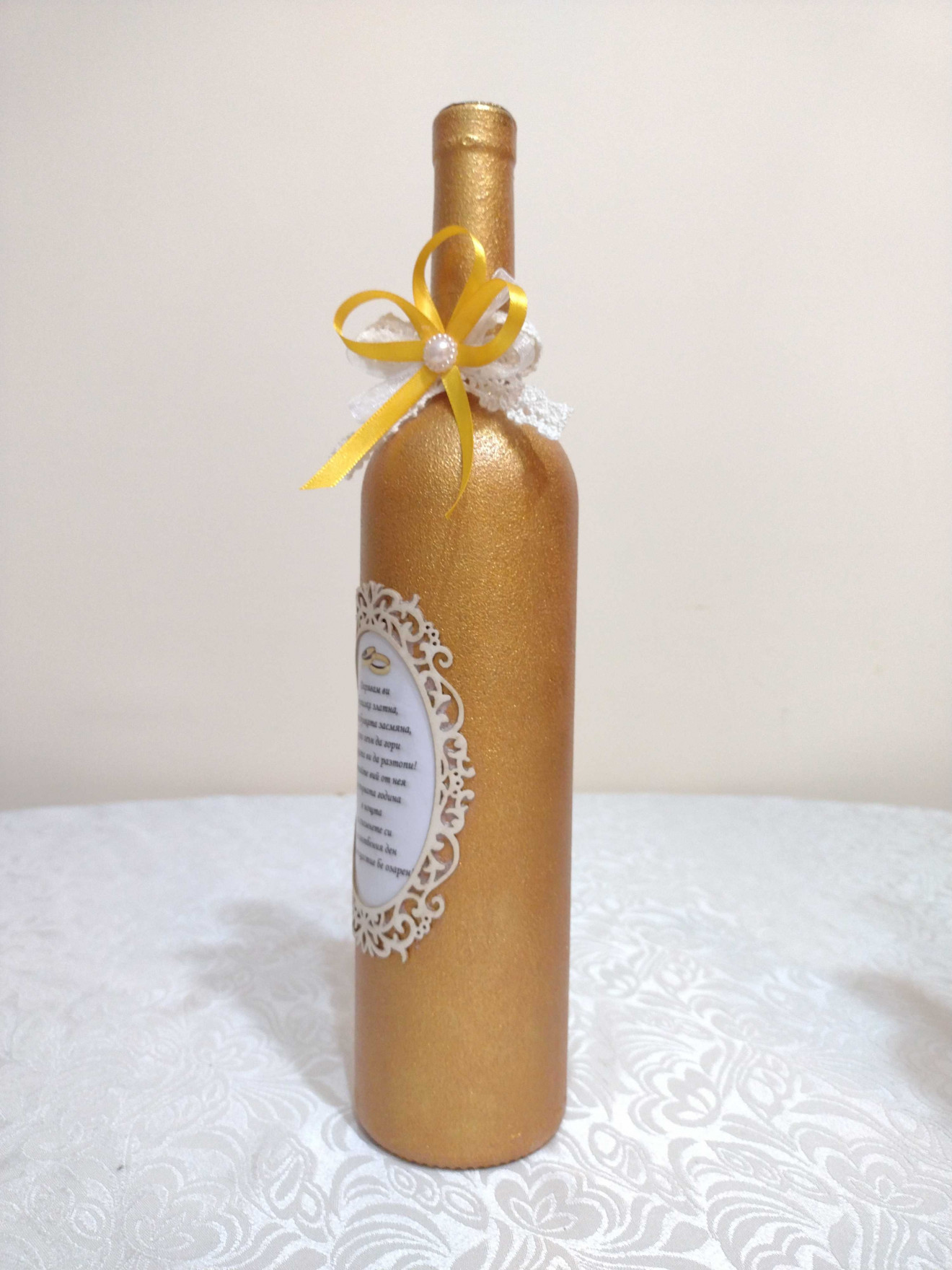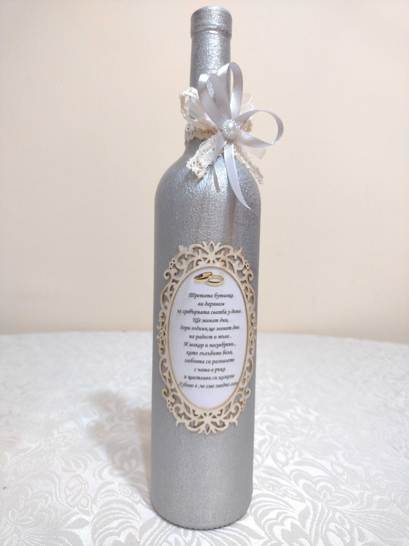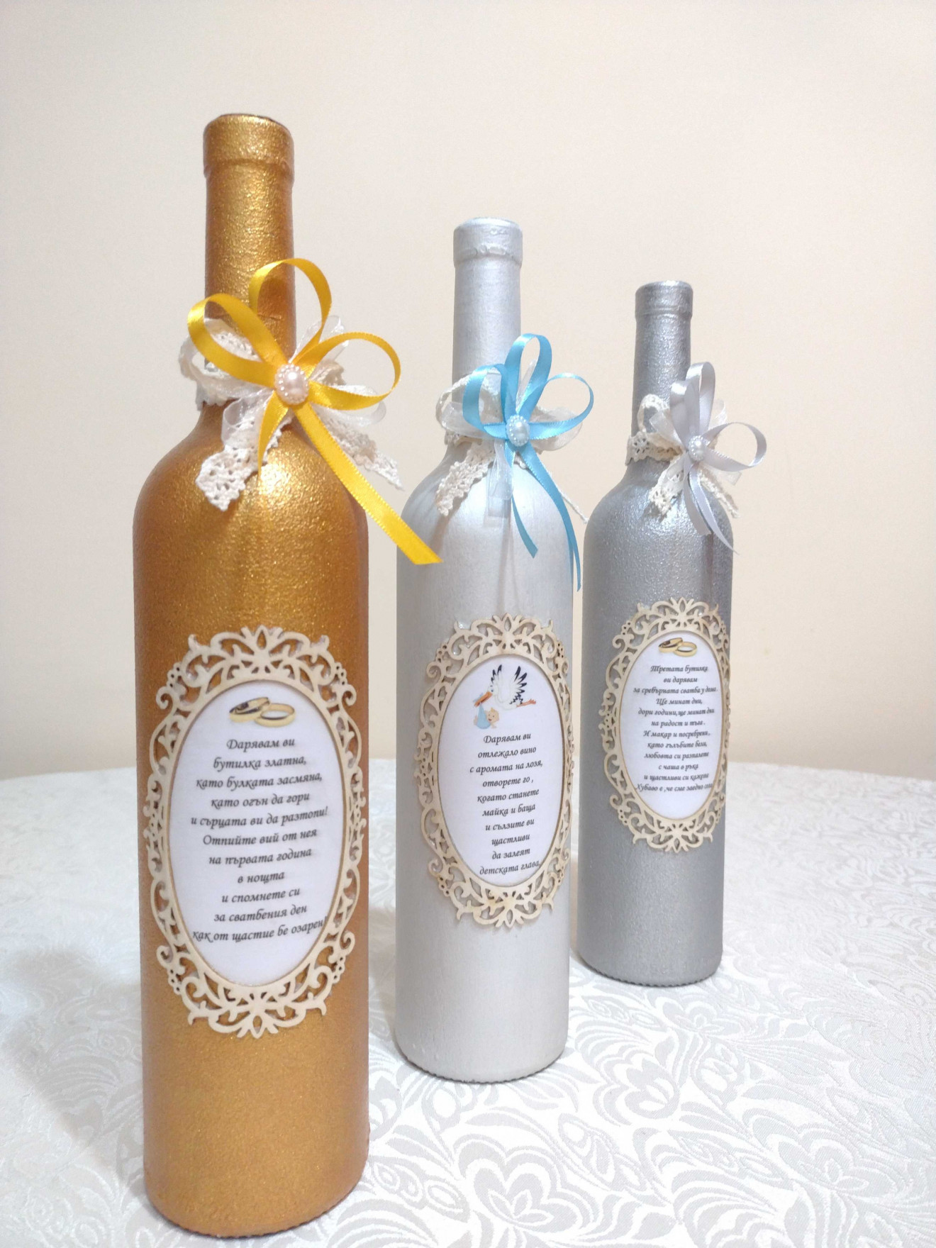 Сватбени бутилки за наричане.Ръчна изработка. За първата годишнина от сватбата.(злато) За първа рожба.(бяла) За сребърна годишнина от сватбата.(сребро) Изработват се по поръчка, като цветовете са по избор. Изработвам и по модел с ваша снимка. Време за изработка от 2 до 4 дни.