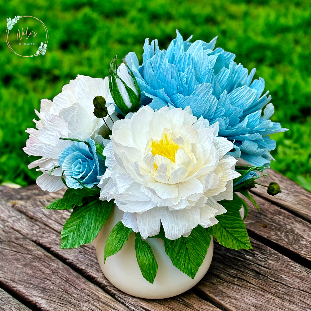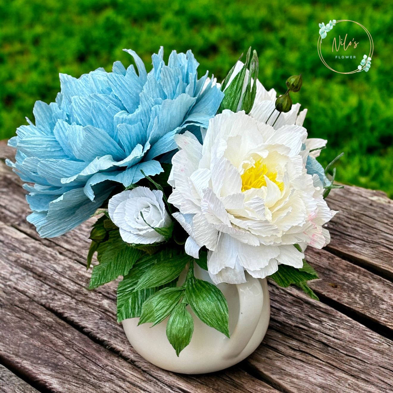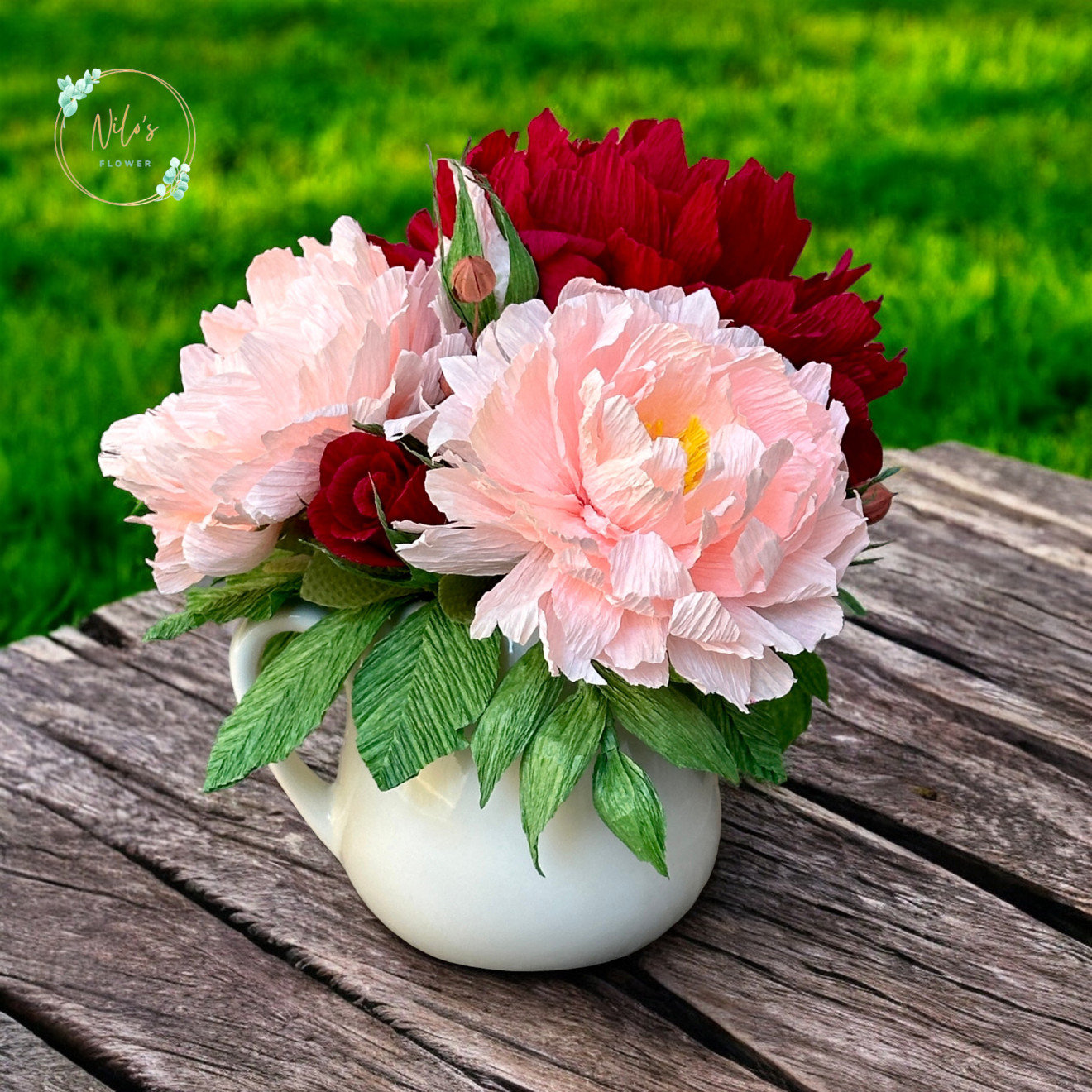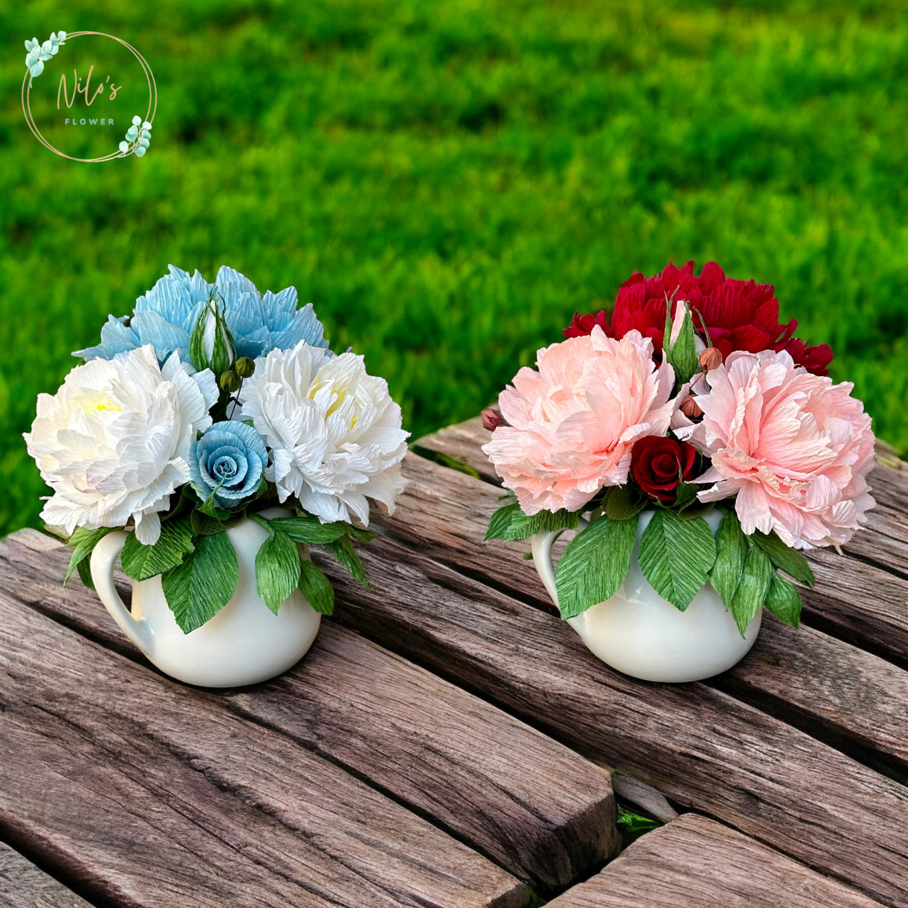 Аранжировките са с ръчно изработени цветя от креп хартия. Имат и допълнително лаково покритие на листата. Срокът за изработка зависи от натовареността към момента на поръчката.