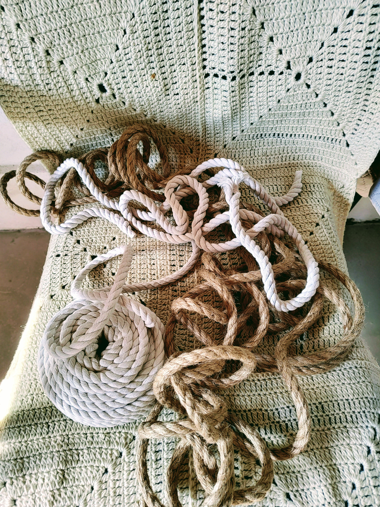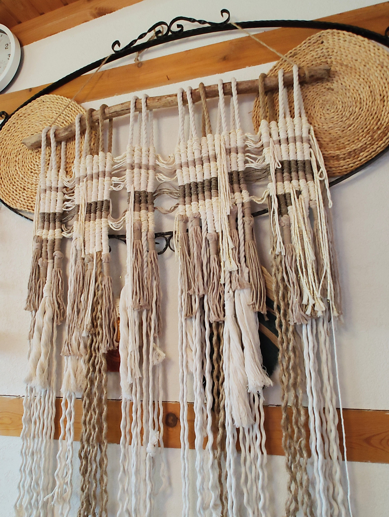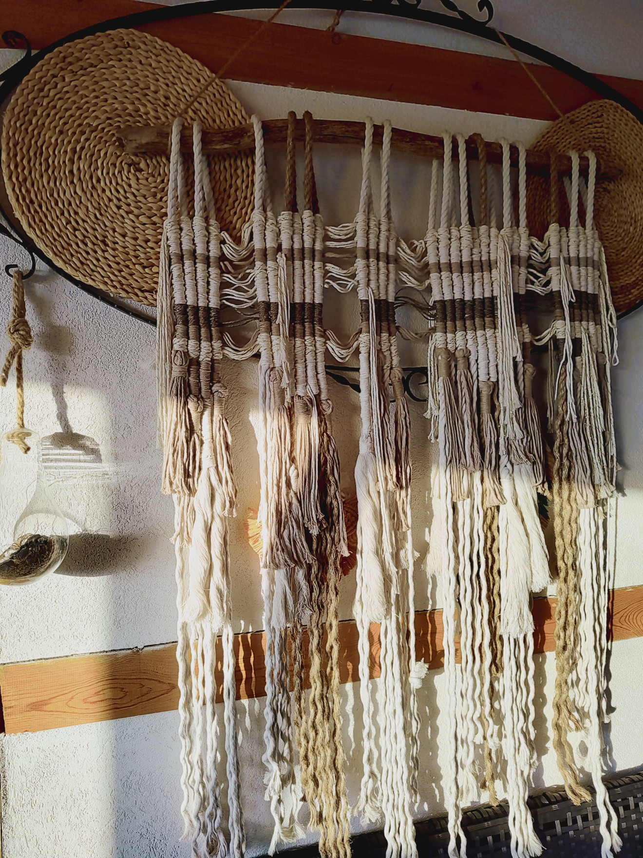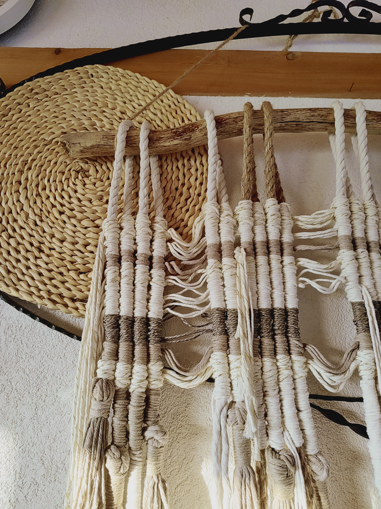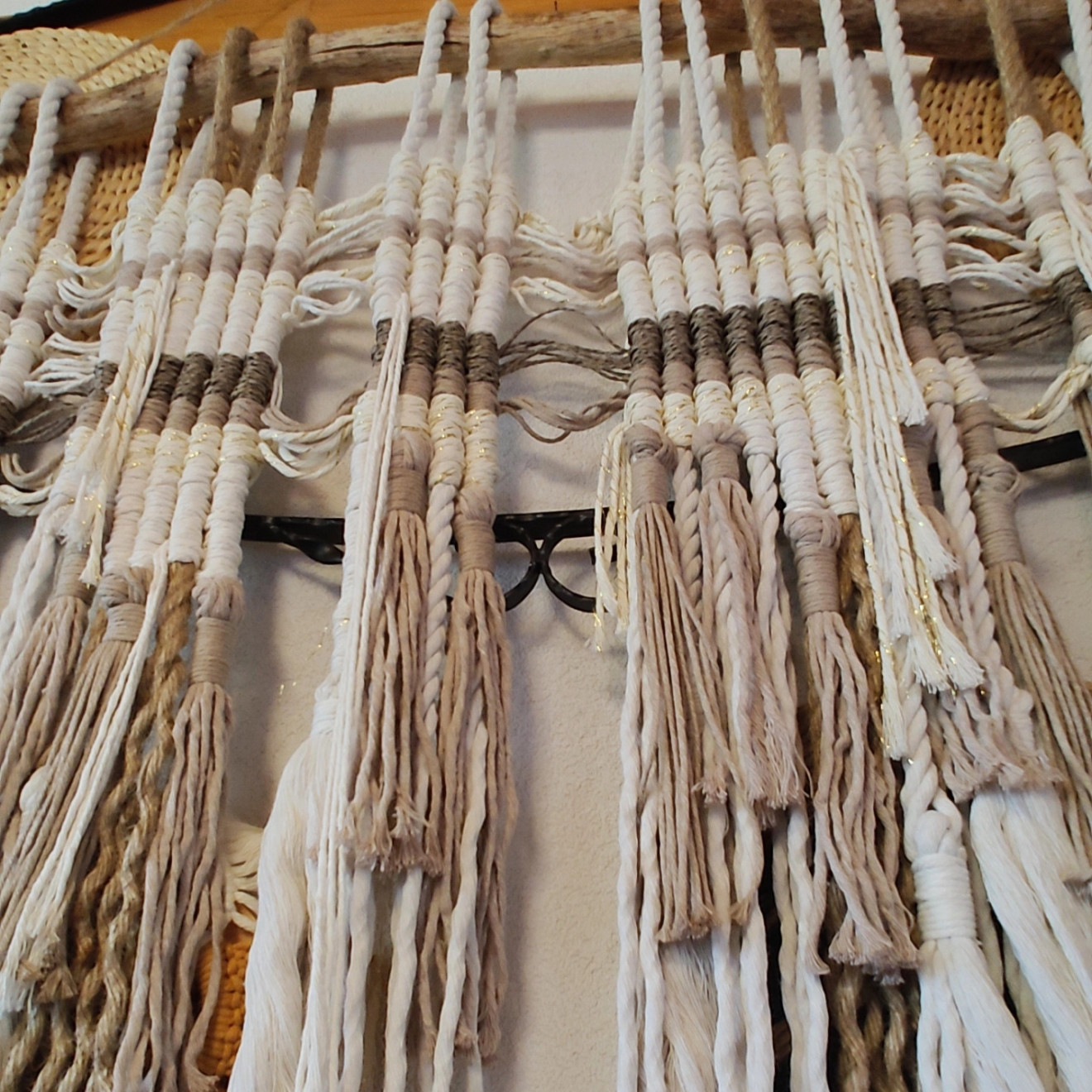 Артистично пано изработено от бели и канапени въжета,прежда макраме в бяло и златисти нишки. Меките земни тонове ще се впишат прекрасно във всеки интериор като акцент на стена.