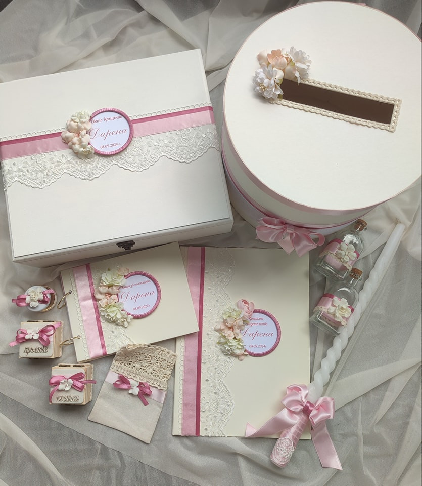 Комплектът се състои от : Голяма дървена кутия Папка за кръщелно свидетелство Книга за пожелания Торбичка за сапунче Бурканче за мед Шишенца за олио и светена вода Голяма свещ Кутийка за косичка Кутийка за кръстче Кутия за подаръци и картички **Всеки комплект може да съдържа каквото вие прецените. Изработвам го съобразено с желанията и изискванията ви