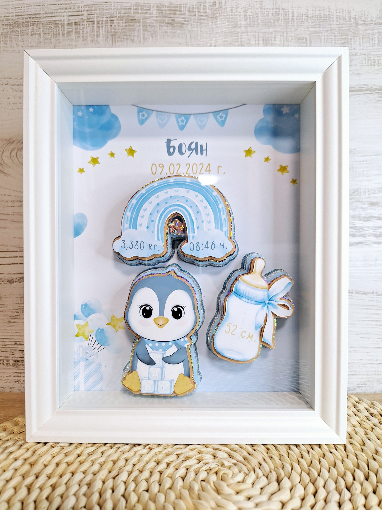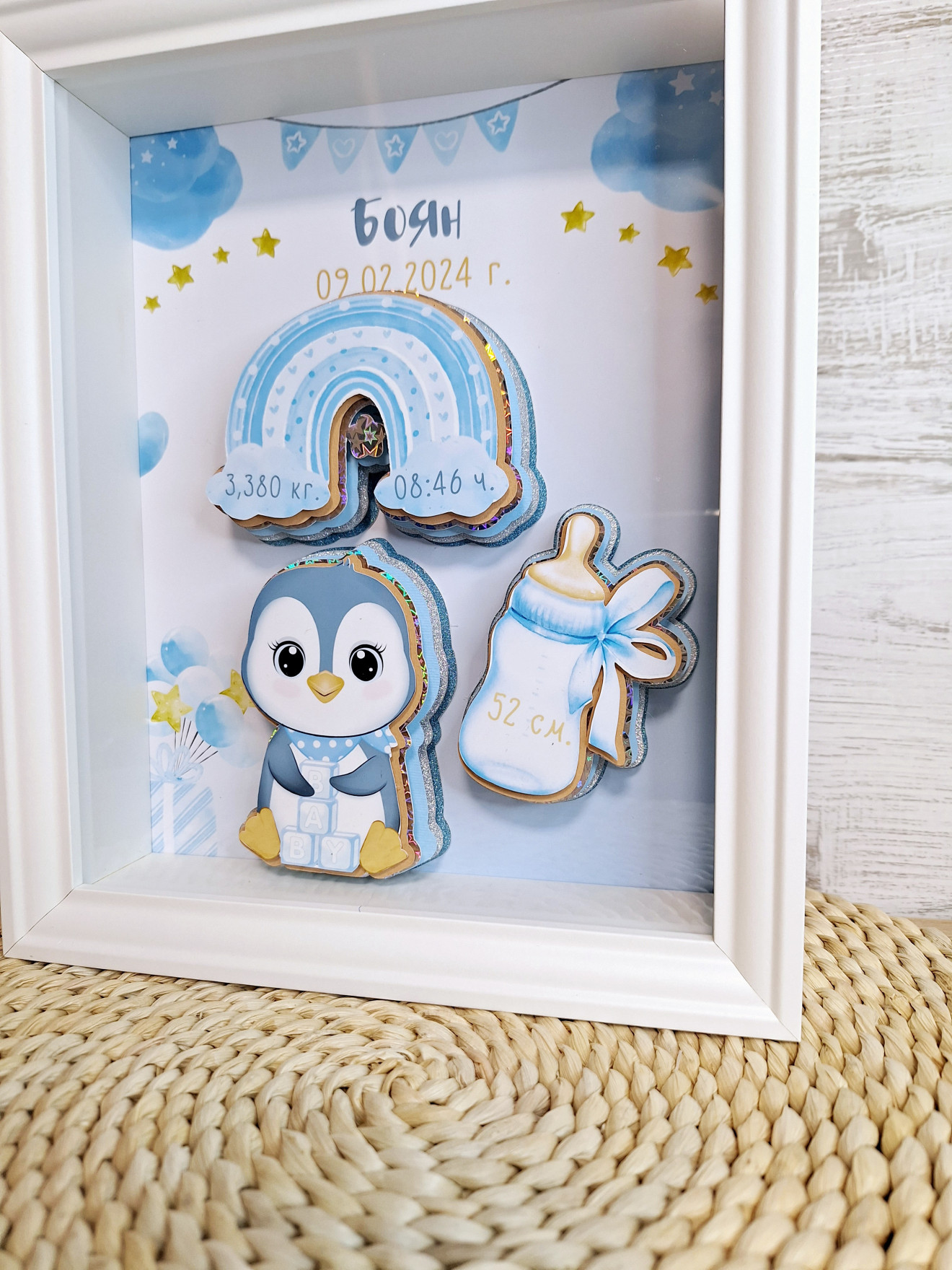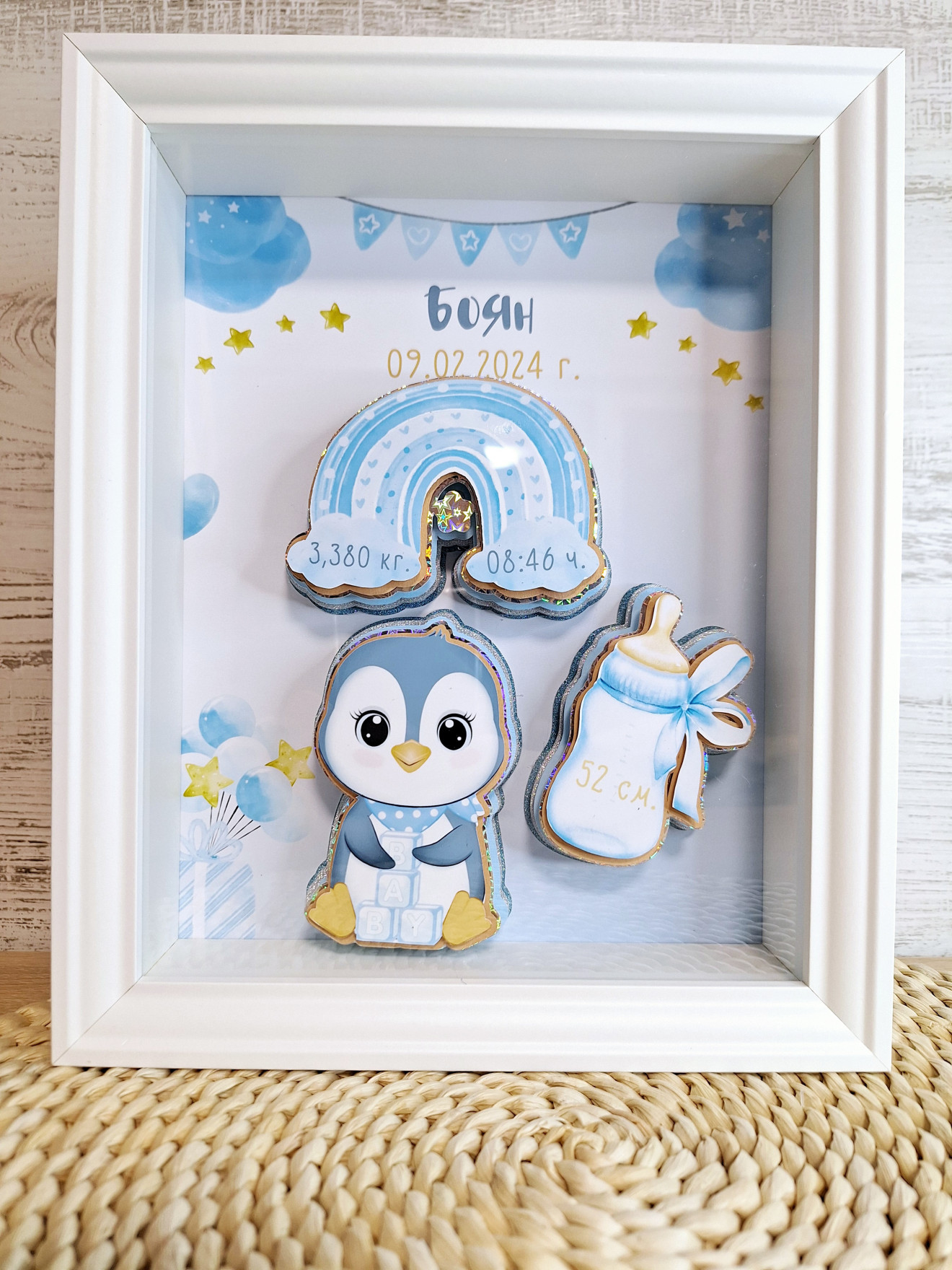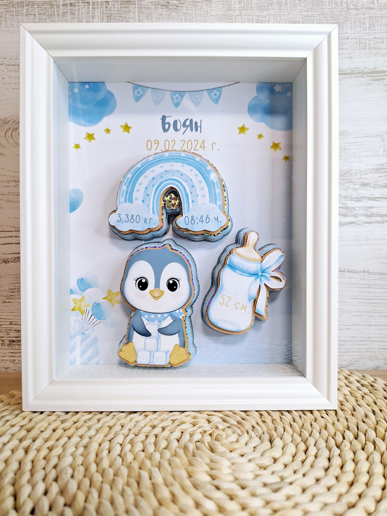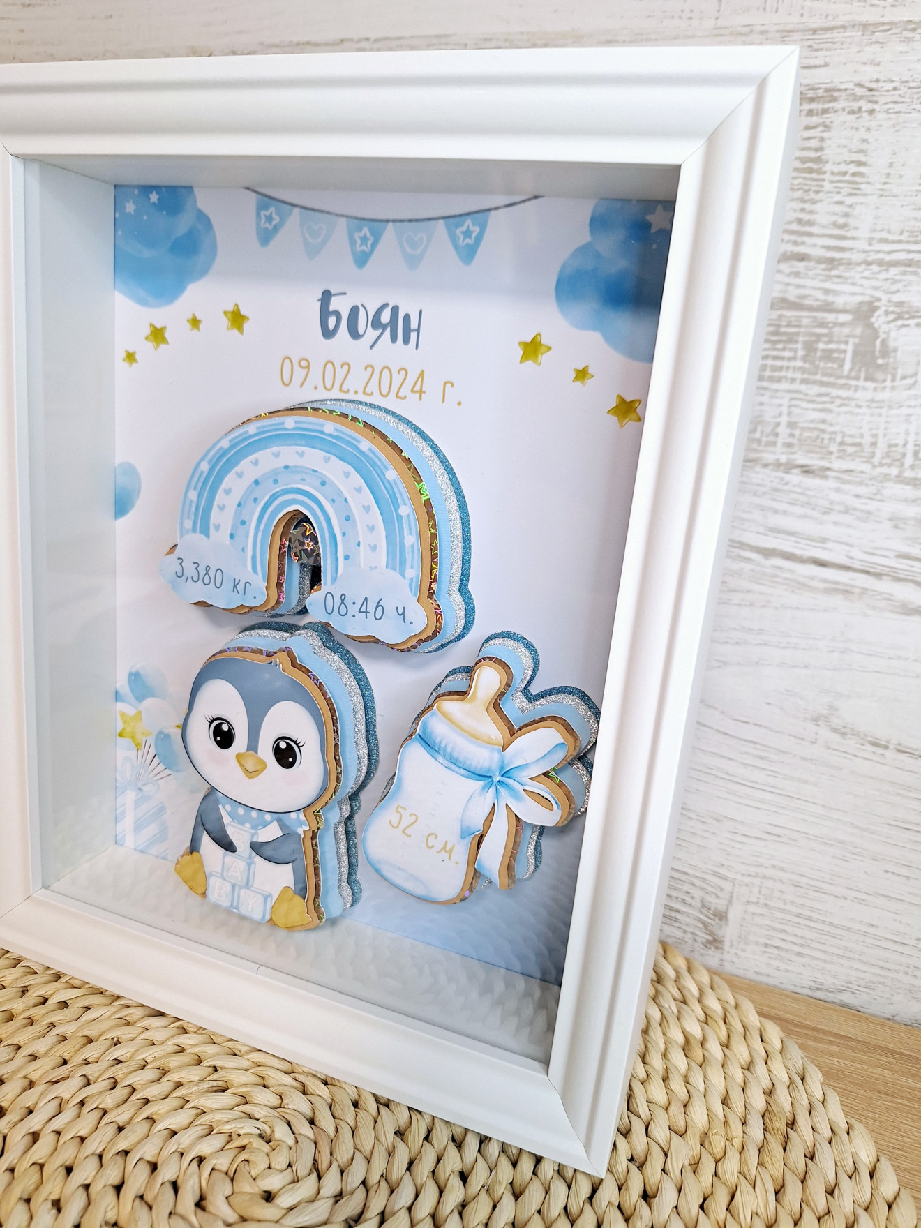 Тази рамка визитка е специален продукт, идеален за подарък за новородено. Рамката е изработена от висококачествен MDF материал и е декорирана с красиви 3D елементи от картон, които я правят уникална и стилна. ✧ Материал: MDF с 3D картонени елементи ✧ Декорации: Биберон със сантиметри, дъга с час и килограми, сладко пингвинче ✧ Цветова гама: Жълт релефен картон, сив металиков картон, син релефен картон, сив и син блестящ картон ✧ 3D Ефект: Повдигнати картонени слоеве за триизмерна визия ✧ Дизайн: Принт в синьо и оранжево, с името и датата на раждане на бебето Тази уникална рамка визитка ще внесе радост и специален спомен за всеки, който я притежава. Защо да изберете този продукт? Той съчетава стил, качество и персонализация, което го прави идеален подарък за новородено. Подходящ е за родители, баби и дядовци, роднини, приятели на семейството, както и за любители на ръчно изработени декорации. Подходящ за: Родители на новородени Баби и дядовци, лели и чичовци Близки приятели на семейството Любители на ръчно изработени продукти Организатори на специални събития С този уникален подарък ще запечатате един от най-красивите моменти в живота на едно семейство – раждането на нов член!