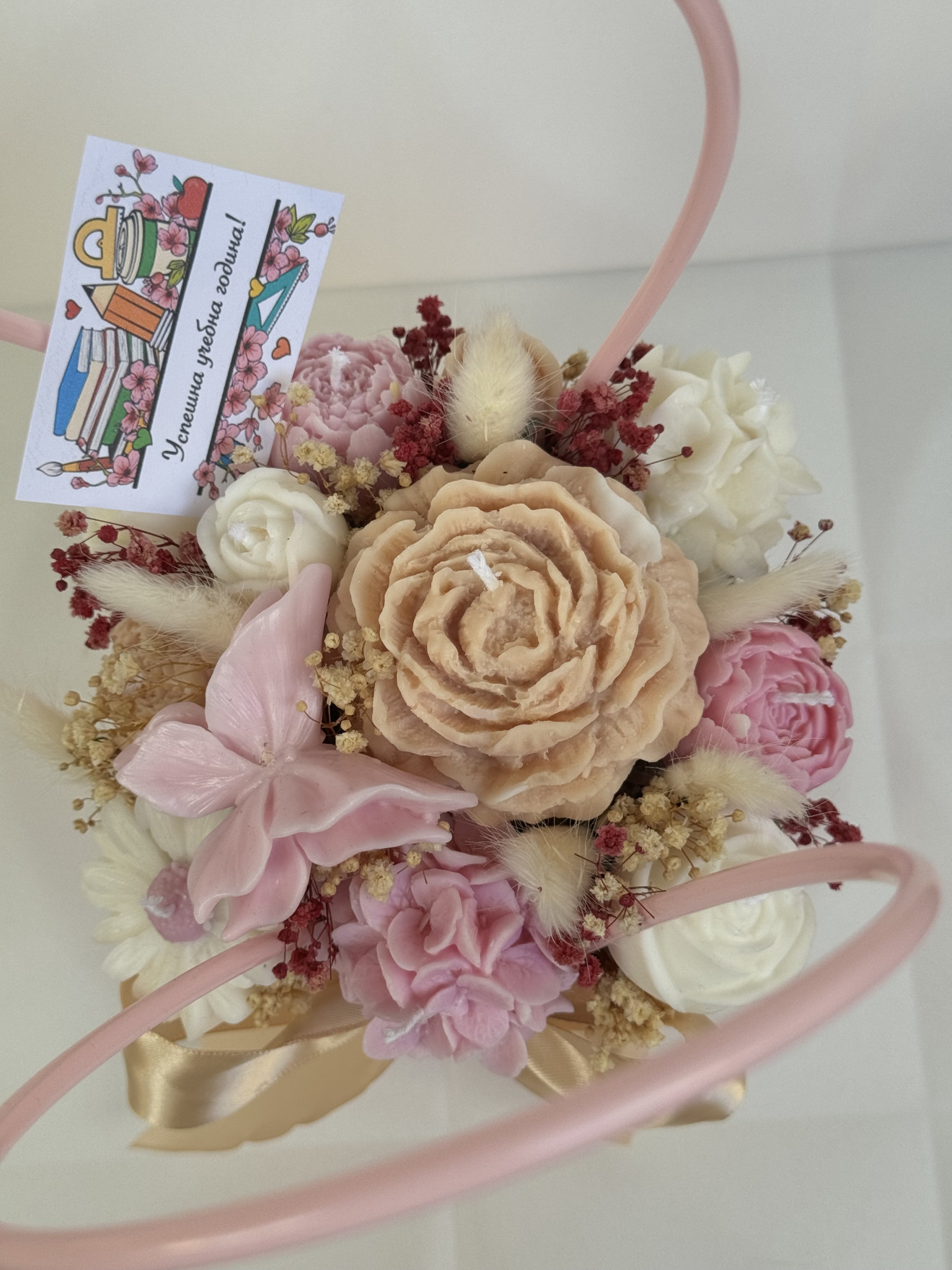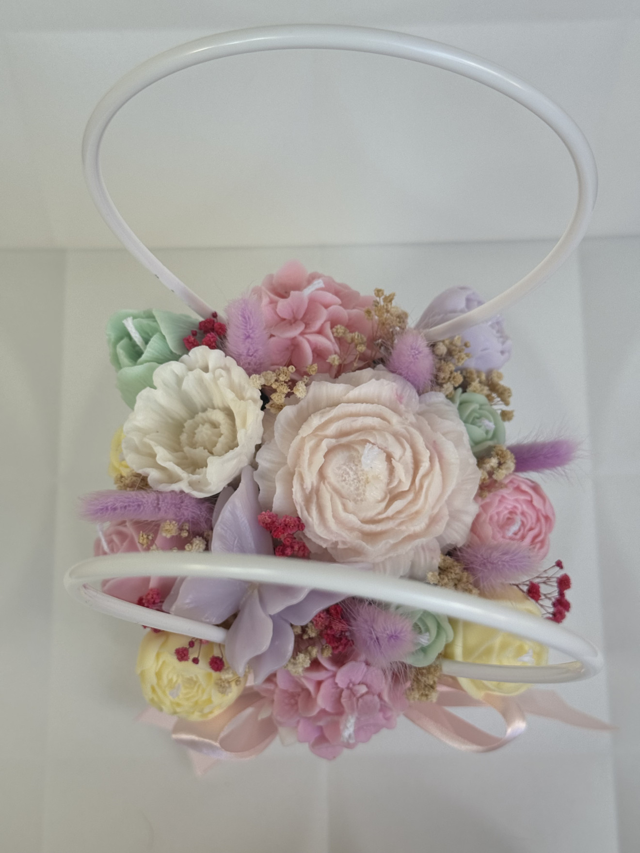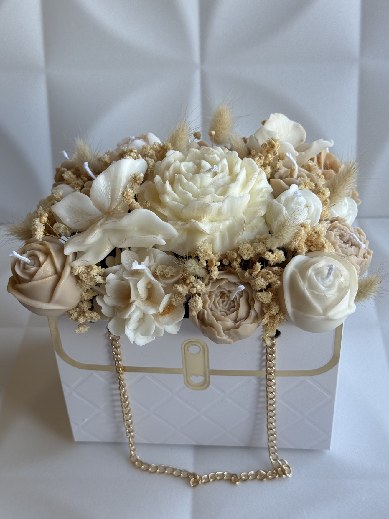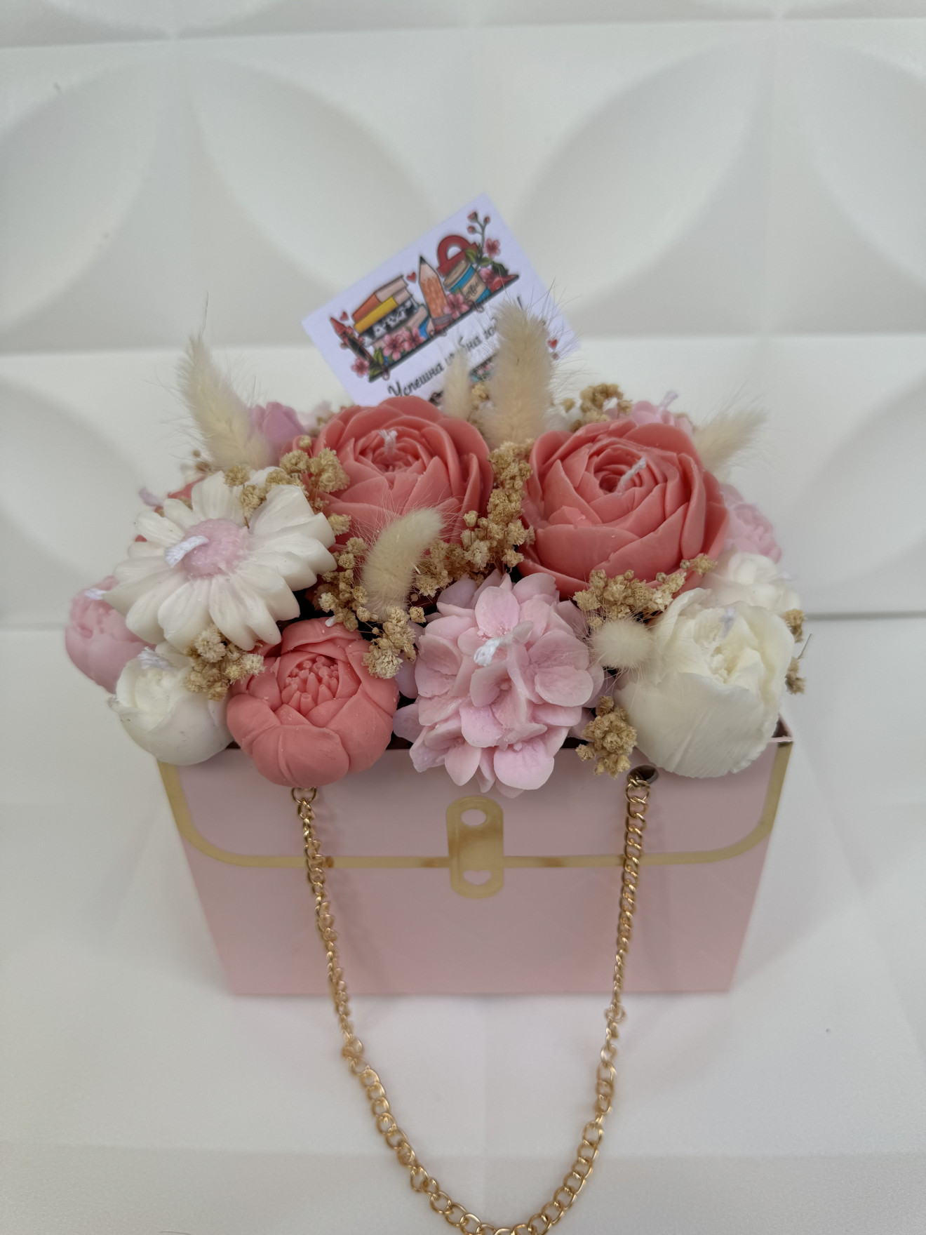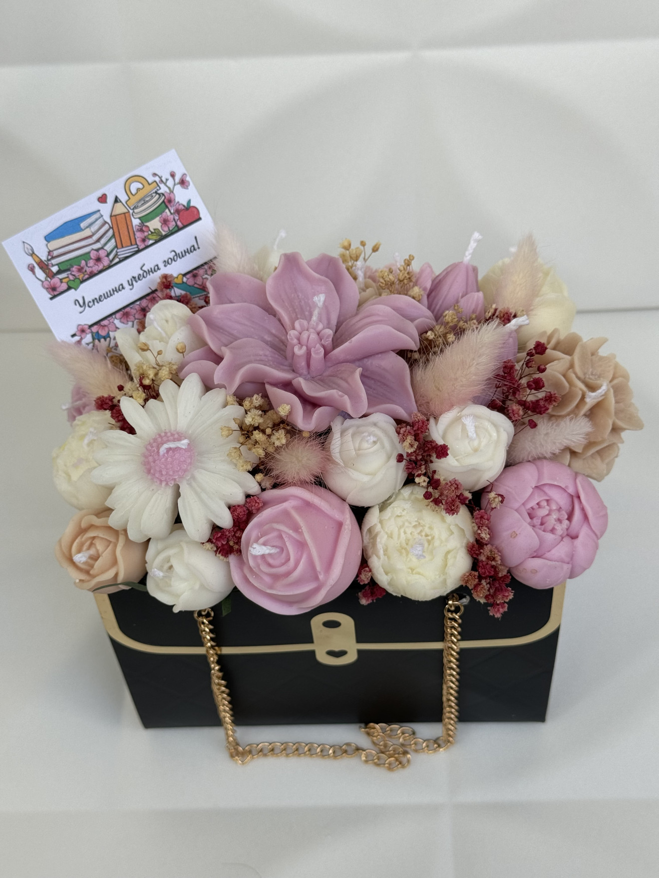 Букет от ръчно изработени ароматни соеви свещи под формата на цветя, ухаещ невероятно. Предимствата да изберете от нашите букети са на първо място са изработени от 100% екологично чист соев восък, вечен неувяхващ букет, дълготраен аромат ароматизиращ помещението където се намира, различен, и в същото време може и да се използва всяка една свещ след отделянето и от букета.