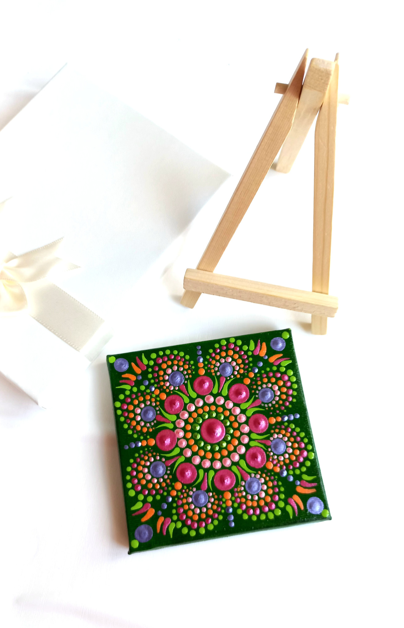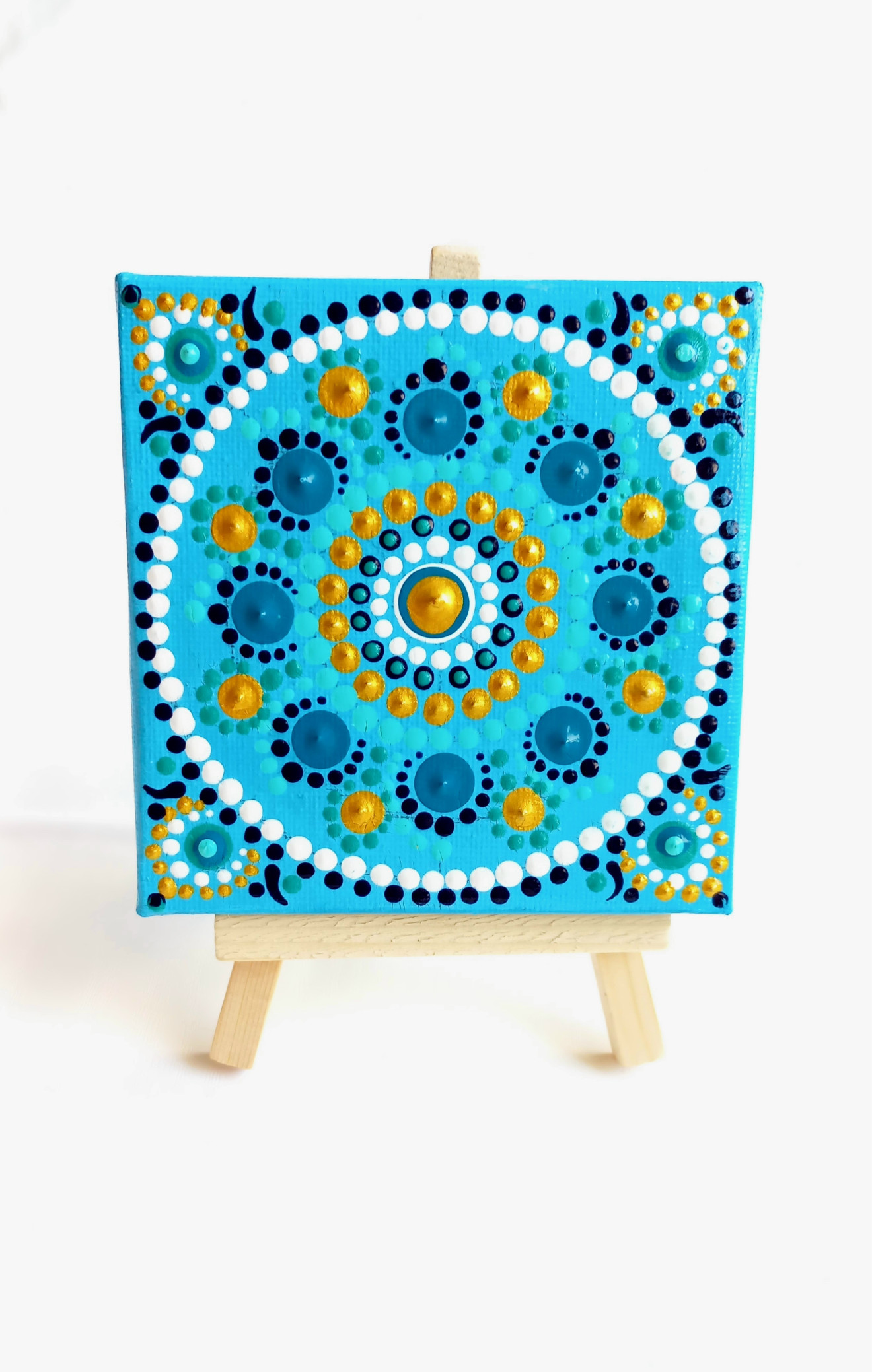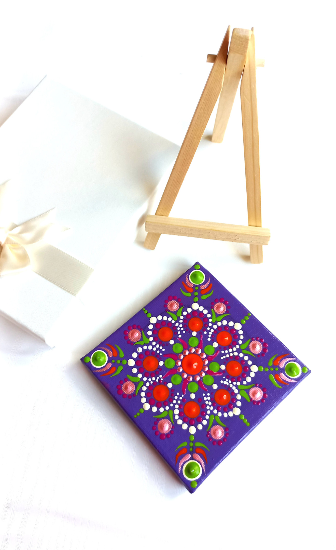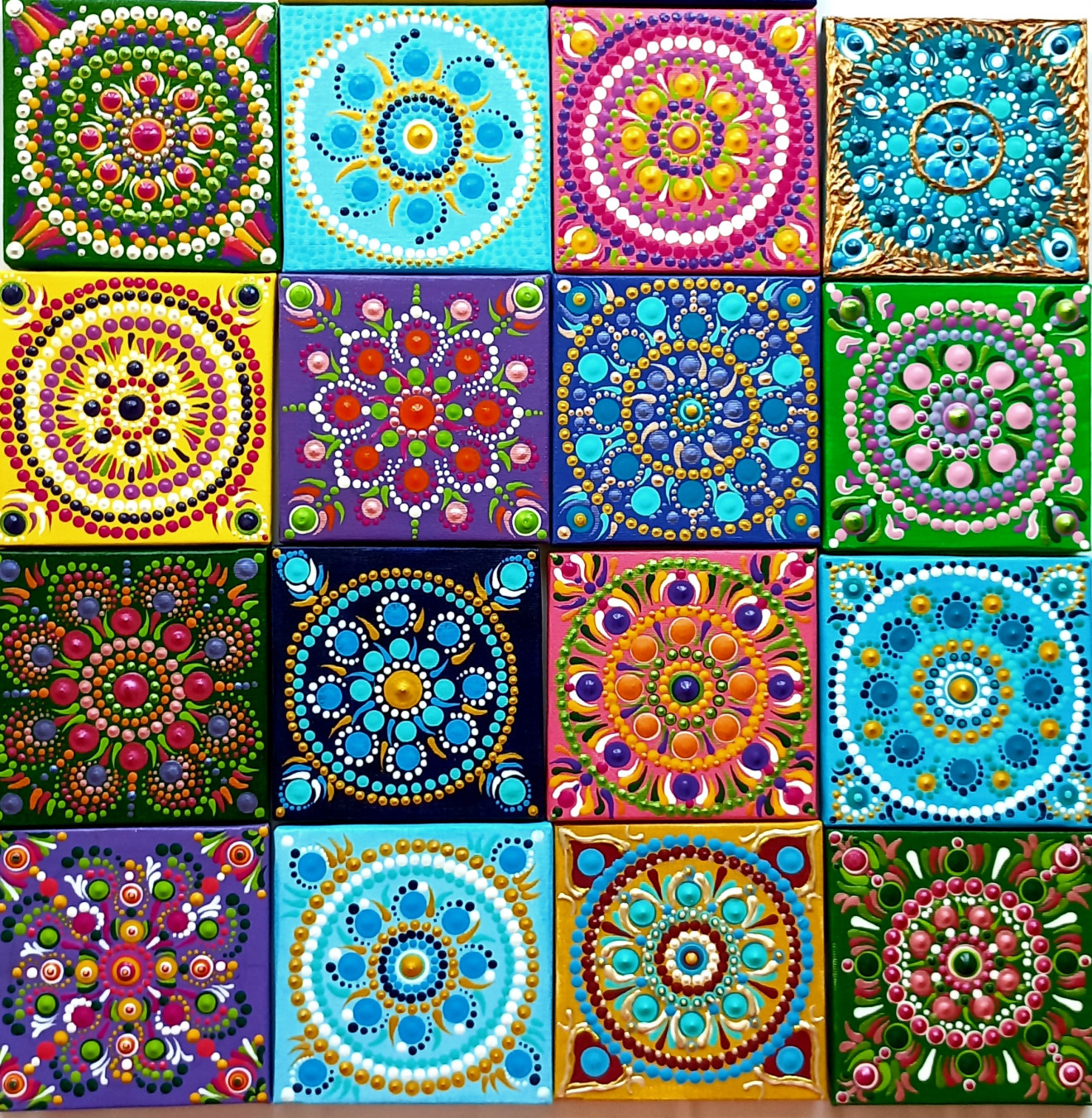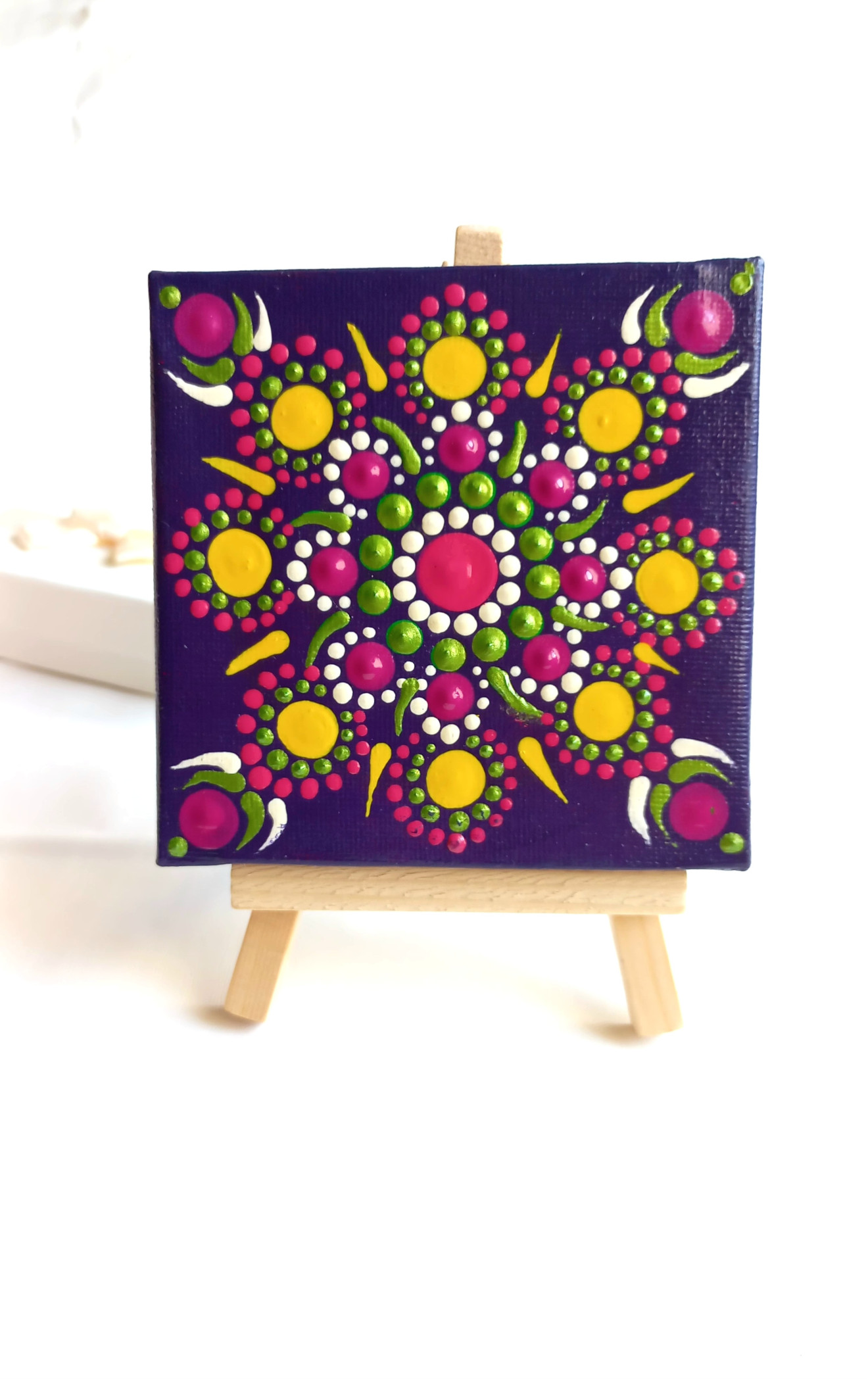 Мандали, рисувани ръчно върху пано на рамка с размери 10/10 см. Всяка мандалка е в комплект с мини статив. Цената на една мандала е 45 лв., без включена доставка. При интерес, пишете ни на лично съобщение.