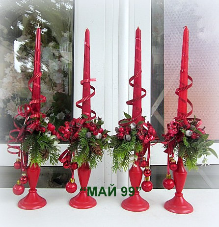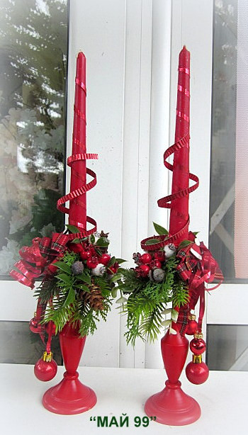 Дървен,червен,коледен свещник с коледна декорация с височина 45 см. Класически вариант за красива Коледа!