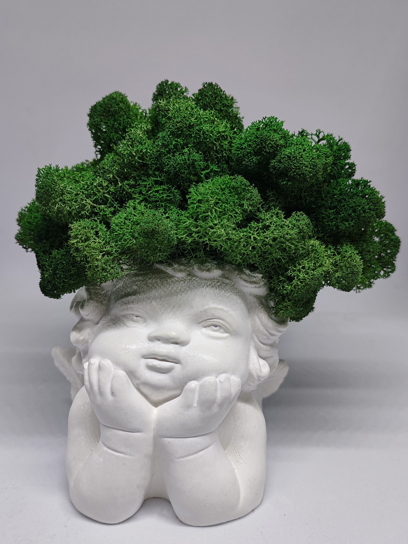 Подходящ като подарък за рожден ден, подарък за имен ден, подарък за юбилей, коледен подарък. Кашпа ангелче със скандинавски мъх – перфектен избор за стилен и уникален подарък! Тази красива кашпа, украсена със зелен скандинавски мъх, съчетава естетика и природа в едно. Елегантното ангелче придава усещане за спокойствие и хармония, докато свежият мъх внася естествено очарование във всяко помещение. Размер: 16х12см.