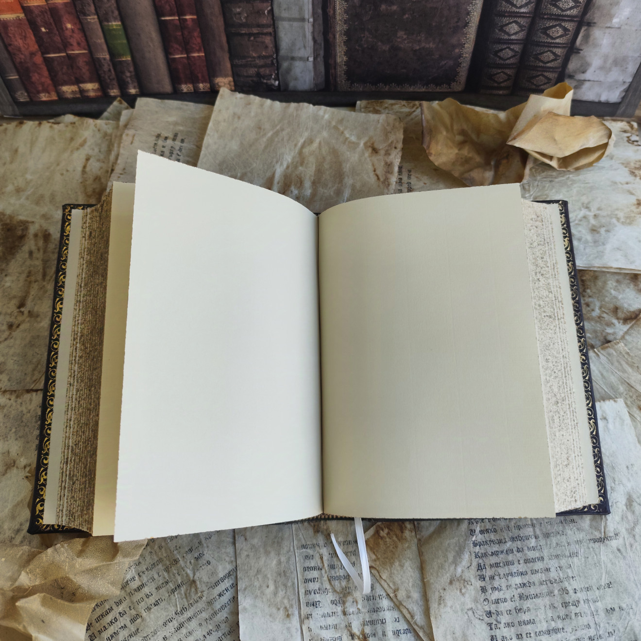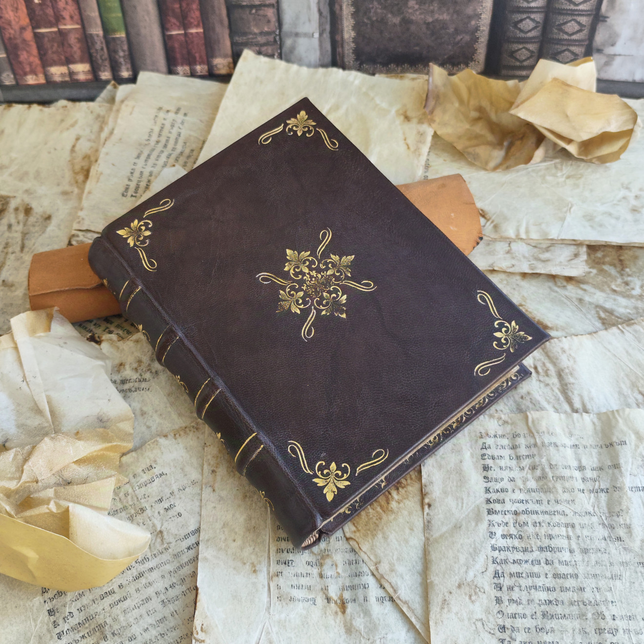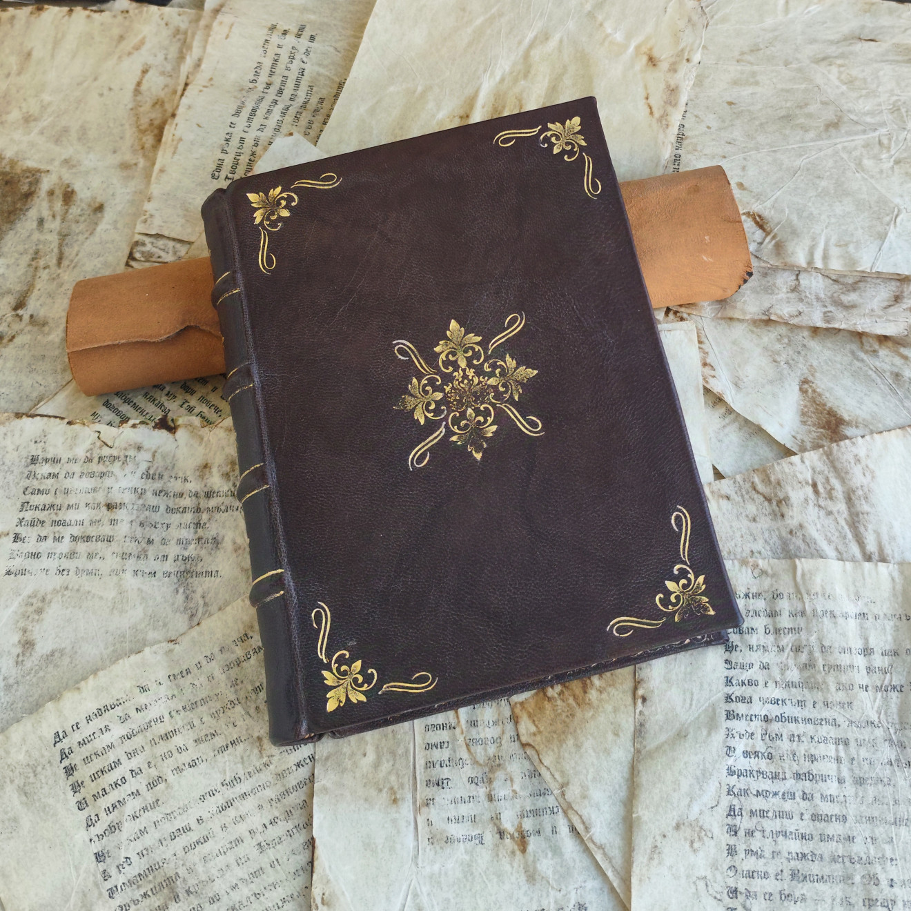 Изцяло ръчно книговезан кожен тефтер за думи, които остават. Изработен от висококачествени естествени материали по автентична технология. * Размер около А5 (16/20 см) * около 480 страници без редове * Висококачествена 90-грамова хартия, подходяща както за писане с химикал, така и с писалка. * Естествена растително дъбена козя кожа * Декорация с 23,5 карата златен варак * Ръчно шит на 4 канапа * Ръчно декориран обрез * Ръчно шити копринени капителбанди * Вътрешна кожена става. Всеки тефтер пристига при Вас в луксозна подаръчна опаковка.