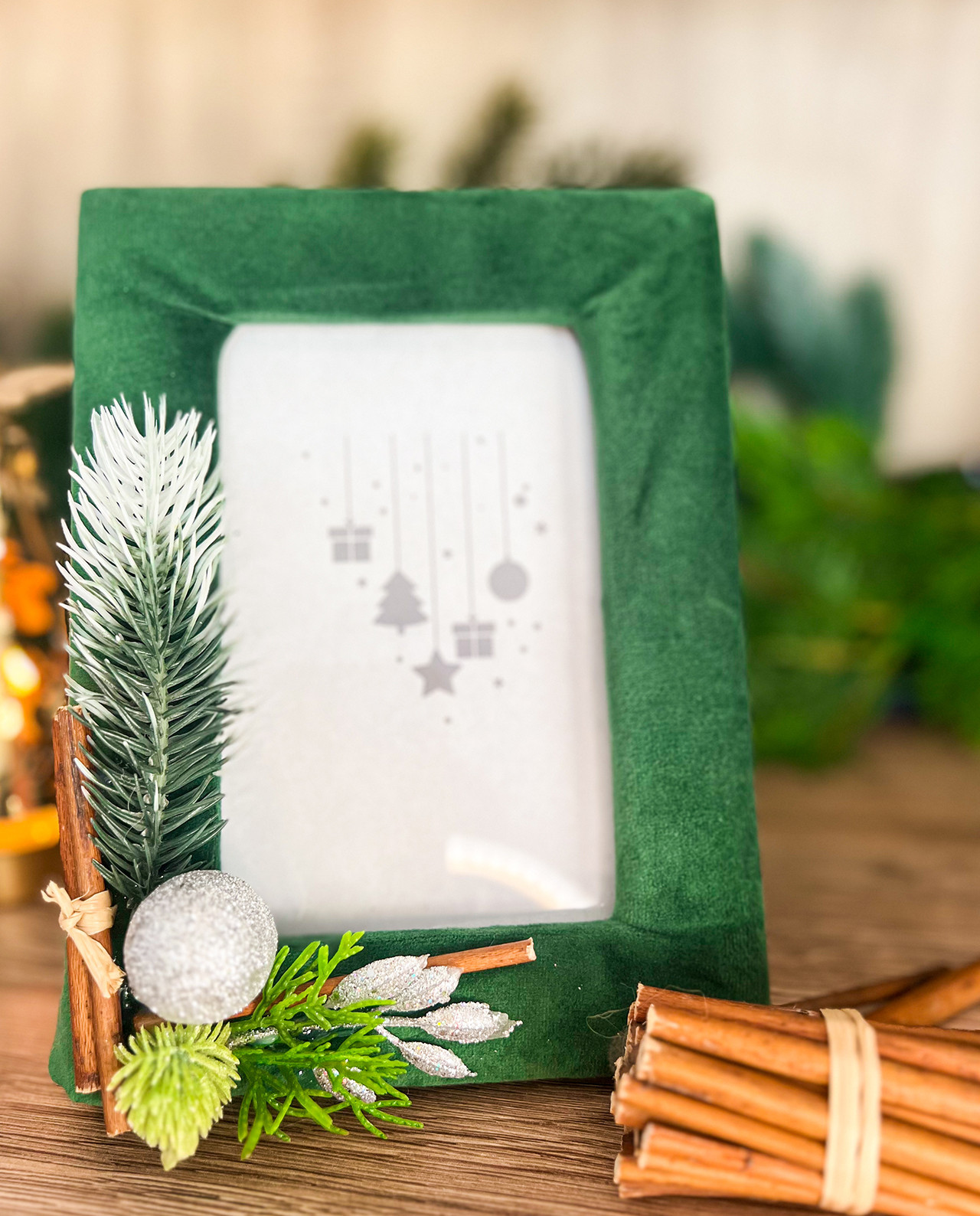Рамка за снимка с размер: 10х15 см - 56 лв 15х20 см - 66 лв - Дървена основа - Покрита с вата и мек велур - Декорирана с комбинация от коледни мотиви - Възможност за добавяне на надпис и персонализиране - Опакована в красива и екосъобразна опкаковка, която освен, че я предпазва я и прави готова за подарък.