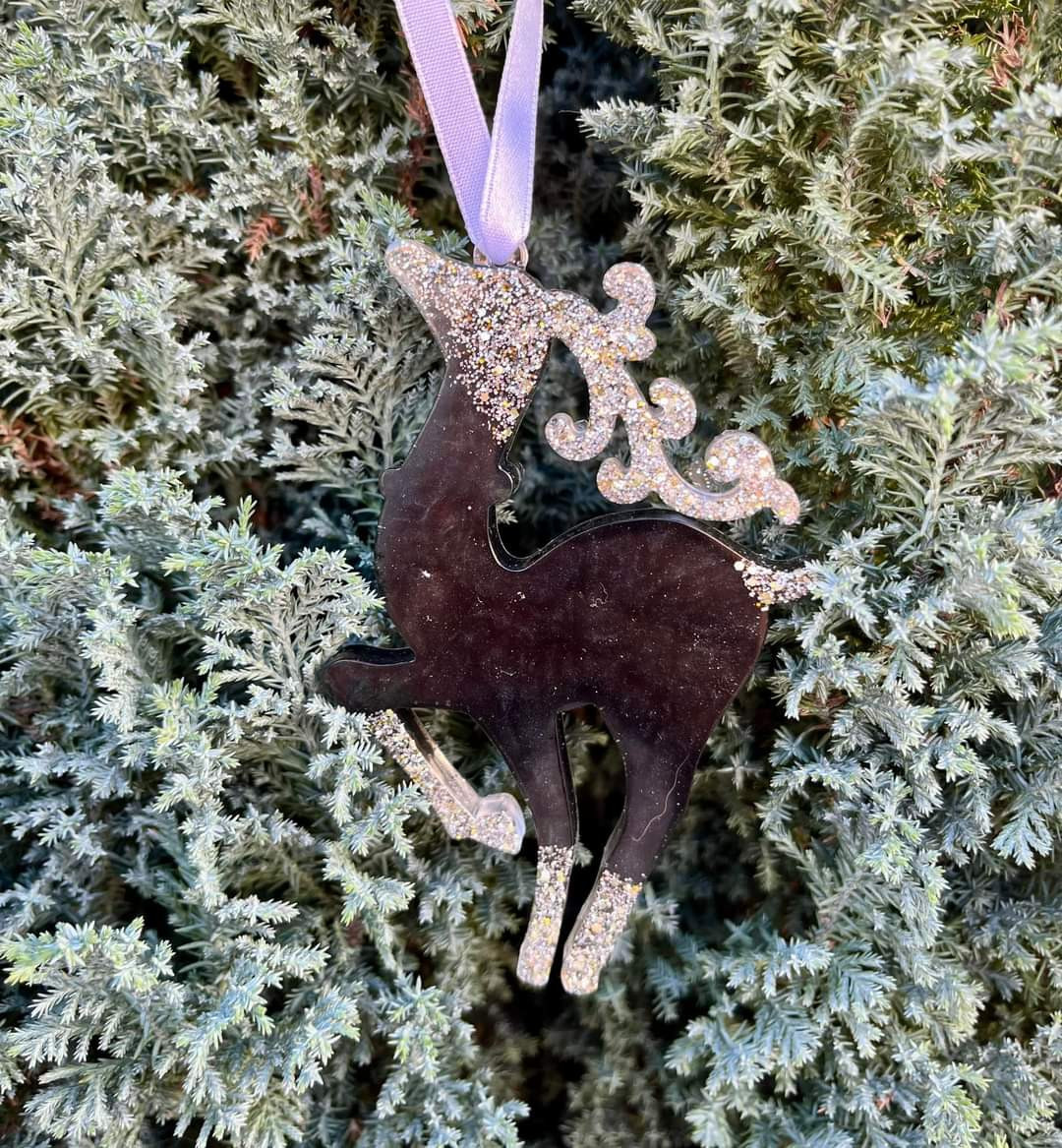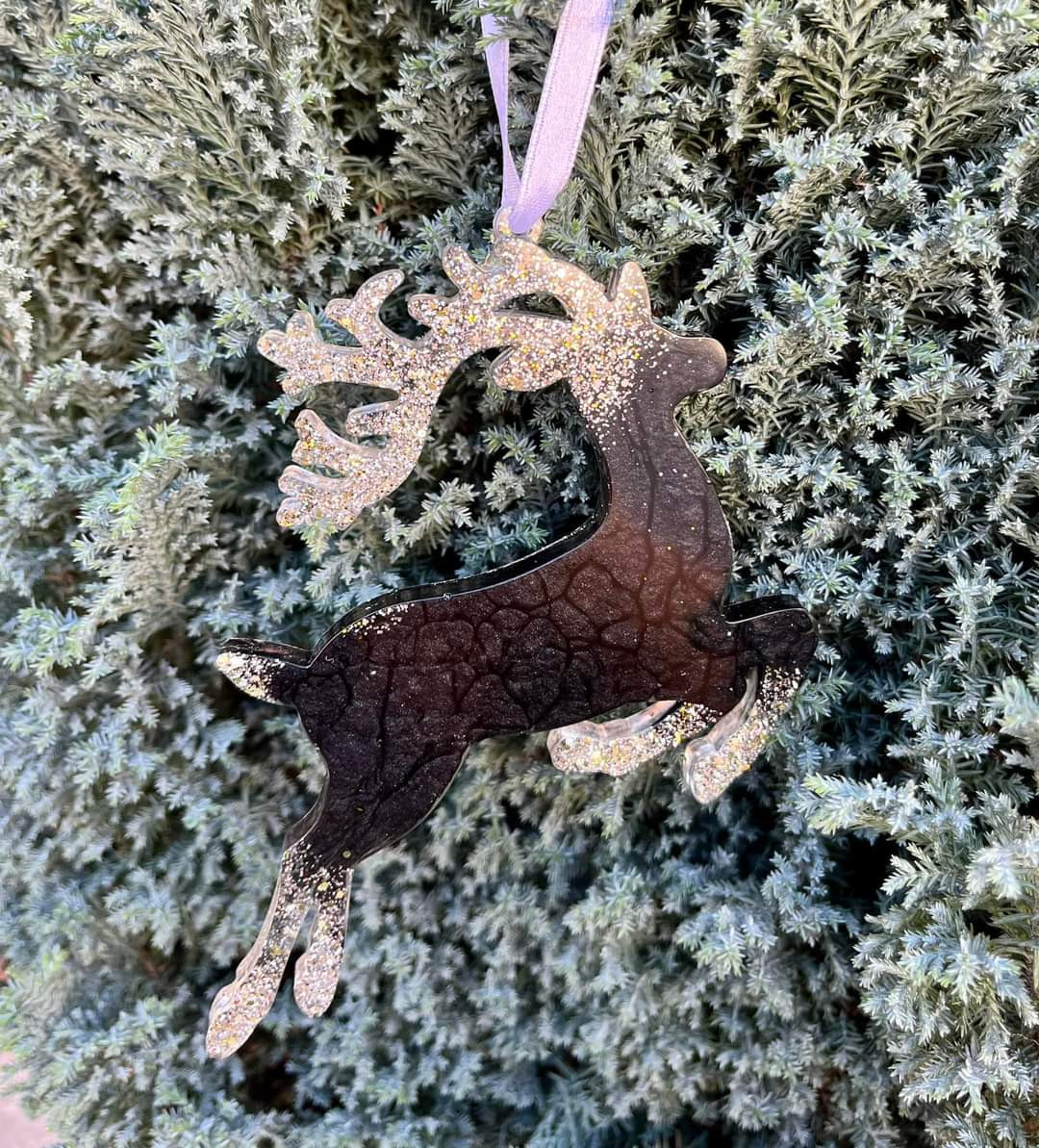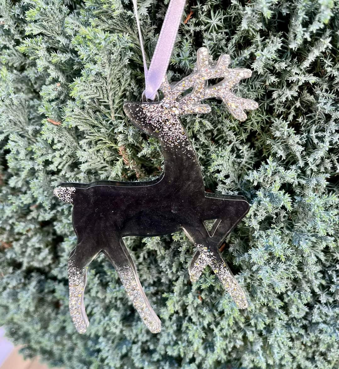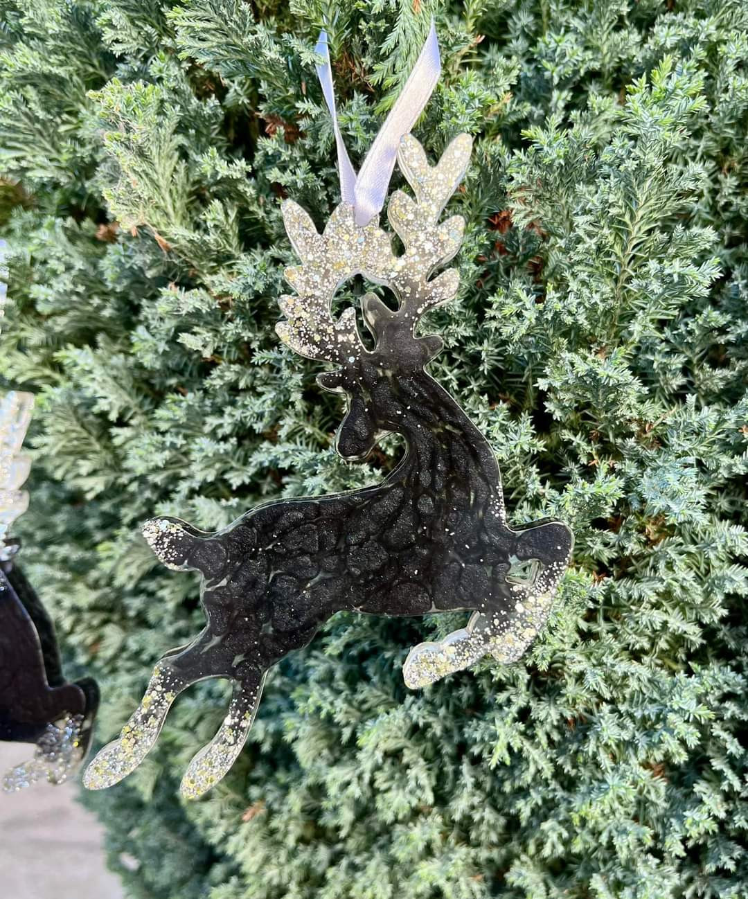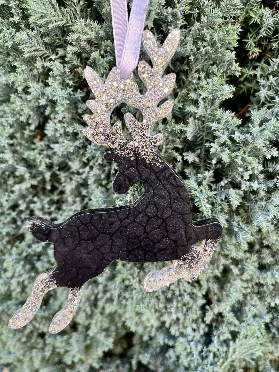 Новите ни висулки за елха от епоксидна смола във формата на еленчета,този път в комбинация от черно и сребърен брокат . ?❄️? ✅Всички моделчета са уникални и неповторими сами по себе си. ✅Продават се,както индивидуално,така и в комплект. ✅Могат да бъдат изработени в цветове по Ваш избор. Предимствата на играчките/висулките от епоксидна смола са: ✅Изключително здрави ✅Безопасни за деца