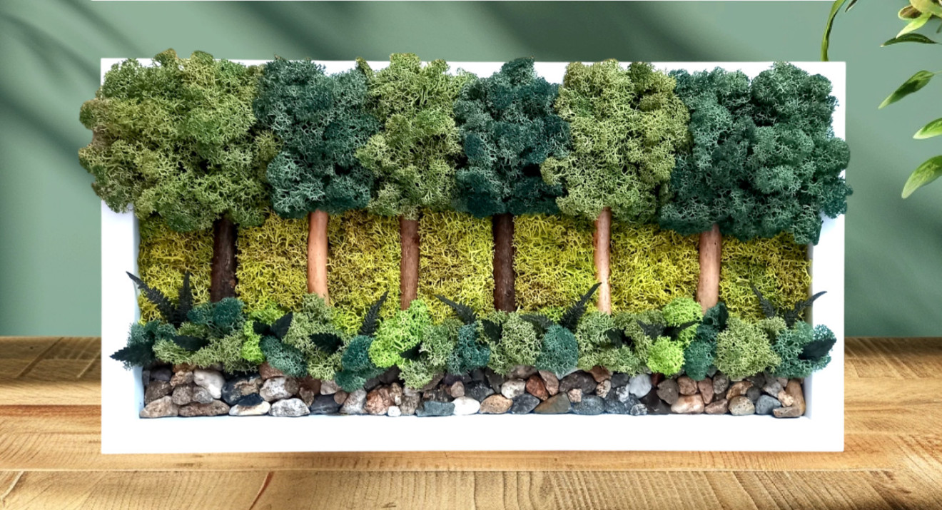 "Гора", изработено изцяло с естествени материали. За направата са използвани скандинавски мъх, камъчета, клонки и стабилизирани растения.