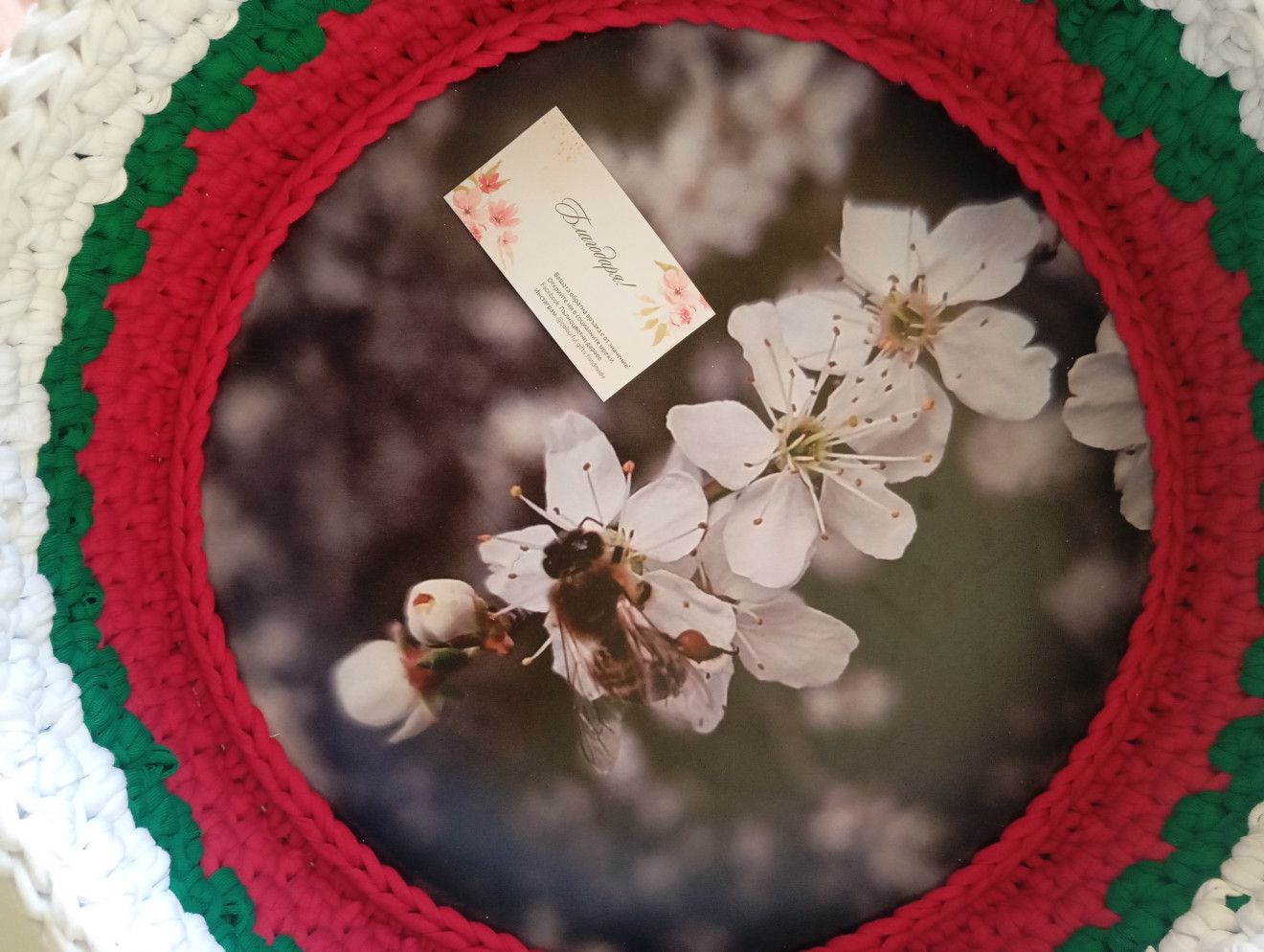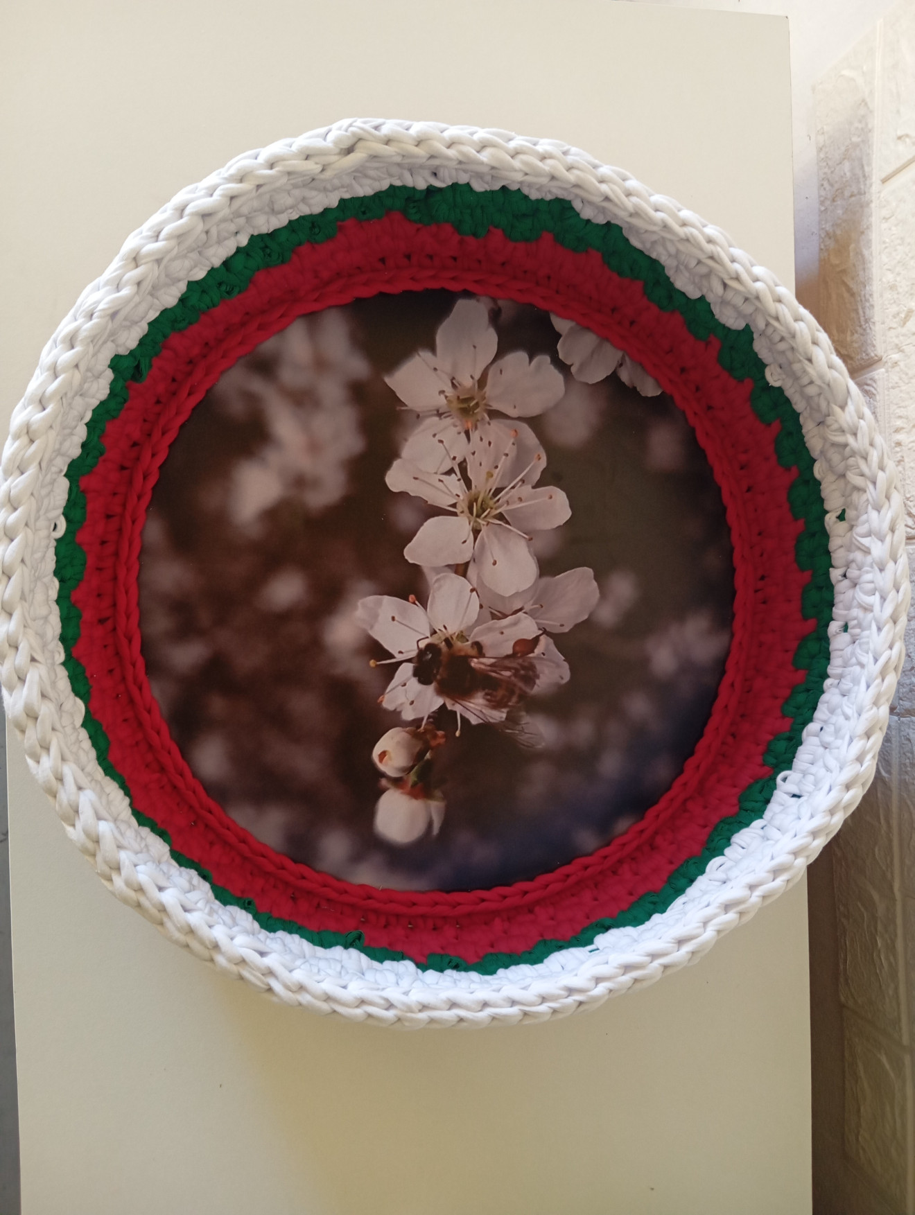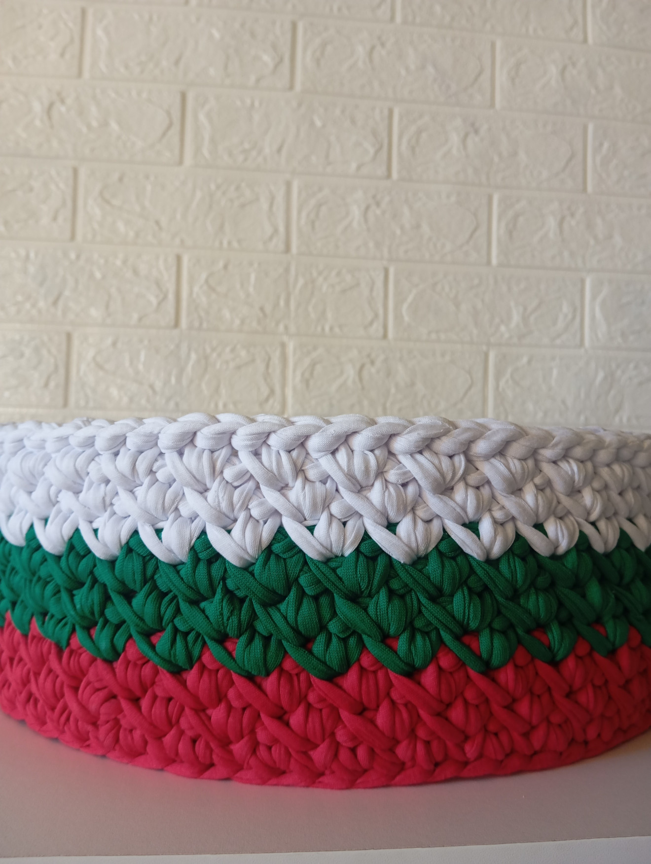 Плетен панер с цветовете на българското знаме. Чудесен подарък за всички, които ще се радват трибагреникът да краси стаята им. Подходящ е за съхранение на (вкъщи ги използваме за): - пакетирани храни, подправки, чай или кафе; - Великденски яйца; - кърпи; - козметика; - дребни неща, стикери, телбод или други канцеларски материали, които да се държат под ръка; - зарядни, кабели, батерии, флашки и дребни аксесоари, които да стоят заедно и да знаете къде да ги откриете; - всичко друго, което намерите за подходящо. Дъно от МДФ с лазерен печат. Изплетен от текстилна прежда. Може да се добавят дръжки от изкуствена кожа или дървени. Приблизителни размери: Диаметър 38 см. Височина 12 см. Наличен е, пишете ако го познаете за себе си или за подарък. Може да си изберете конкретно цветово съчетание, форма и размери. Напишете съобщение, за да уточним детайлите. Пълноцветни дарове ?