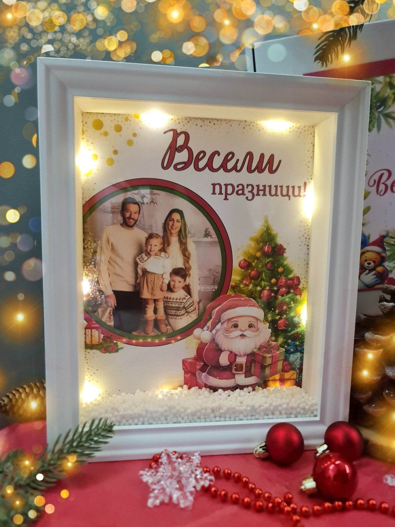 ?Светеща 3д рамка изработена с надпис Весели празници, свободно движещ се сняг, 3д Дядо Коледа и Ваша снимка, като може да се добави и персонализиран текст.❄️☃️ ?Подарете личен и запомнящ се подарък на близки за Вас хора. ? Изработена с вградени лампички, които допринасят за уюта и празничното настроение!❤️ ✅️Размера на рамката е 23/28 и е дълбока 6см ✅️С Ваша снимка ✅️По желание надпис на кутията Рамката може да бъде закачена на стена, но също така дълбочината и е предимство да седи свободно стояща. #светещарамка #светеща3драмка #коледа #коледенподарък #рамказаколеда #рамказабабаидядо #кръстници #подаръкзакръстници #подаръкзаприятел #подарък #повод #ръчнаизработка #ръчноправенподарък #веселаколеда #коледнипразници #рамка #подарък