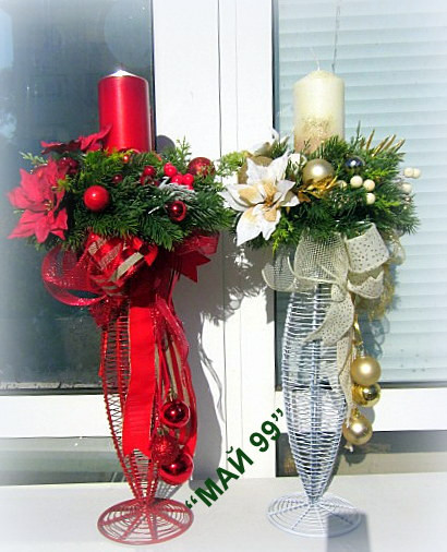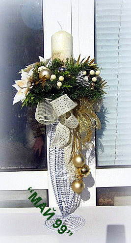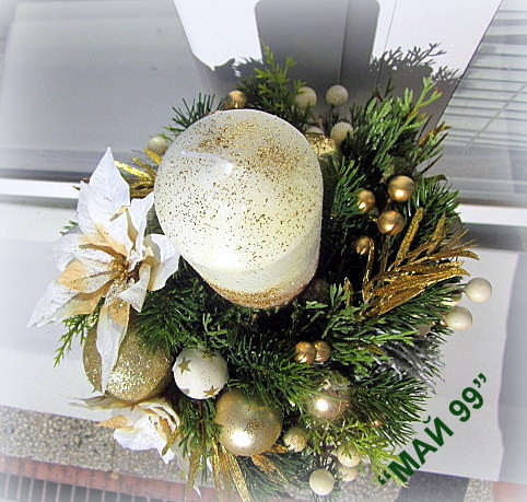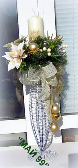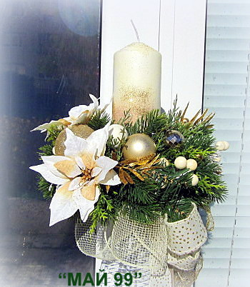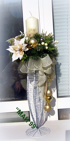 Пищен и елегантен с богата коледна декорация,метален /бял/ свещник 60 см.с венче ф 25 см. от изкуствени борови елхови клонки,коледни топки в (бяло и злато,елементи и коледни бели опушени коледни звезди,бяла свещ 18 см.и чудесна панделка с висящи топки! Чудесен коледен декор за вашия дом! Чудесен фирмен подарък!