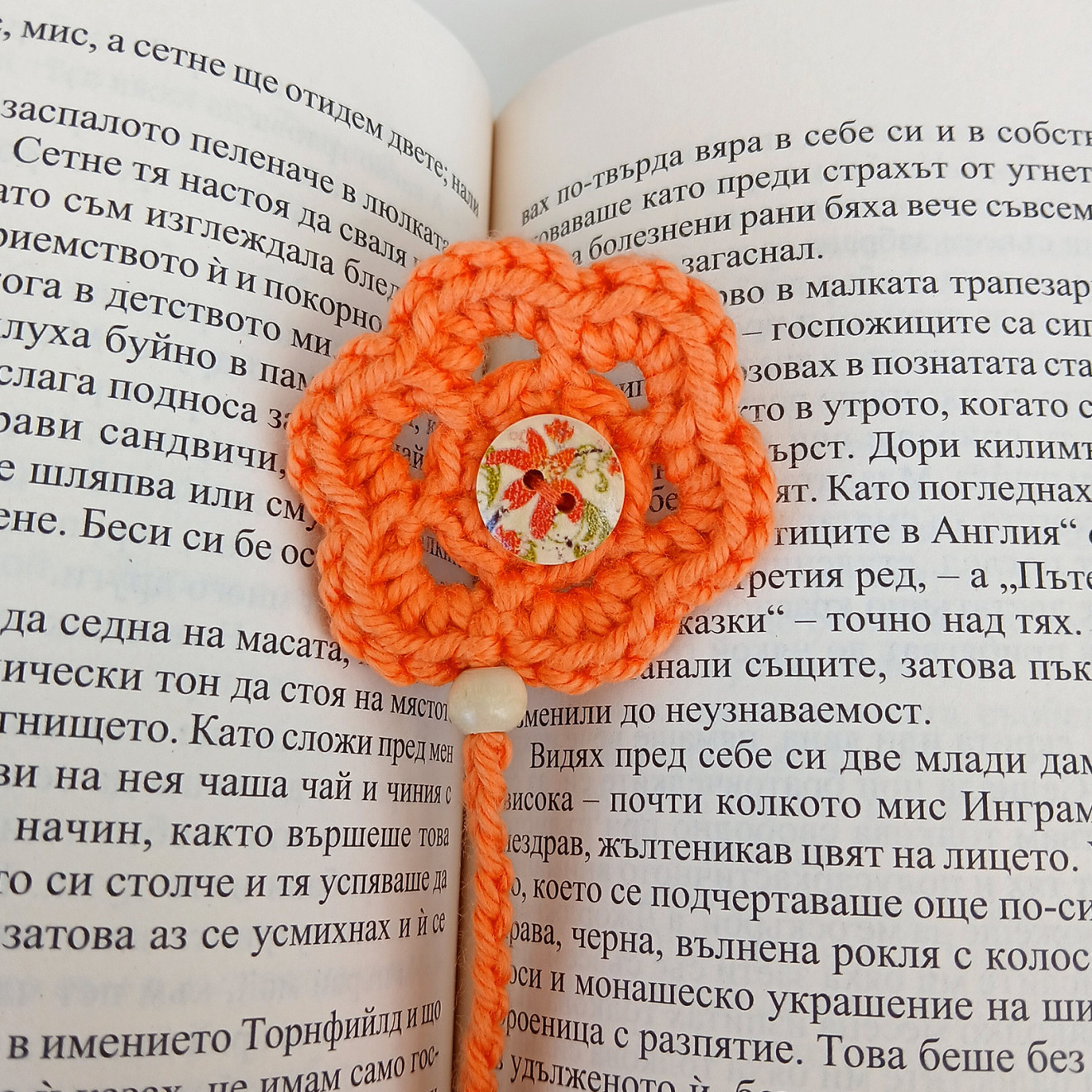 Отбелязка за книга, изплетена на една кука от оранжева памучна прежда. От едната си страна цветето има тичинка от дървено копче на цветя. В края си книгоразделителя има дървена декорация. Наличен е и в други цветове.