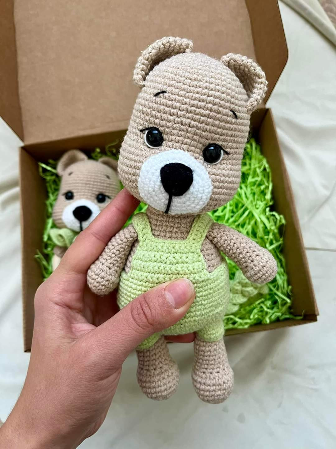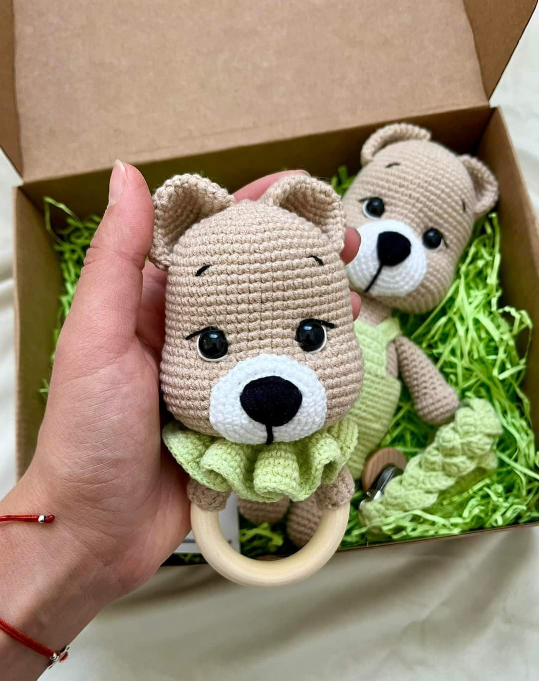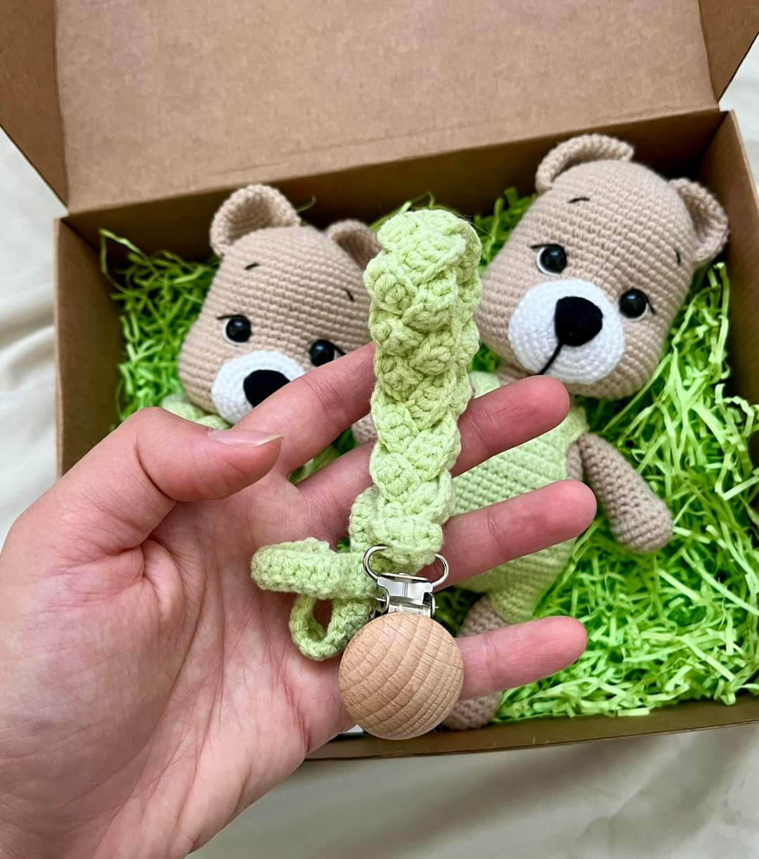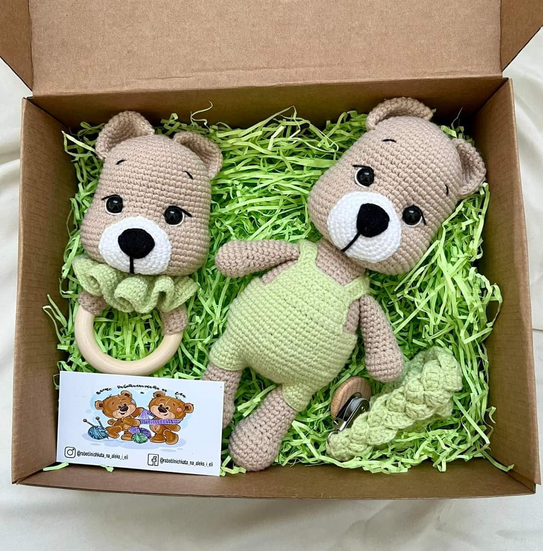 ? Комплект с ръчно изплетени играчки мечета, който включва: ✅Играчка ✅ Гризалка ✅ Клипс за залъгалка Играчките са изработени от: ✅ Памучна прежда ✅ С очи на винт ✅ Пълнеж от хипоалергенен пух ✅ Дървен ринг ✅ Дървен клипс За поръчки пишете на лично съобщение ?