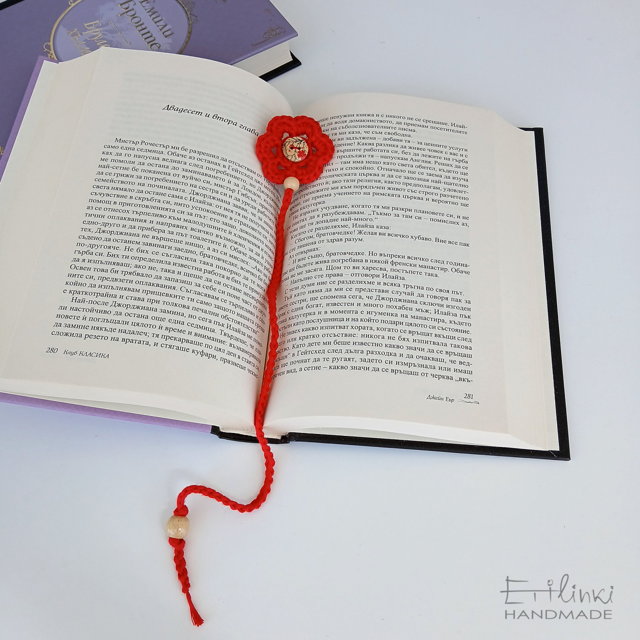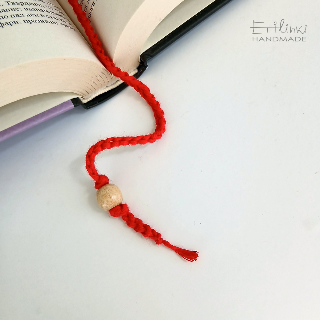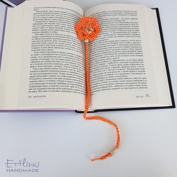 Книгоразделител, изплетен на една кука от червена памучна прежда. От едната си страна цветето има тичинка от дървено копче на цветя. В края си книгоразделителя е декориран с дървено топче. Наличен е и в други цветове.