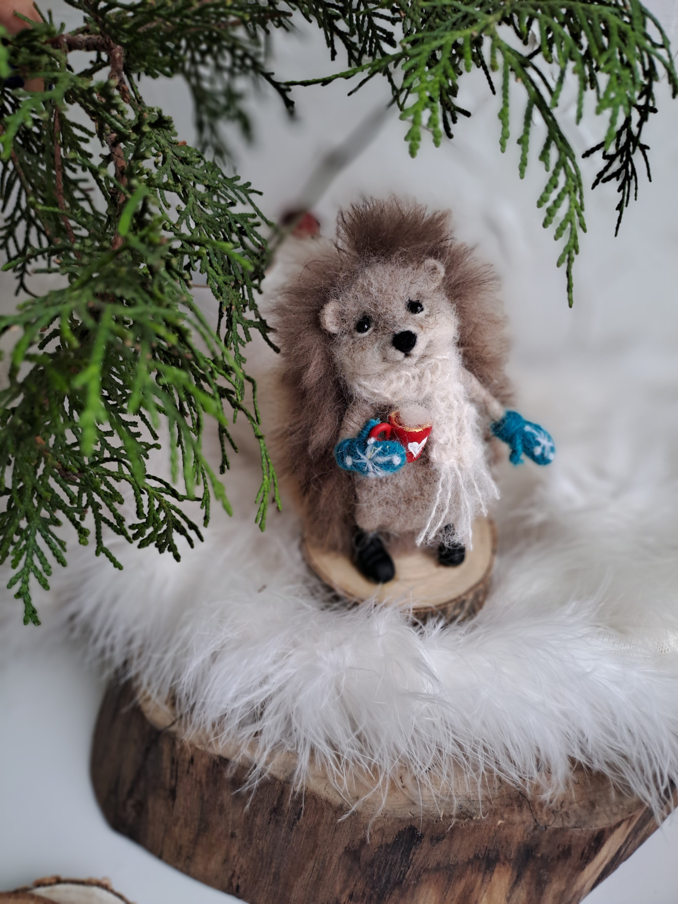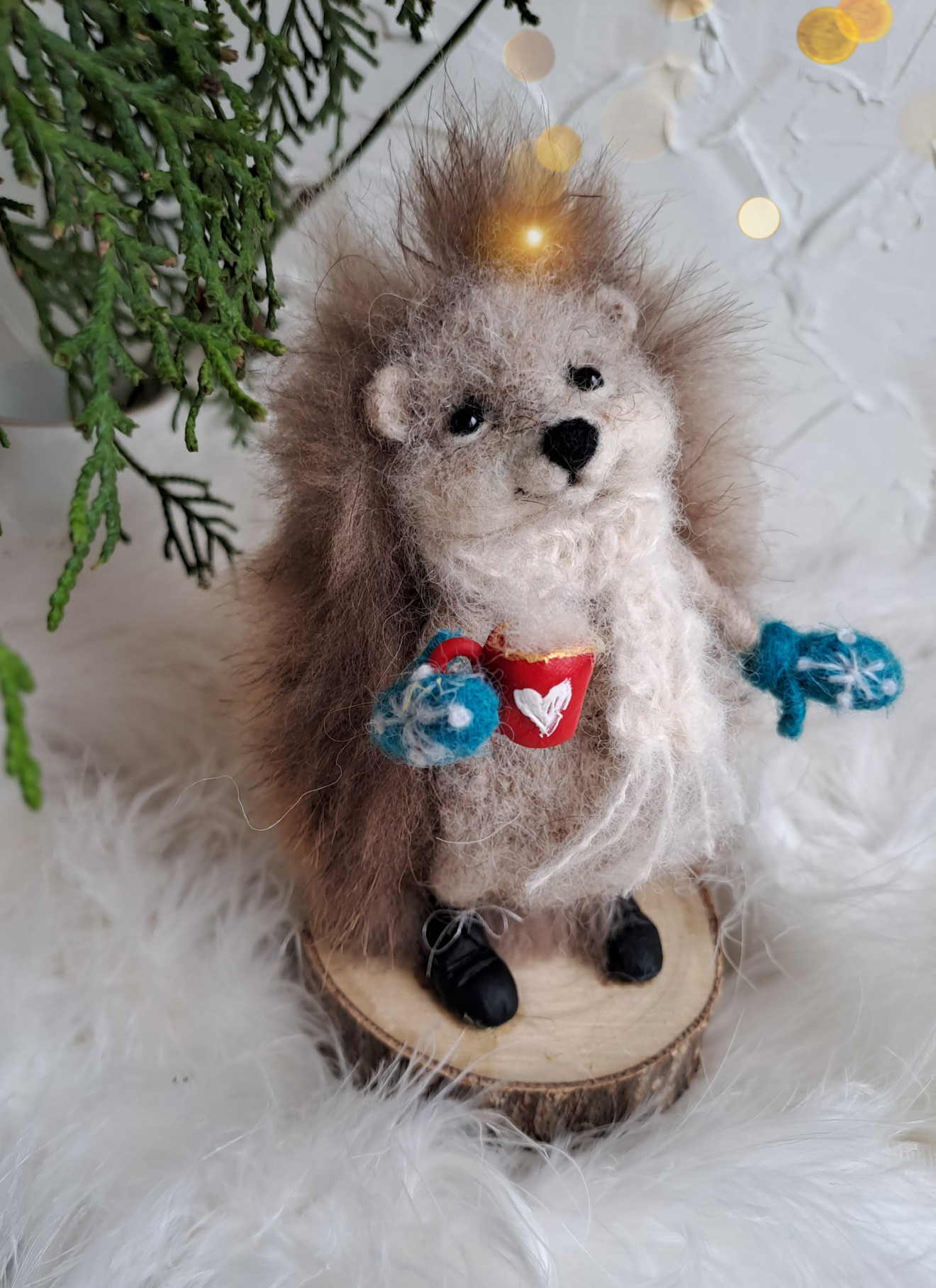 Таралеж изработен от вълна, чрез сухо плъстене с бодлички от естествен косъм, аксесоари от полимерна глина и дървена стойка. Не е детска играчка!.