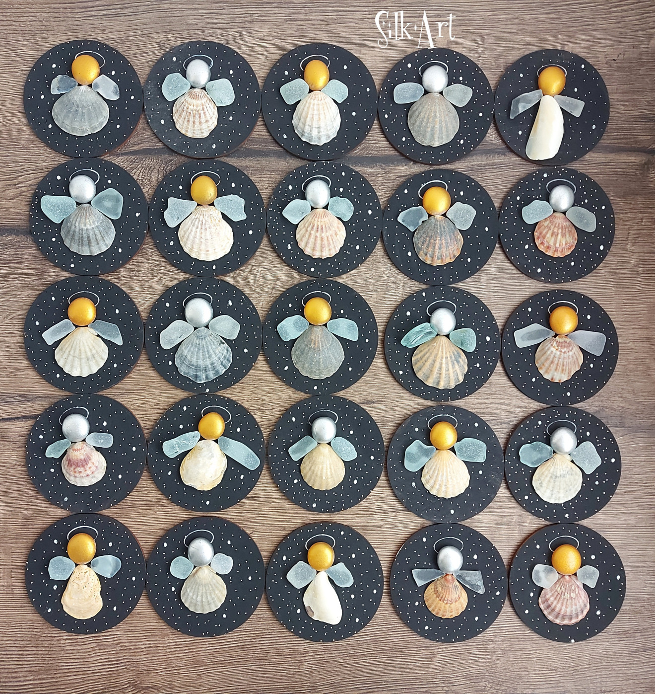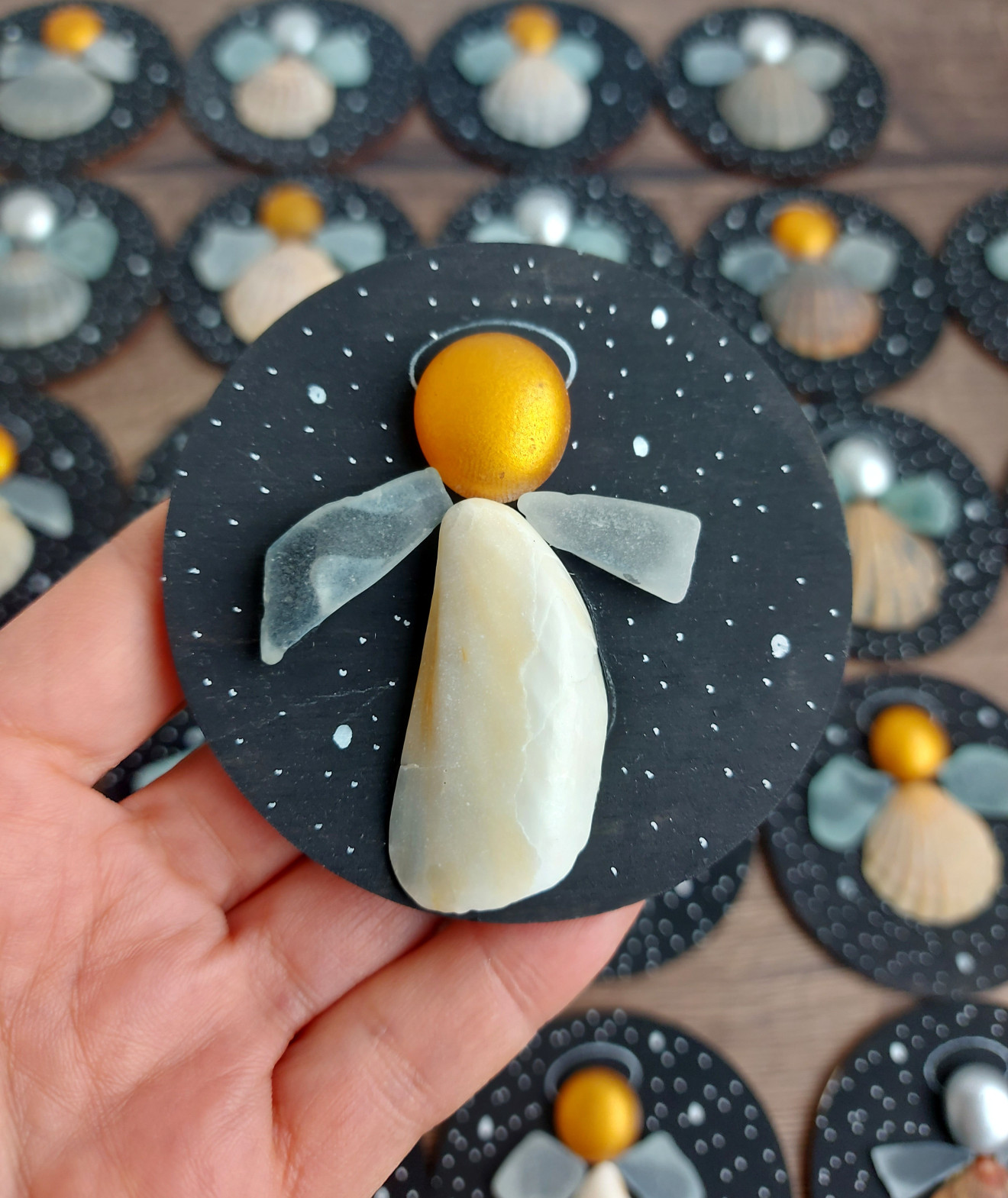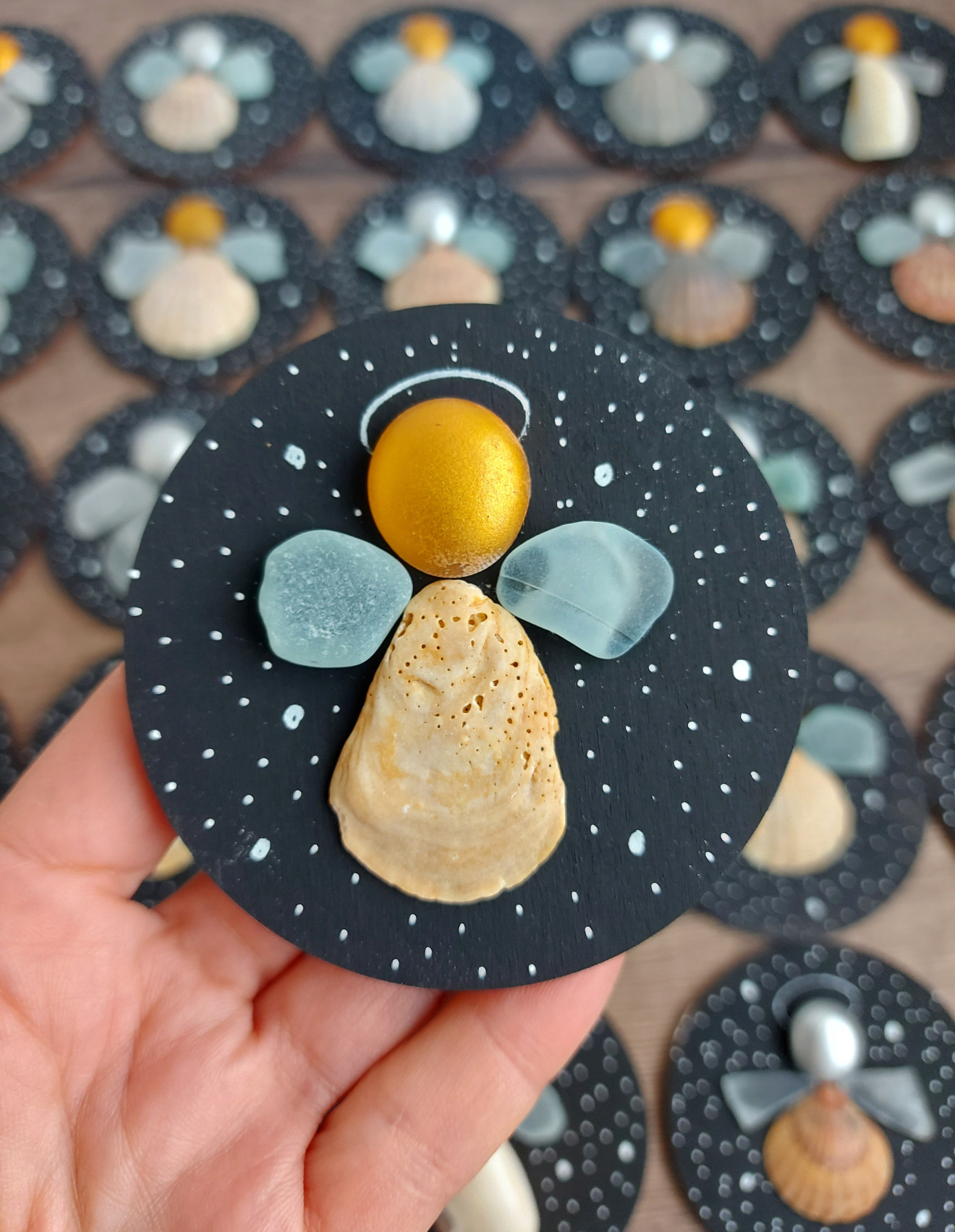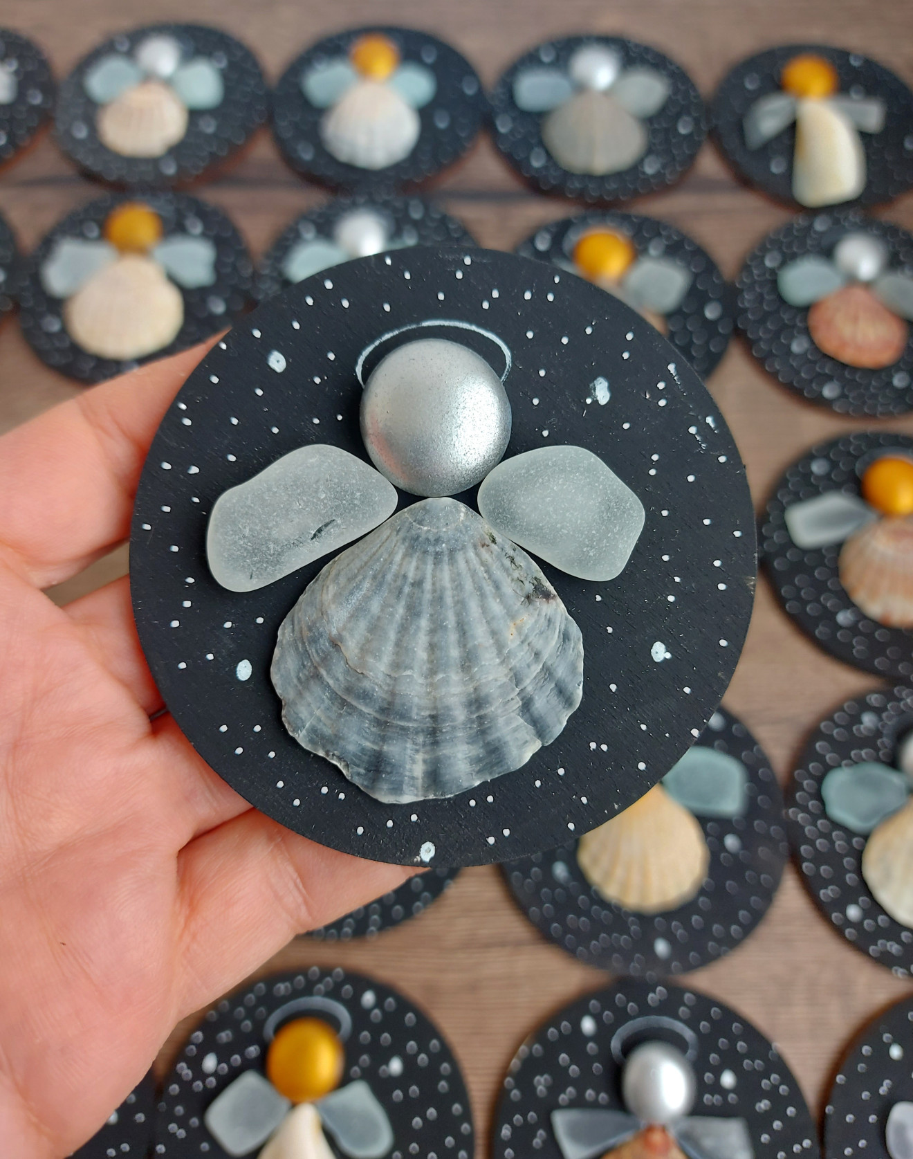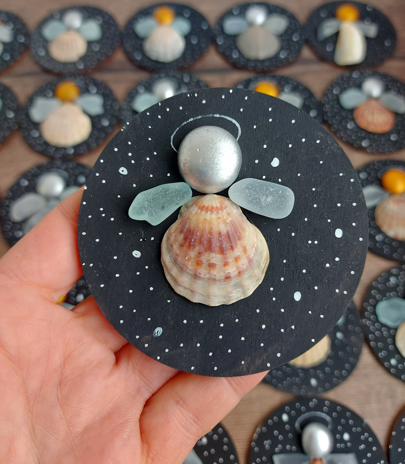 Магнитче или висулка за елха по Ваш избор, декорирано с морски миди и стъкълца. Диаметър 8 см. Цената е за брой.