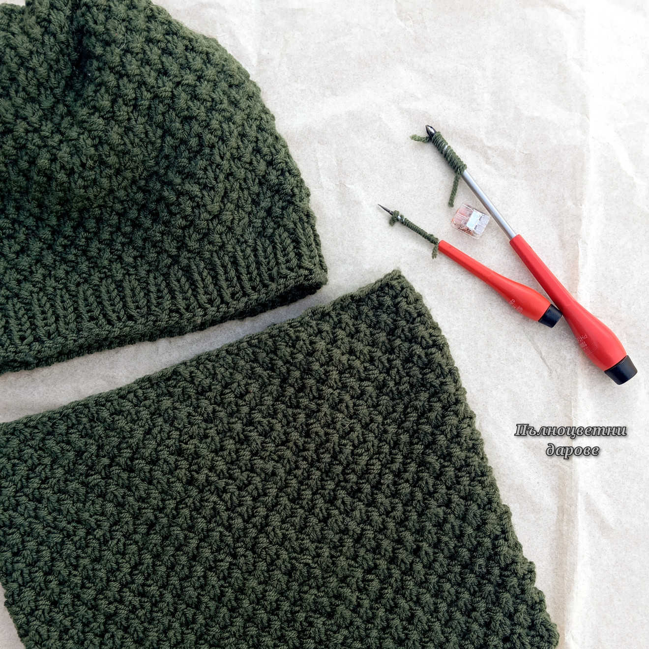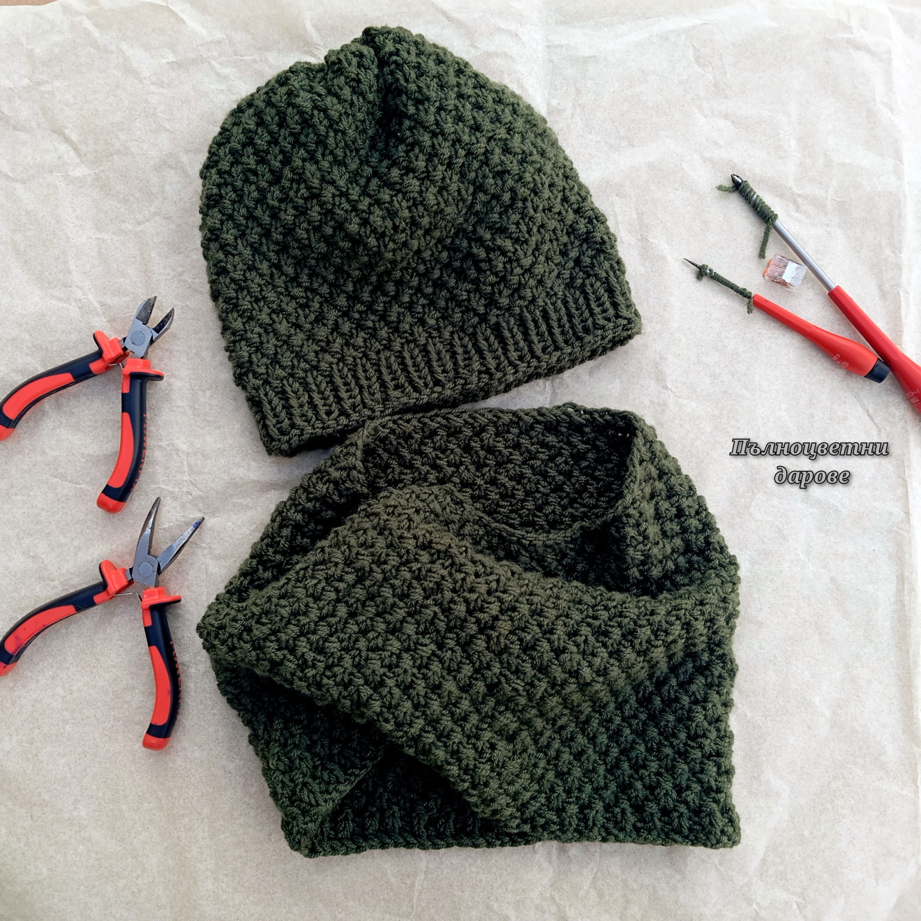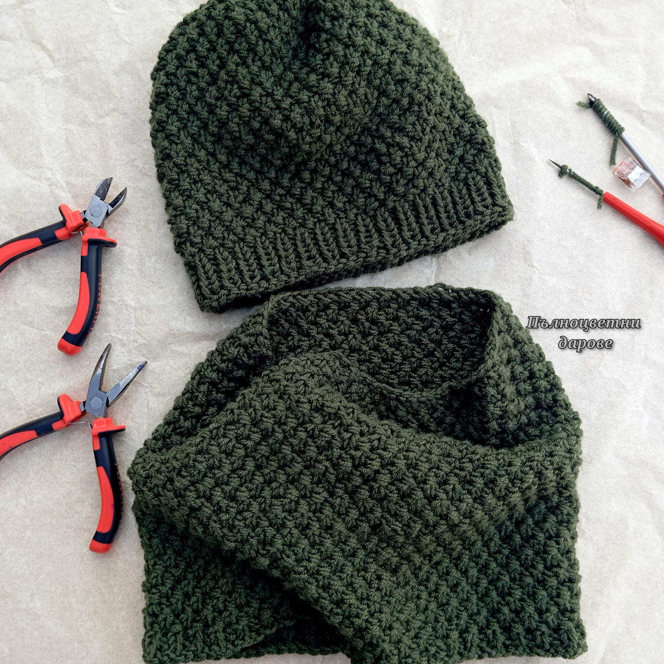 Комплект от ръчно изплетени шал и шапка за мъже • Ръчно изплетен комплект шал и шапка от мека мериносова вълна в маслено тъмно зелено. • Преждата е много мека, топли, но не спарва. Чудесен избор за мъже, които държат да носят най-добрите материи. ✨ Може да се изработи в други цветове. • Комплектът пристига опакован в кутия с панделка, готов за подаряване. • Възможно е персонализиране, добавяне на картичка с името на получателя и лично послание. • Напишете съобщение, ако познаете комплекта за себе си или за подарък. Поздрави! Пълноцветни дарове