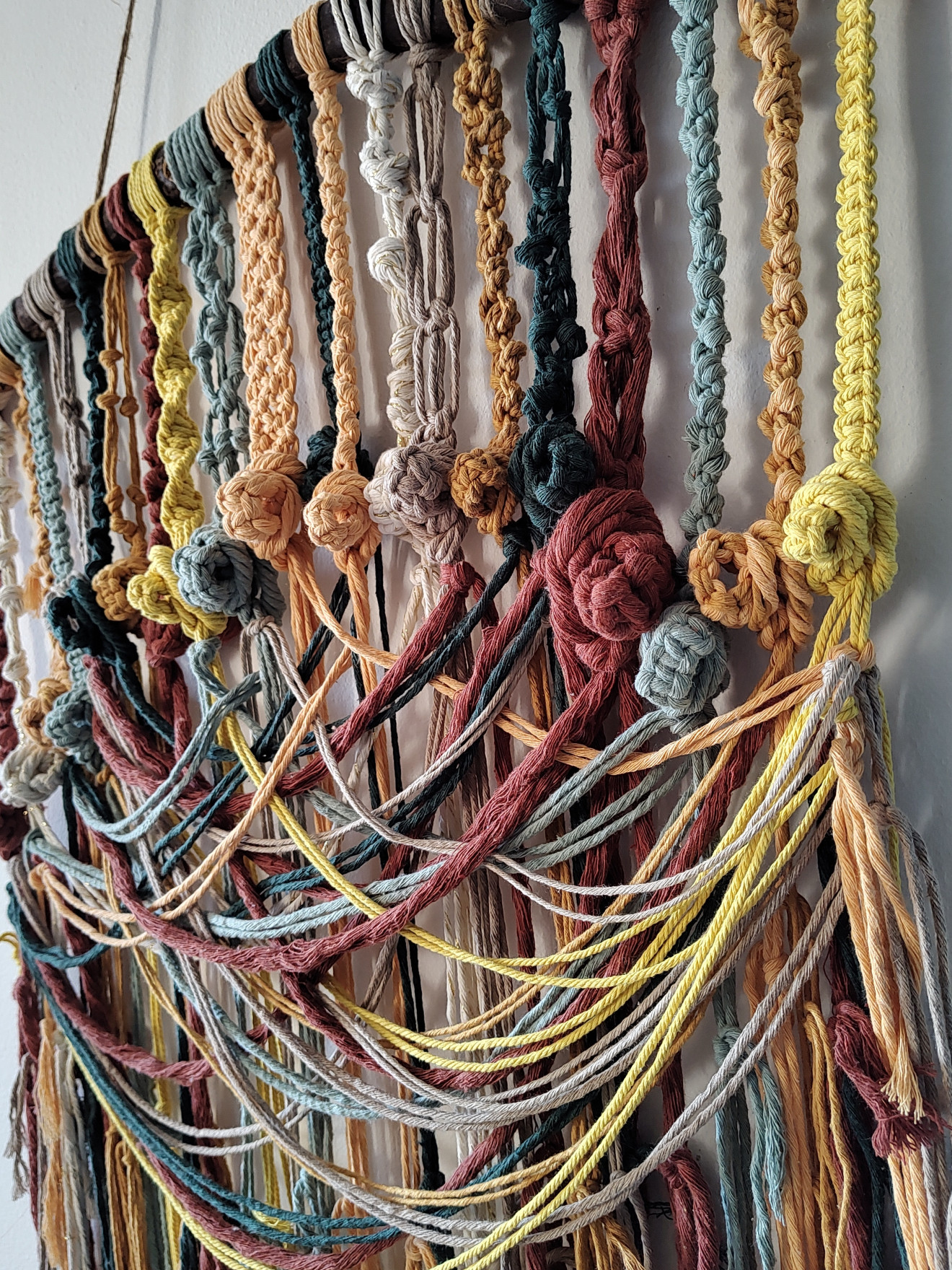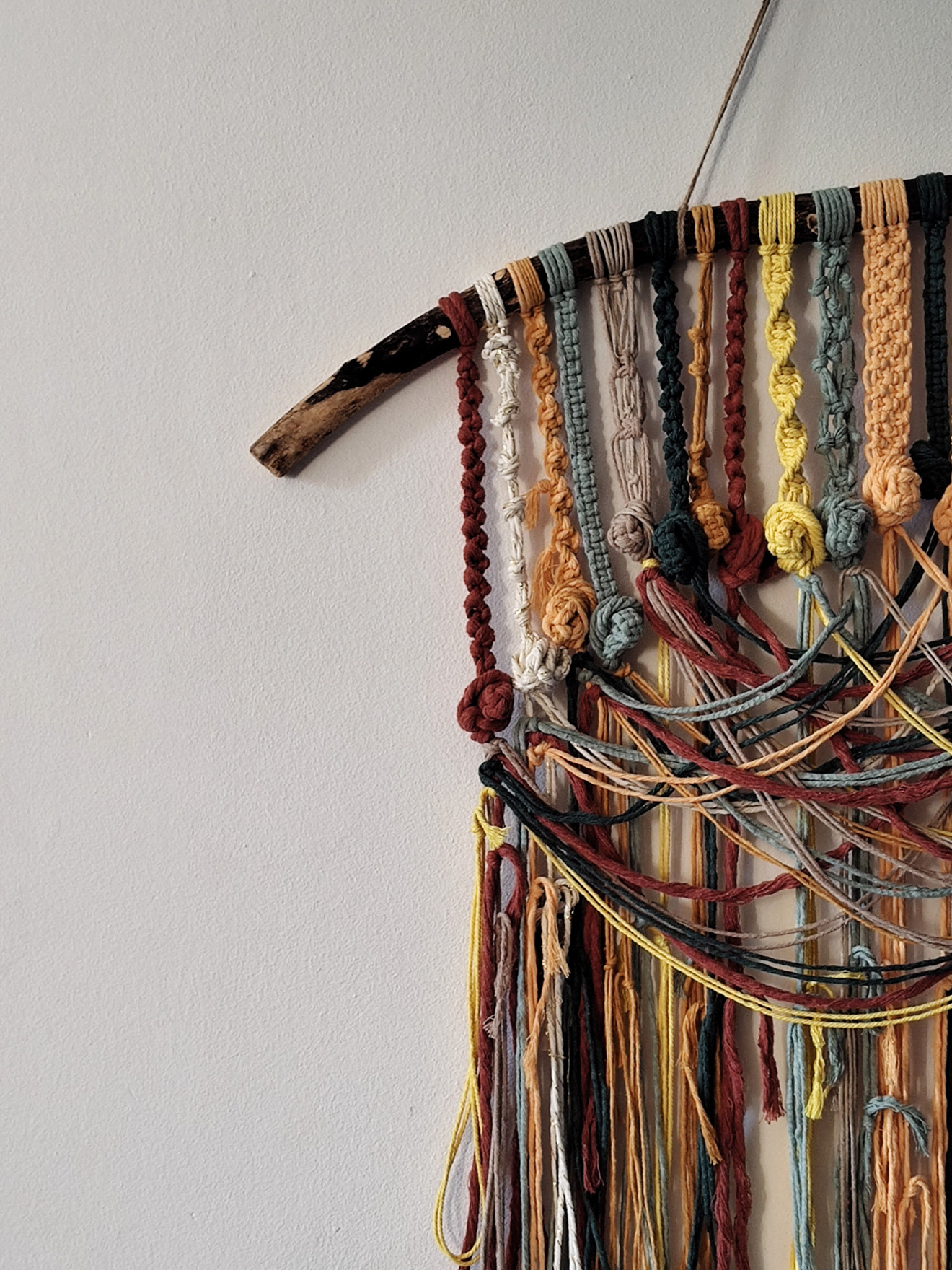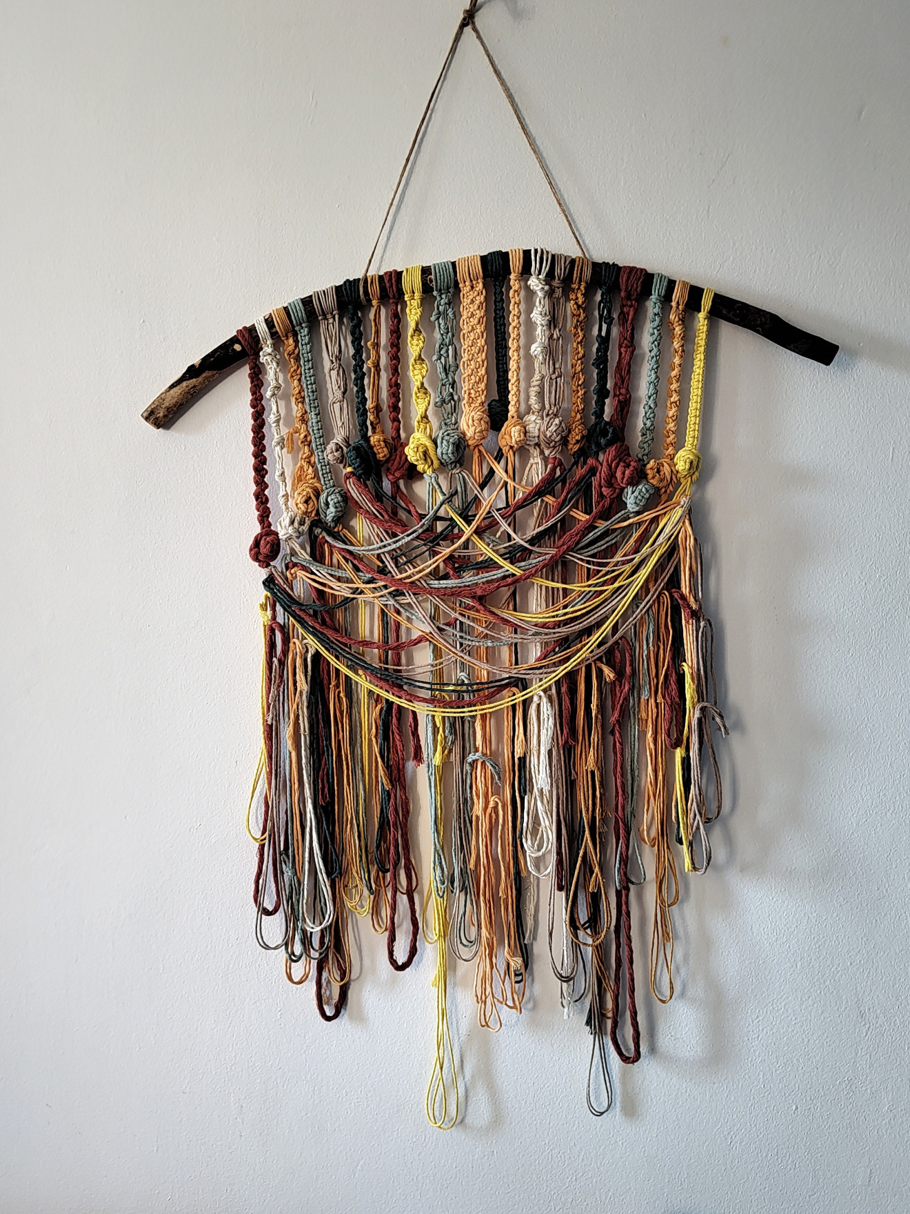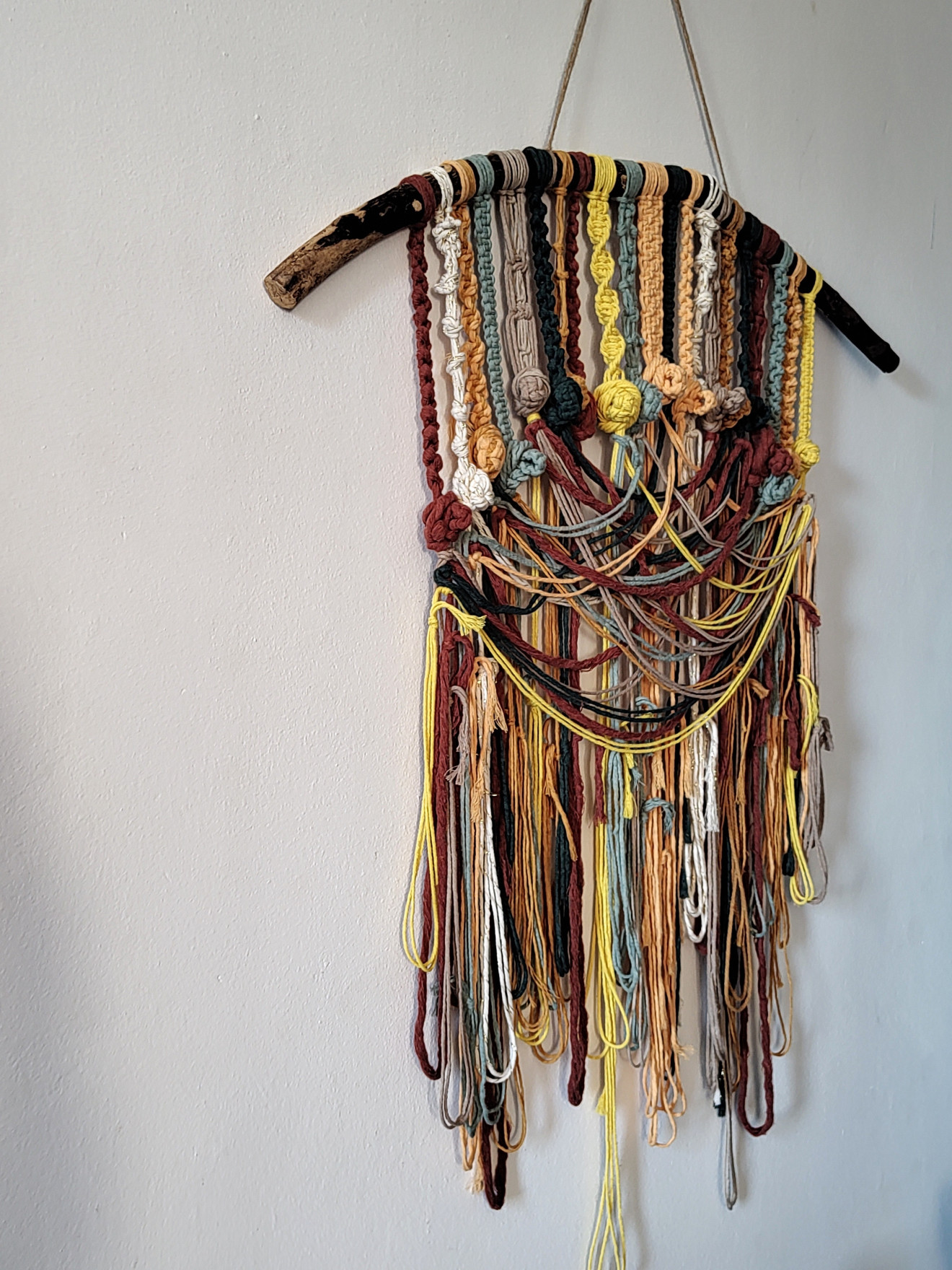 Здравейте! Представям ви пано за окачване ,палитра от цветове и възли! Един прекрасен акцент за стена и уютно допълнение на интериора! Изработено е от памучни макраме конци на горски клон.