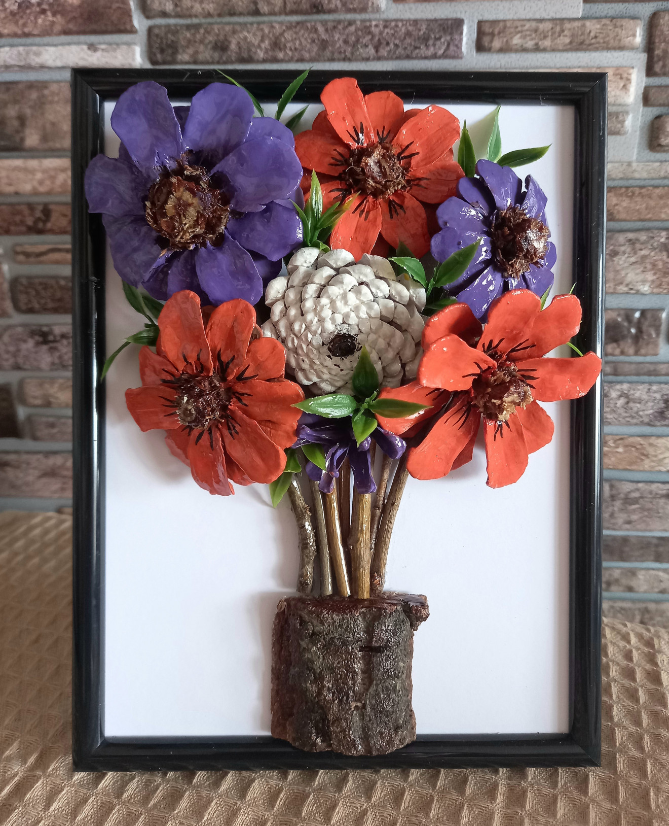 Изработено от шишарки, клонки, кора от дърво и изкуствени листа. Фоторамка с размери 21/16 см.