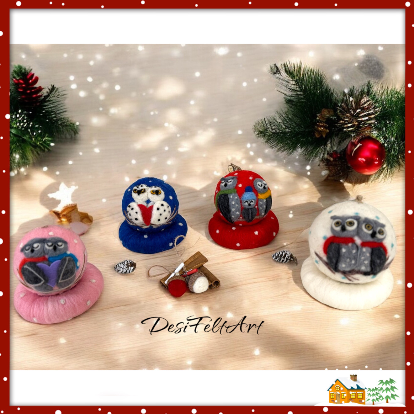 Влюбени бухали - символ на любов и привързаност Семейство с малко бухалче - олицетворение на семейната обич и уют. Ръчно изрисувани топки с мериносова вълна, чрез техника иглонабиване (сухо плъстене). За основа съм използвала стиропор с размер 8см. (диаметър). Могат да се използват като играчка за елха или декорация на дома. Тази година украсете елхата си с ръчно изработени Коледни играчки, които съчетават топлина и уникалност. Цената е за 1 брой (топка + поставка)