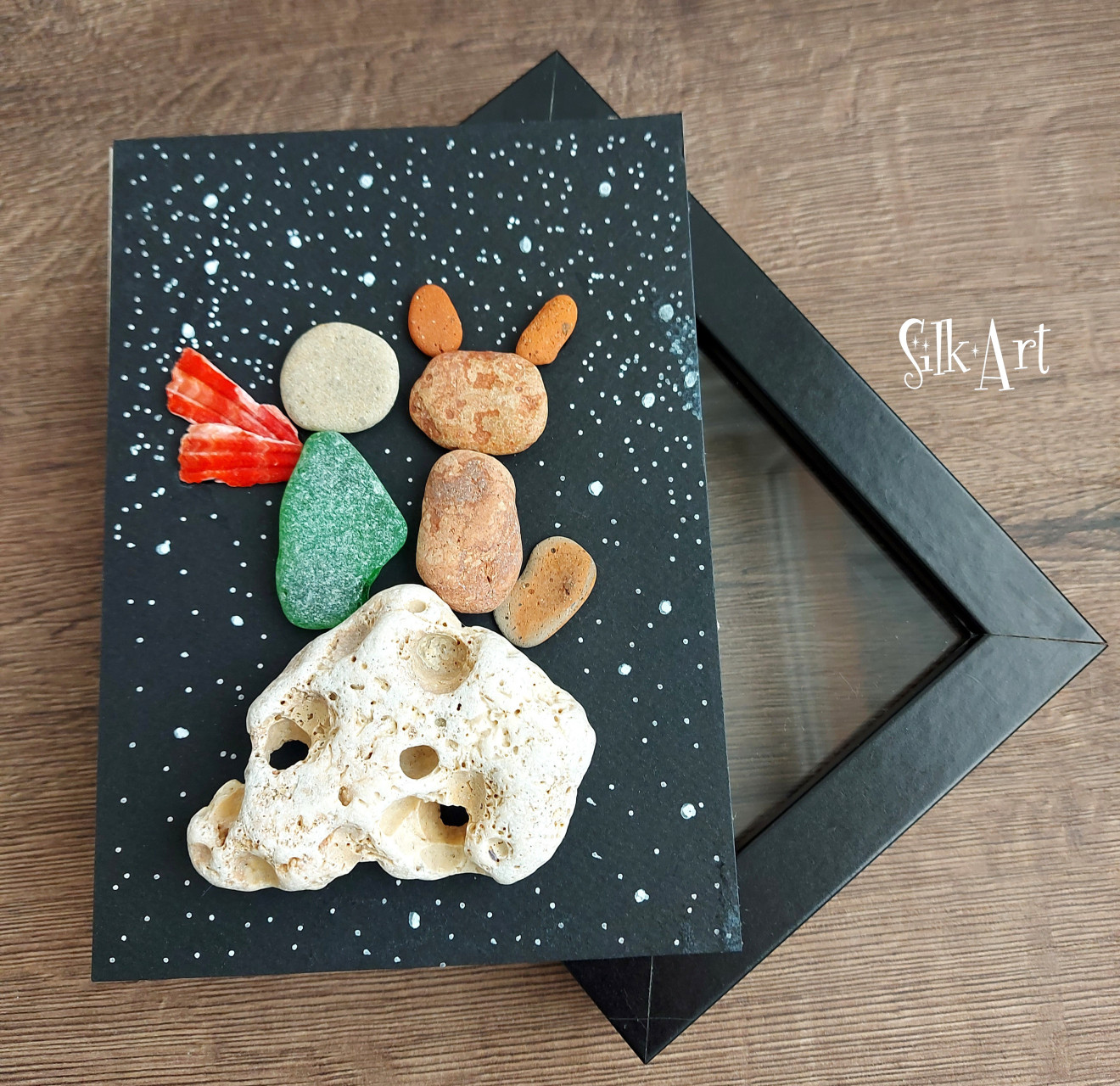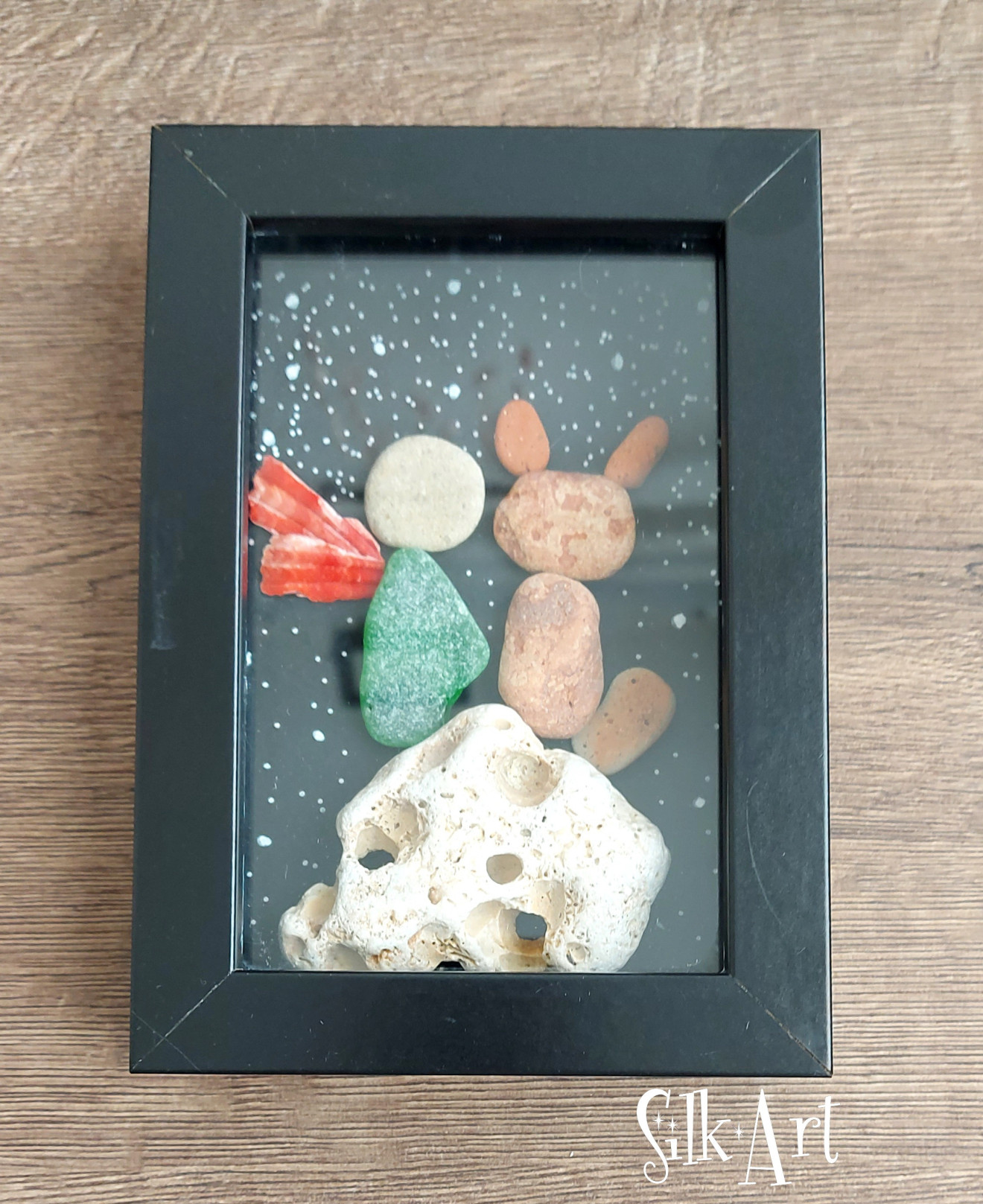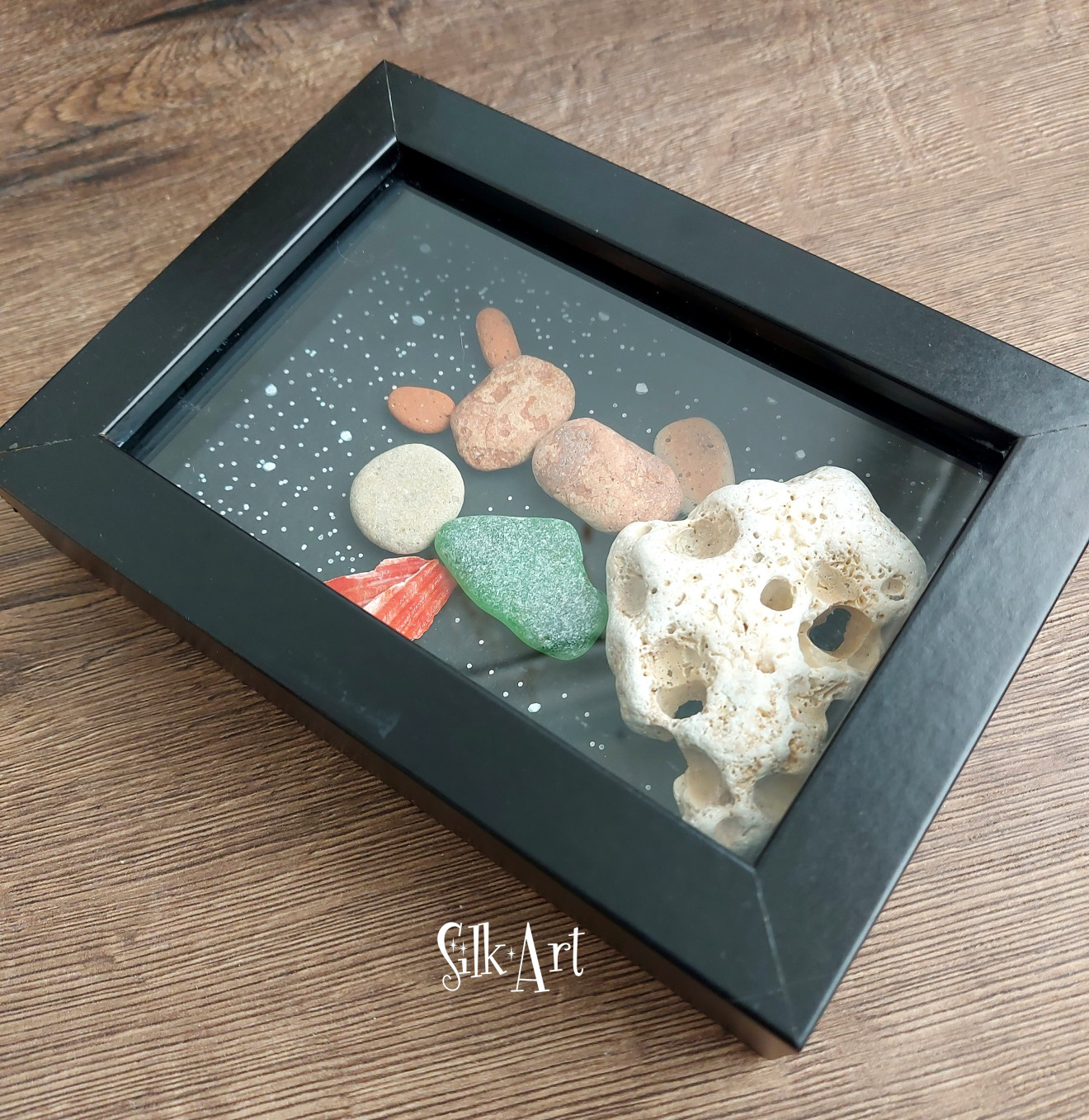 Дълбока рамка с размер 12.5/17,5/3,5 см. със стъклено прозорче. Декорация с морски камъчета и стъкълца.