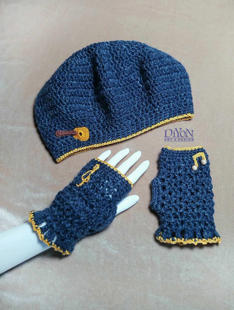 Артистичен комплект от барета и ръкавици без пръсти с музикални мотиви. В тъмносин меланж и нежно оранжево, с декорация китара, ноти, ключ сол.