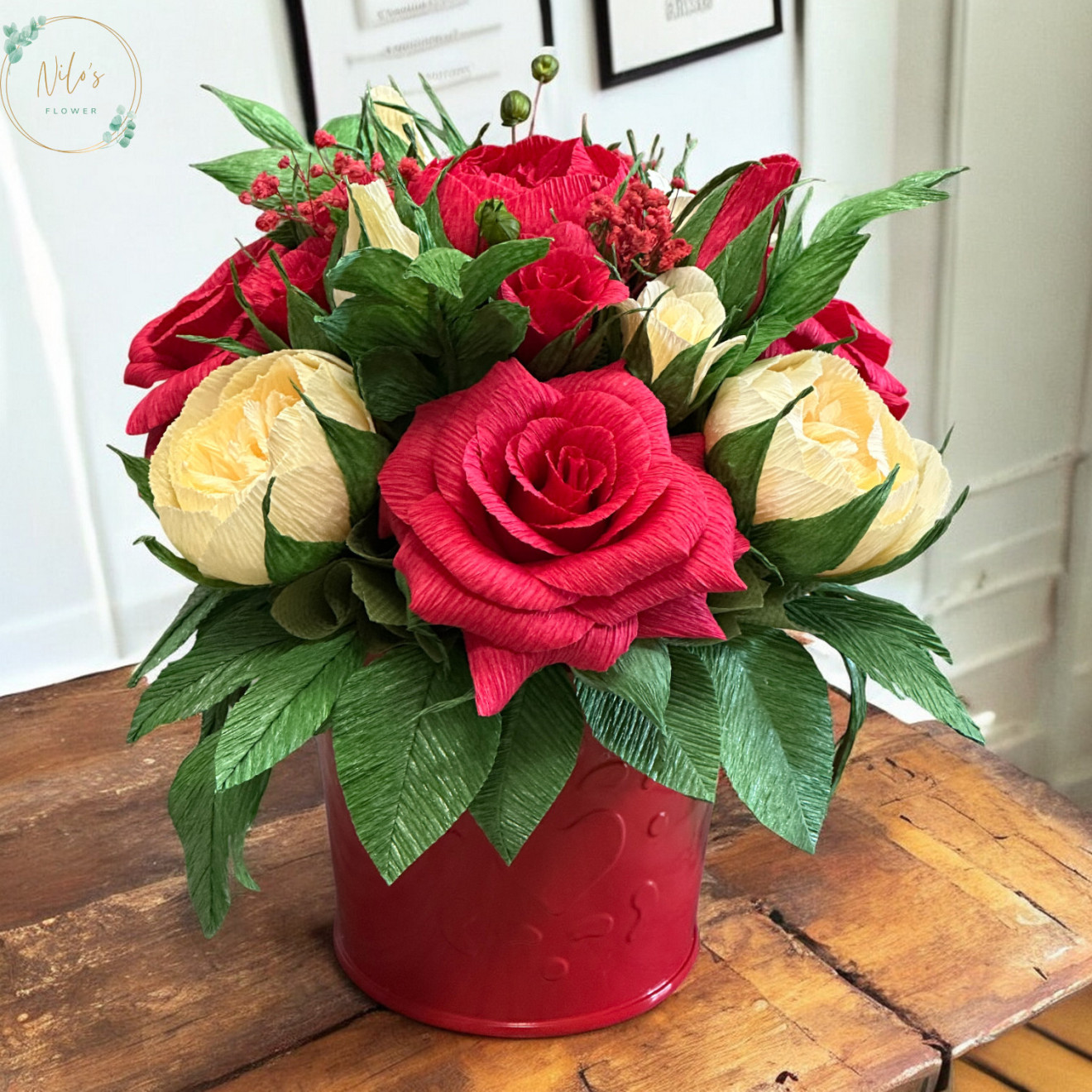 Красива аранжировка с цветя от креп хартия. Срокът за изработка може да е различен в зависимост от ангажираността към момента на поръчката.