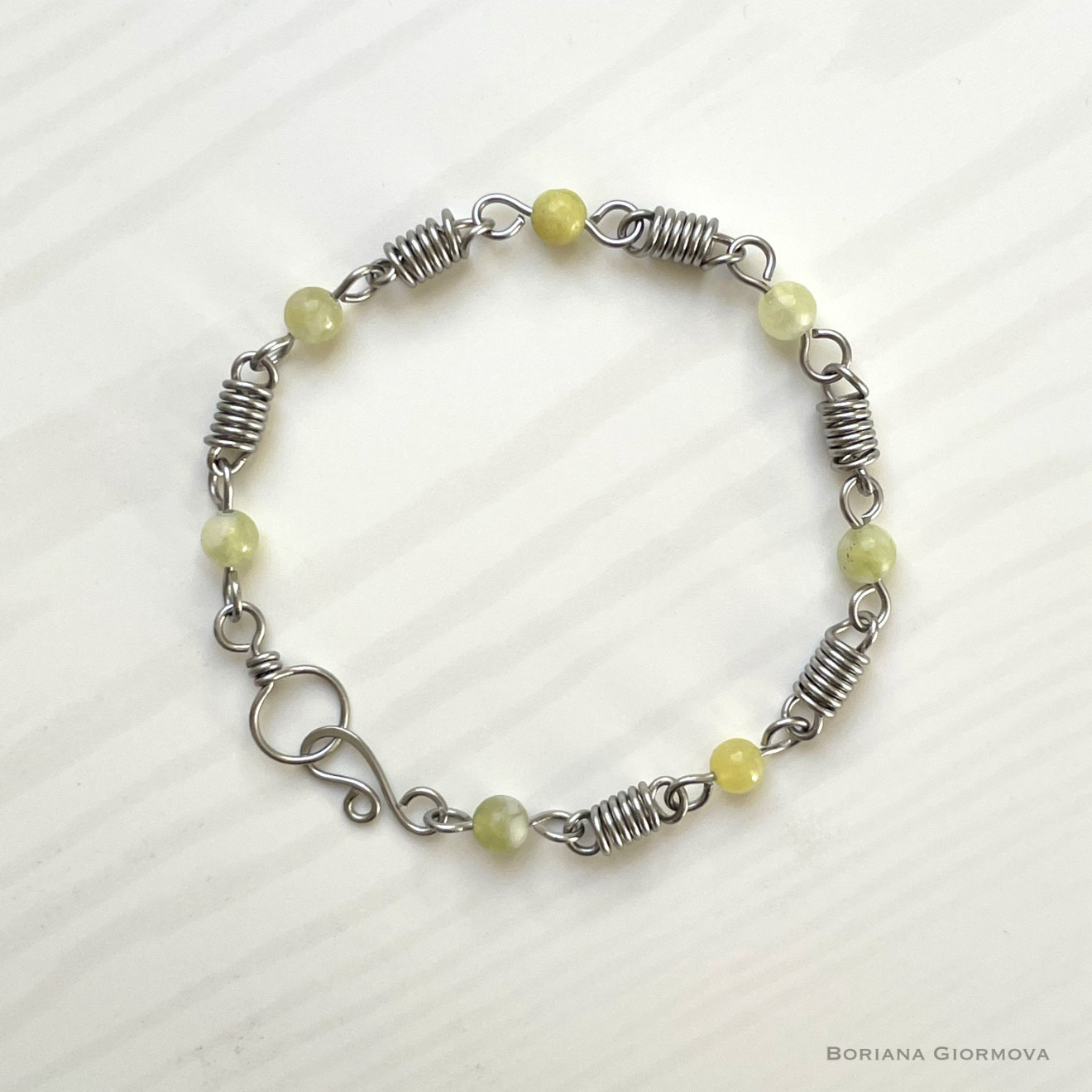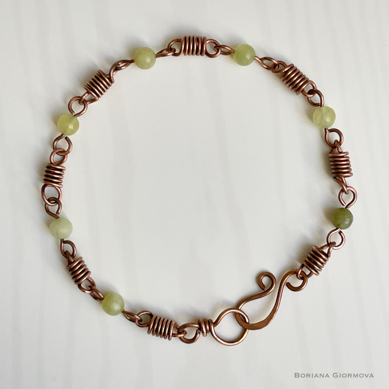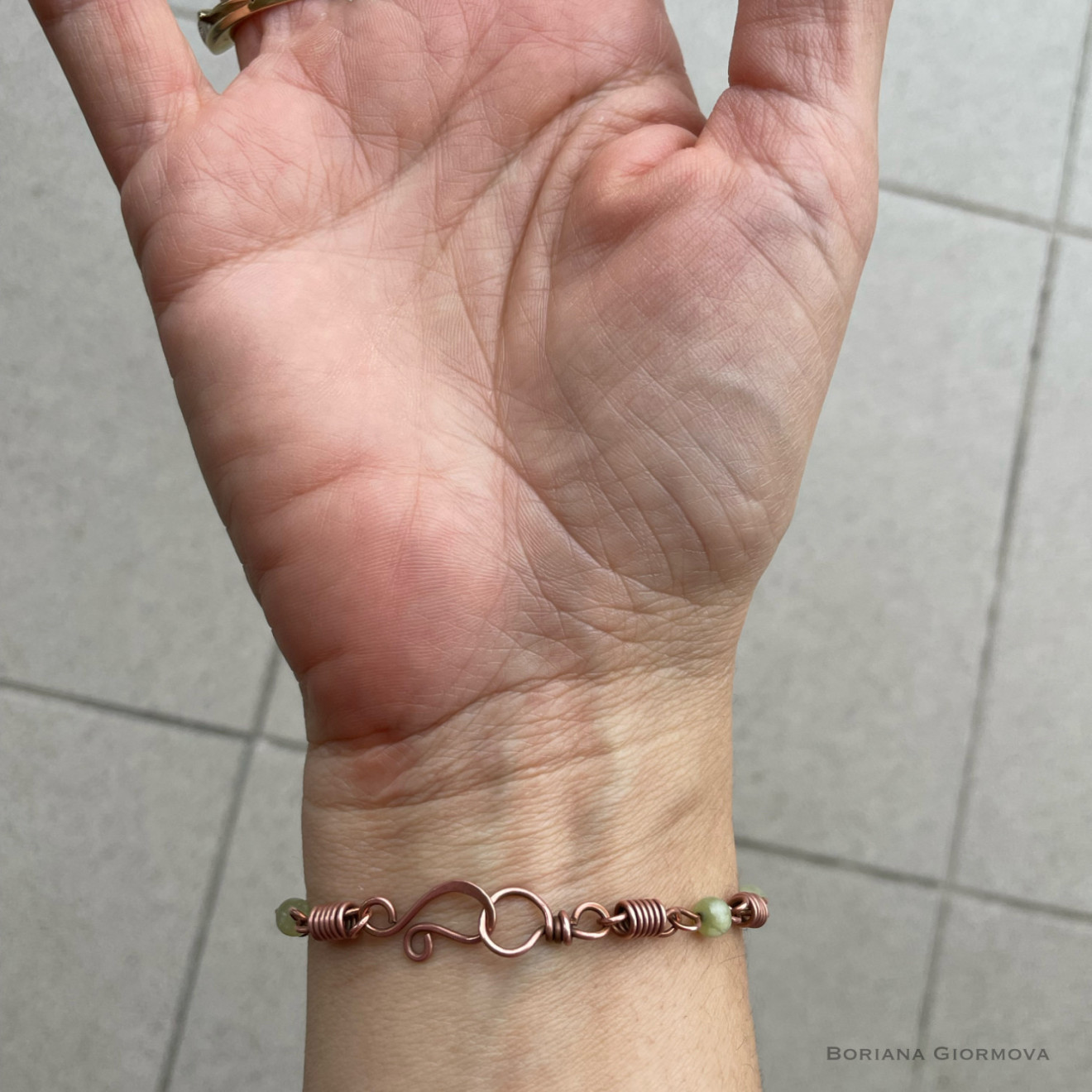 Ръчно изработена медна гривна със зелени камъни жадеит. Изработена от медна тел, оформена като декоративни пружинки, с кована закопчалка и естествени камъни с размер 4 мм. Гривната е удобна и подходяща както за ежедневието, така и за по-специални поводи. Смята се, че жадеитът притежава успокояващи свойства и привлича късмет и благополучие. Важна информация: Медта е естествен материал и с времето може да потъмнее, което е нормален процес. Патината придава на бижуто характерен и автентичен вид. За да запазите гривната в добро състояние: - Пазете я от влага и химикали. - Съхранявайте я на сухо място. - Почиствайте медта с мека кърпа. Можете да използвате и препарат за почистване на медни бижута, но имайте предвид, че патината, която придава характер на бижуто, ще изчезне напълно. Характеристики: Материал: Медна тел Камъни: Зелен жадеит, 4 мм Размер: По поръчка. При измерване на китката добавете минимум 1 см за лесно закопчаване. Най-добре премерете дължината на най-удобната си гривна от такъв тип. Ръчна изработка: Всяко бижу е уникално Подаръчна кутийка: Бижуто идва в подаръчна кутийка и е готово за подаряване. Тази гривна е семпло и стилно допълнение към всяка визия. Гривната може да бъде изработена и от неръждаема стомана 304 (като на последната снимка).