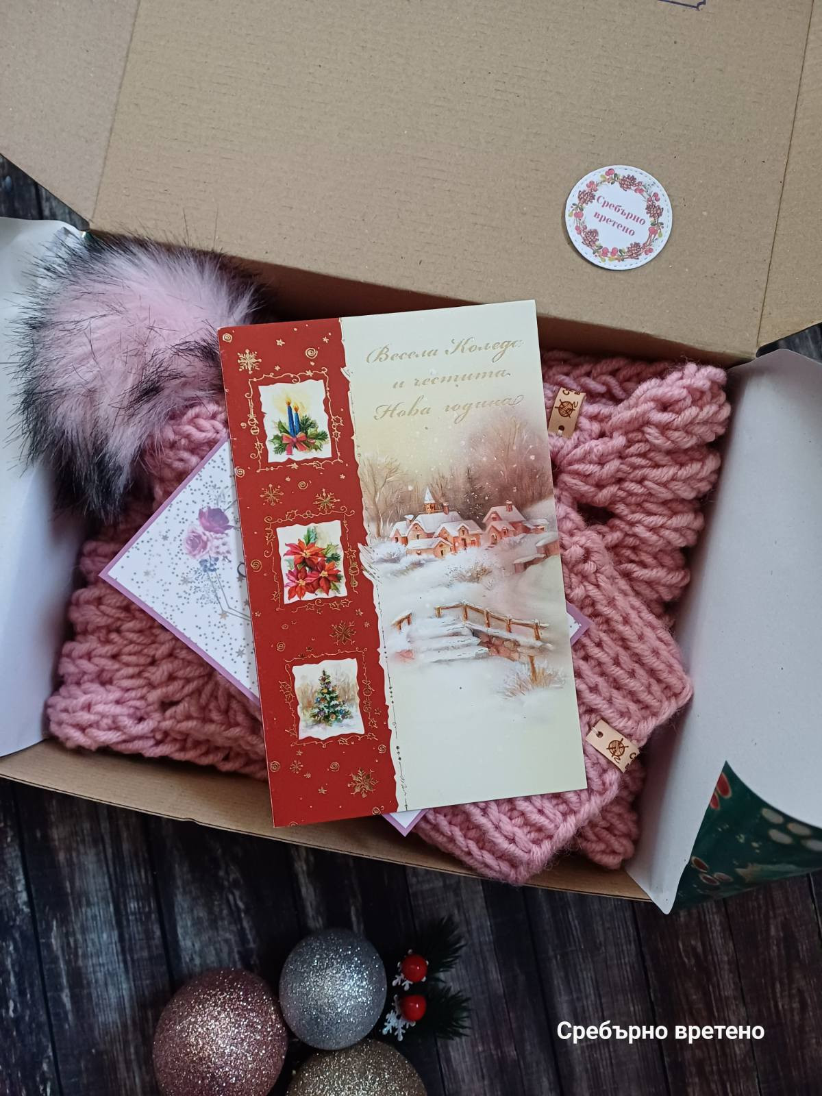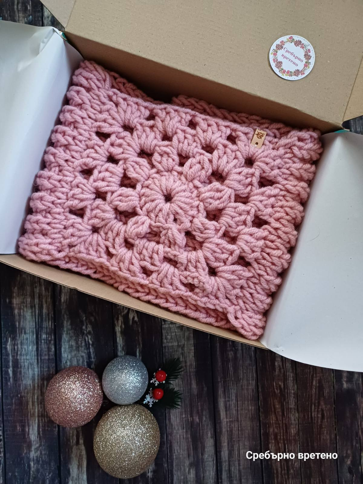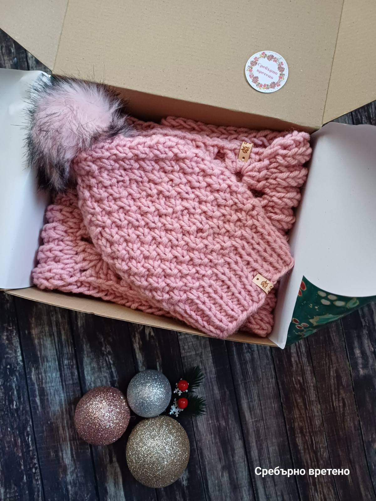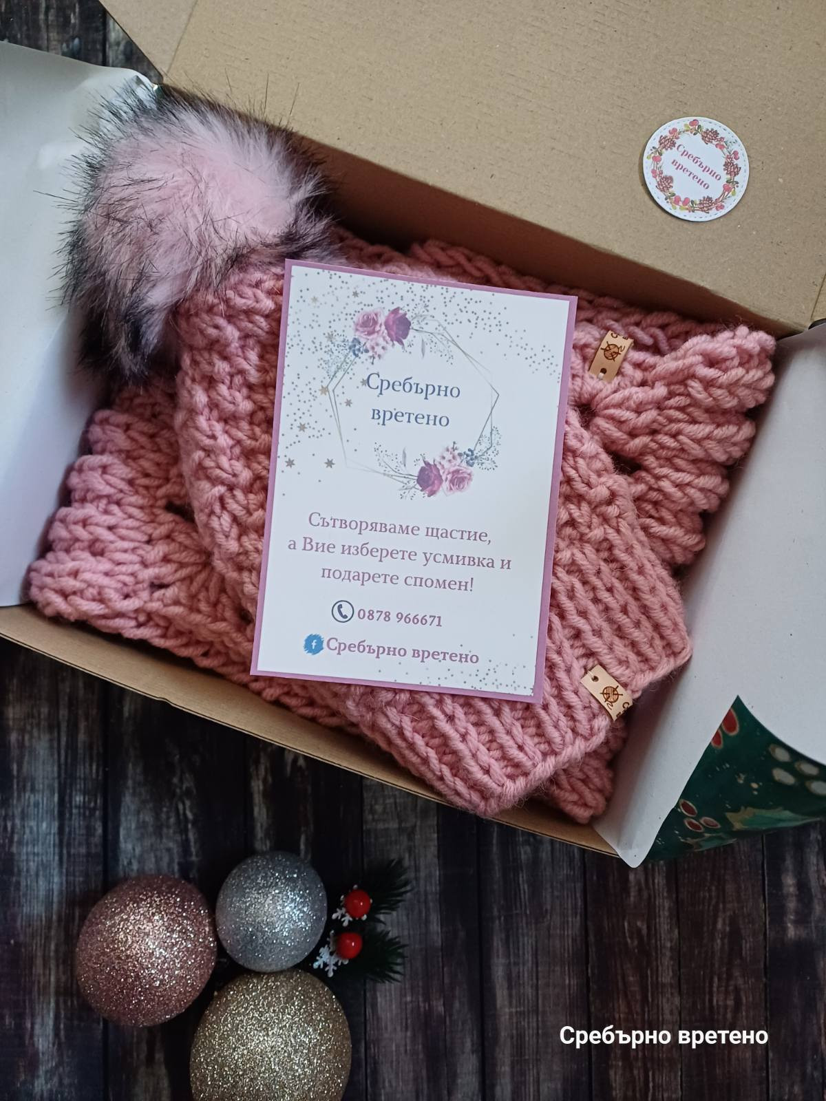 Мили хора, идея за подарък, тривиален и практичен, но казва много, прегръща, топли, дарява здраве и сигурност в студените дни, дългогодишен спомен. Зимни аксесоари – шал и шапка "Севда" в нежен цвят азалия. Прежда - 30 % Вълна, 70 % Акрил. Машинно пране: програма за вълна, до 30 градуса, препарат за плетени и деликатни дрехи. Шал: ширина: 20 см, обиколка: 150 см, двойно омотаване през главата. За разкош и бутиков щрих е добавен красив акцент, изплетен на една кука. Шапка с подвижен помпон от еко косъм: универсален дамски размер. Всеки малък детайл е от значение за нас! И е нашата гаранция за качество и дълготрайност на изделията. Кожени етикети с марка Сребърно вретено. Кутия със стикер Сребърно вретено. Печатче Сребърно вретено с телефонен номер. Флаер за грижа за изделията. 10-годишна успешна история. Да, това сме ние. Сребърно вретено – Стаси и семейството. Пишете ни. Последвайте Сребърно вретено във Facebook, за да научавате за намаления и нови изделия.