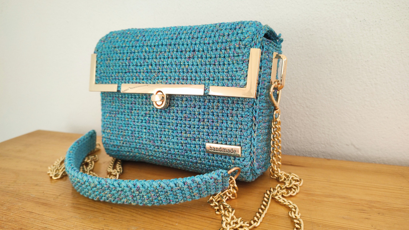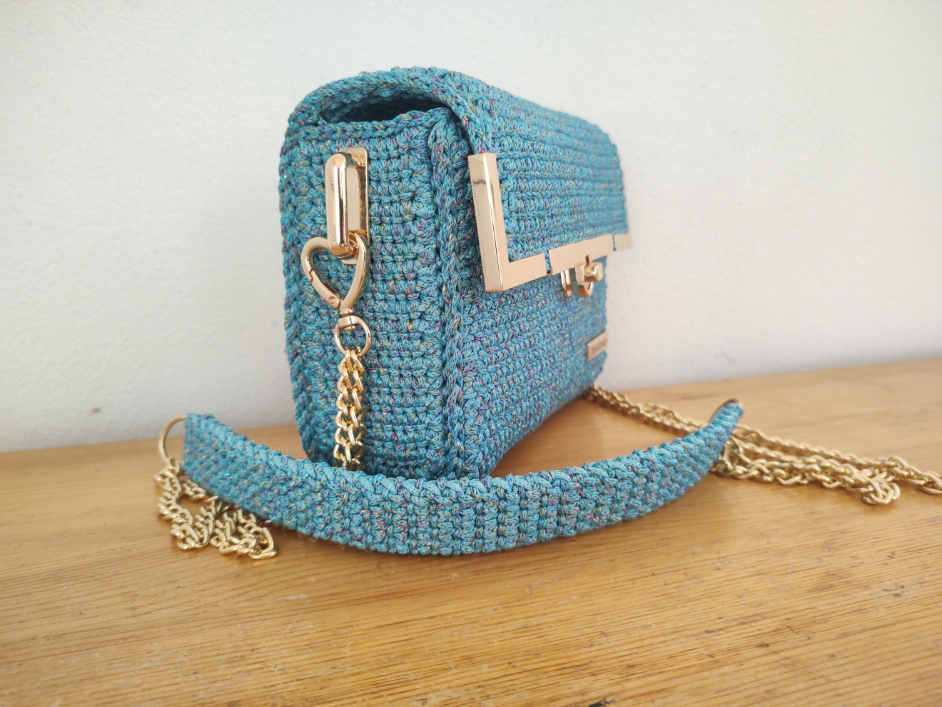 Изцяло плетена като използвах два вида полиестерно макраме в синьо : едното с цветна лъскава нишка, а другото без . Имаме си метални златисти елементи и дръжка :плетиво и синджир.