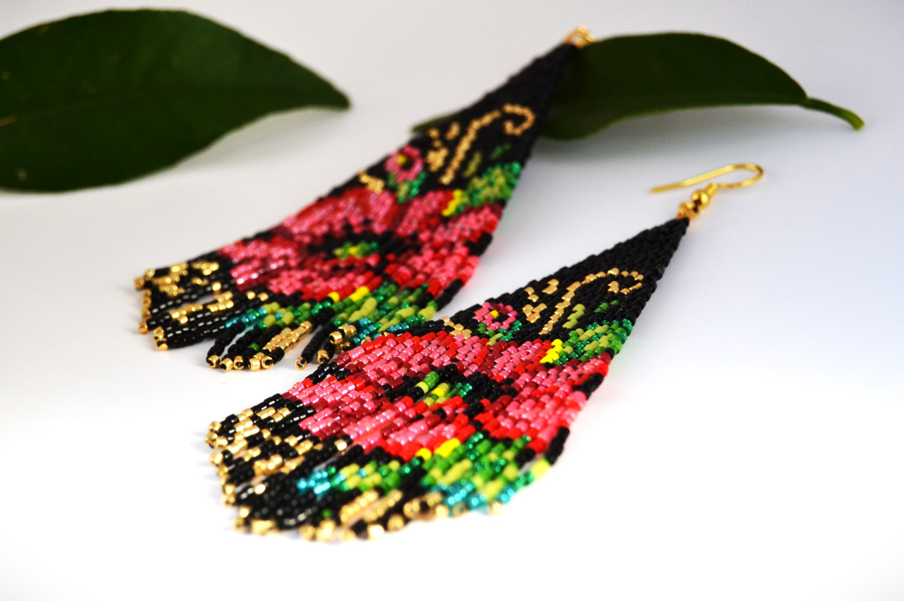 Екстравагантни висящи обици. Смели и дръзки, изработени са от японски стъклени мъниста с размер 1,3 мм,финни и много леки за носене . Използвания метал е медицинска хипоалергенна стомана.