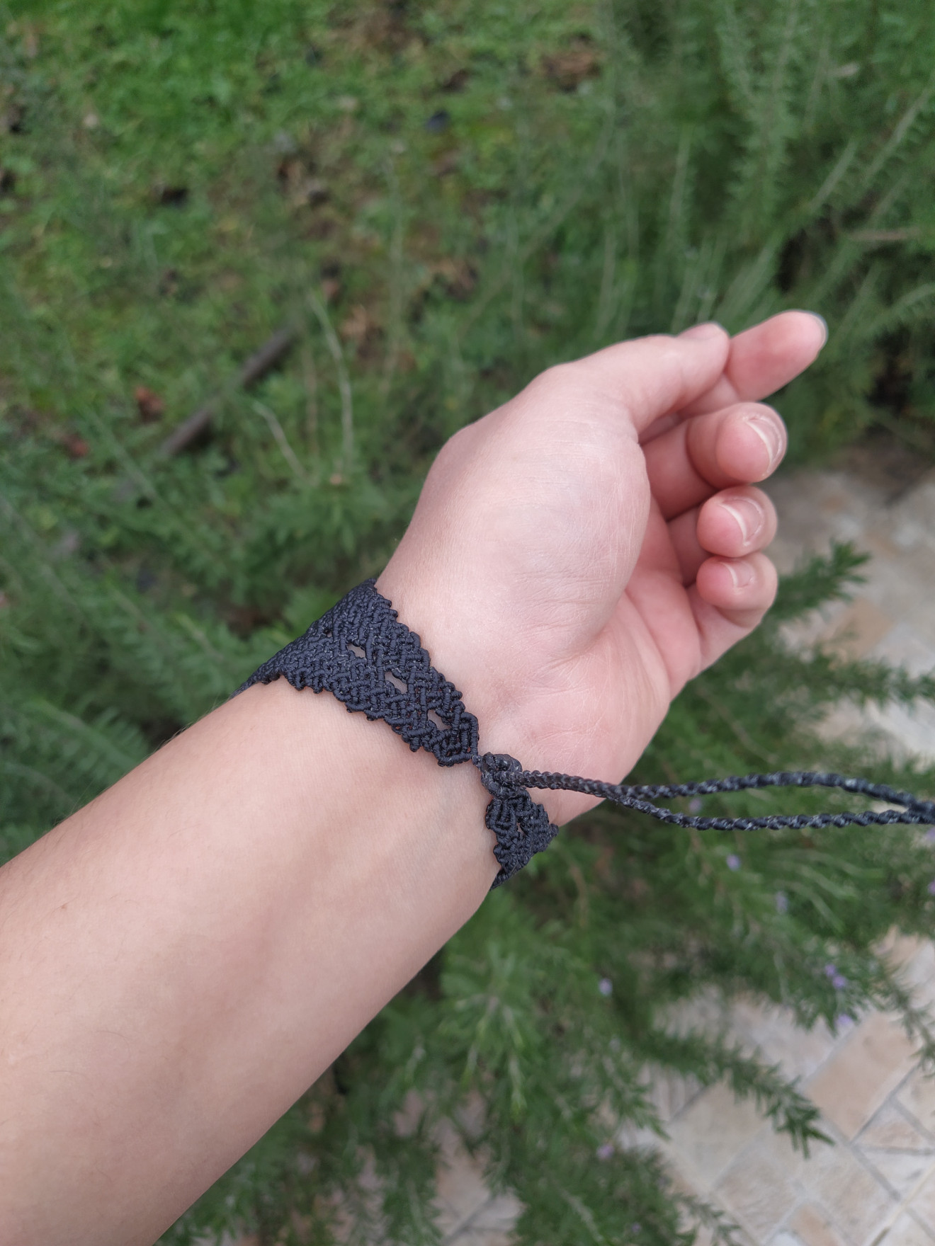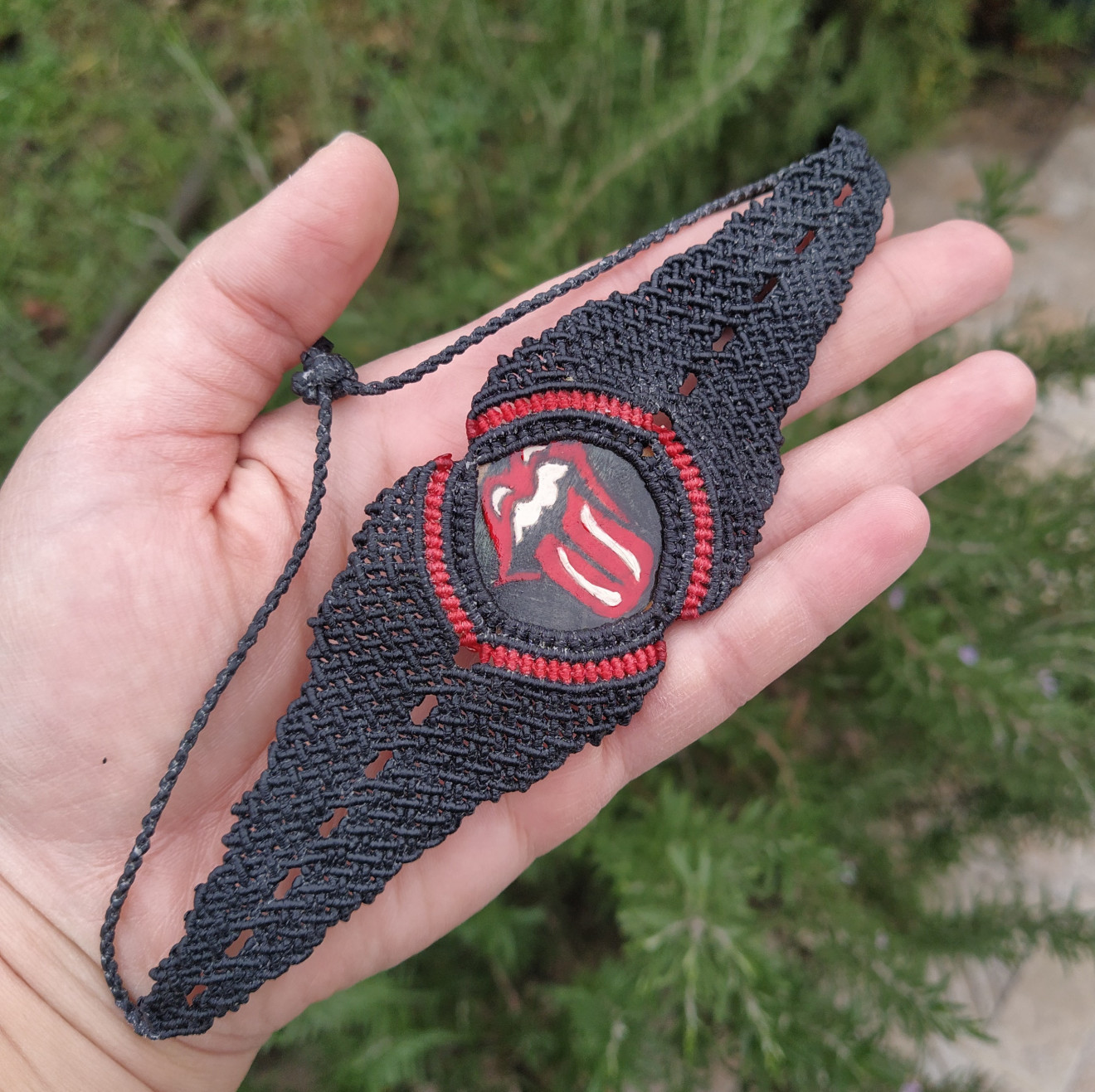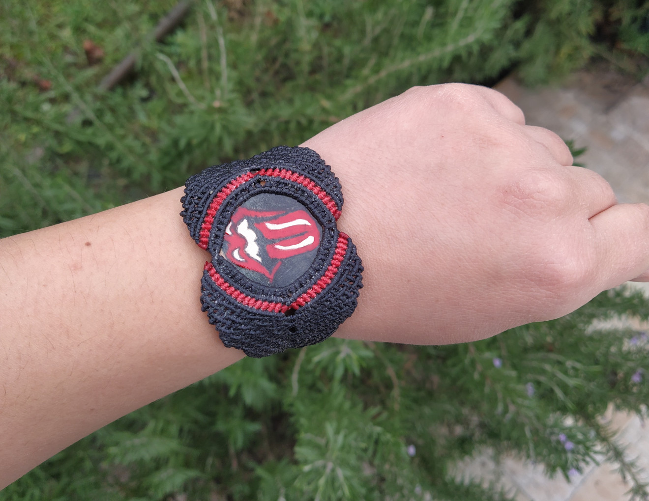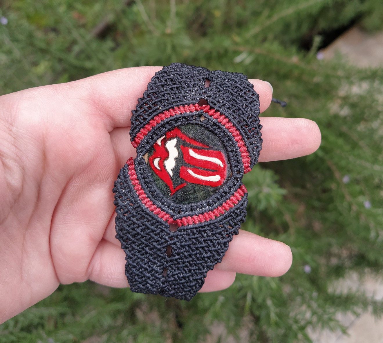 В средата е дървена плочка, рисувана с акрилни бои и запечатана с лак за повече устойчивост. Плочката е оплетена с восъчни конци, които продължават в две страни, за да оформят гривна. Дължината се регулира, чрез пристягащ възел. Артикула идва при Вас опакован и готов за подарък. Може да се изработи с друго изображение, знак, символ, в желани от Вас цветове.