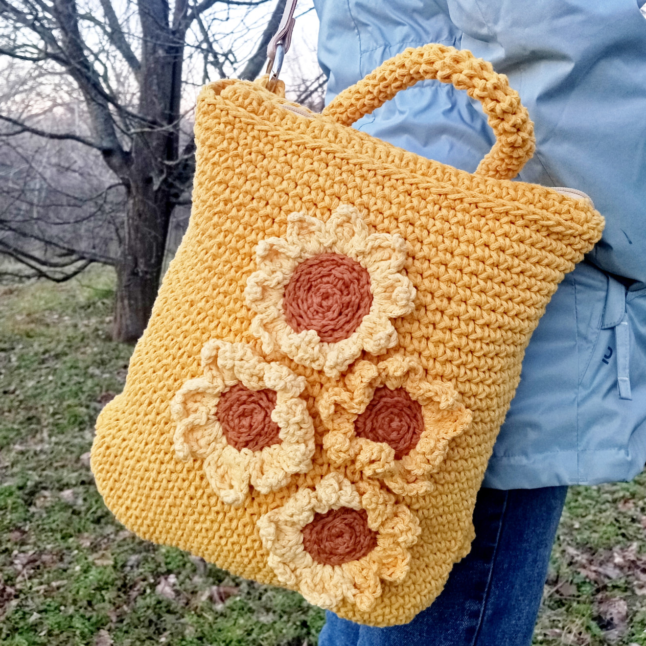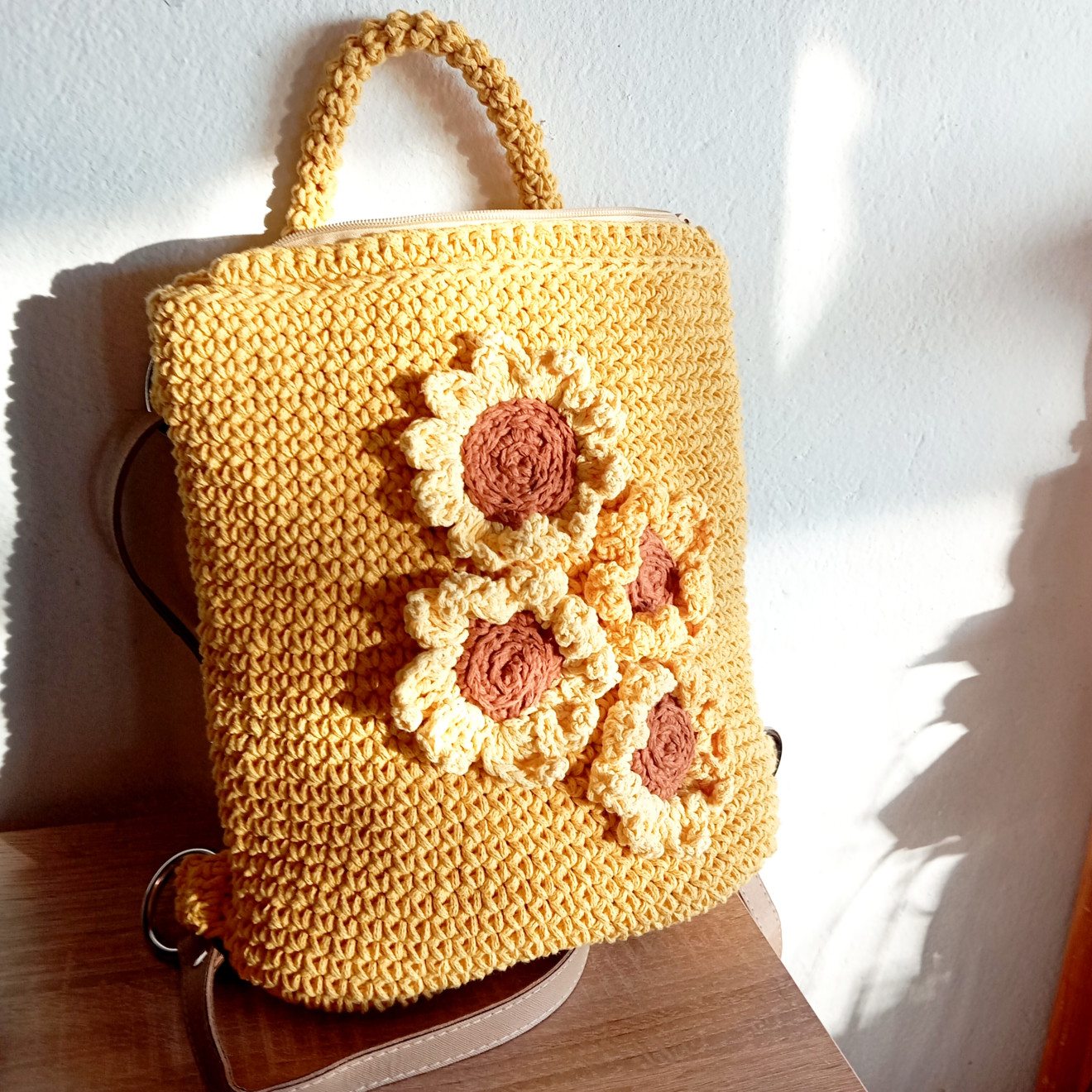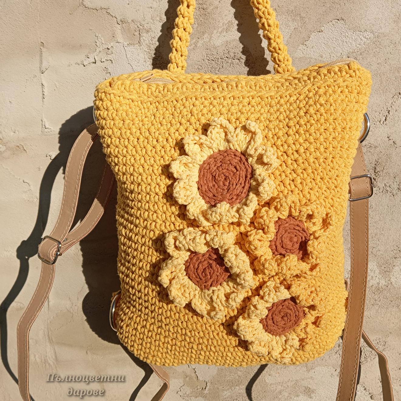 Раница, която може да се носи като чанта - 3 в 1. С декорация от плетени слънчогледи. ? ?️ Размери Обиколка 65 см. Височина 32 см. ✓ Външен плетен заден джоб на гърба. ✓ Закопчаване с цип отгоре. ✓ Има подплата с два вътрешни джоба. ???Може да се носи в ръка, през рамо и като раница. Дръжките от изкуствена кожа се свалят, за да може да се променя начина на носене. ? Може да се пере. ? Издръжлива, благодарение на твърдото памучно тънко въже, което е използвано за плетенето й. ✨ Възможно е да се изработи в други цветове. Изпълняваме индивидуални поръчки. ? Всички плетива пристигат опаковани в кутия с панделка, готови за подаряване. Ще е чудесен подарък за дама, която обича слънчогледите или цветята. ✨ Подготвят се индивидуално и може да се добави лично послание. ? Напишете съобщение, ако го познаете за себе си или за подарък! Поздрави! Пълноцветни дарове ?