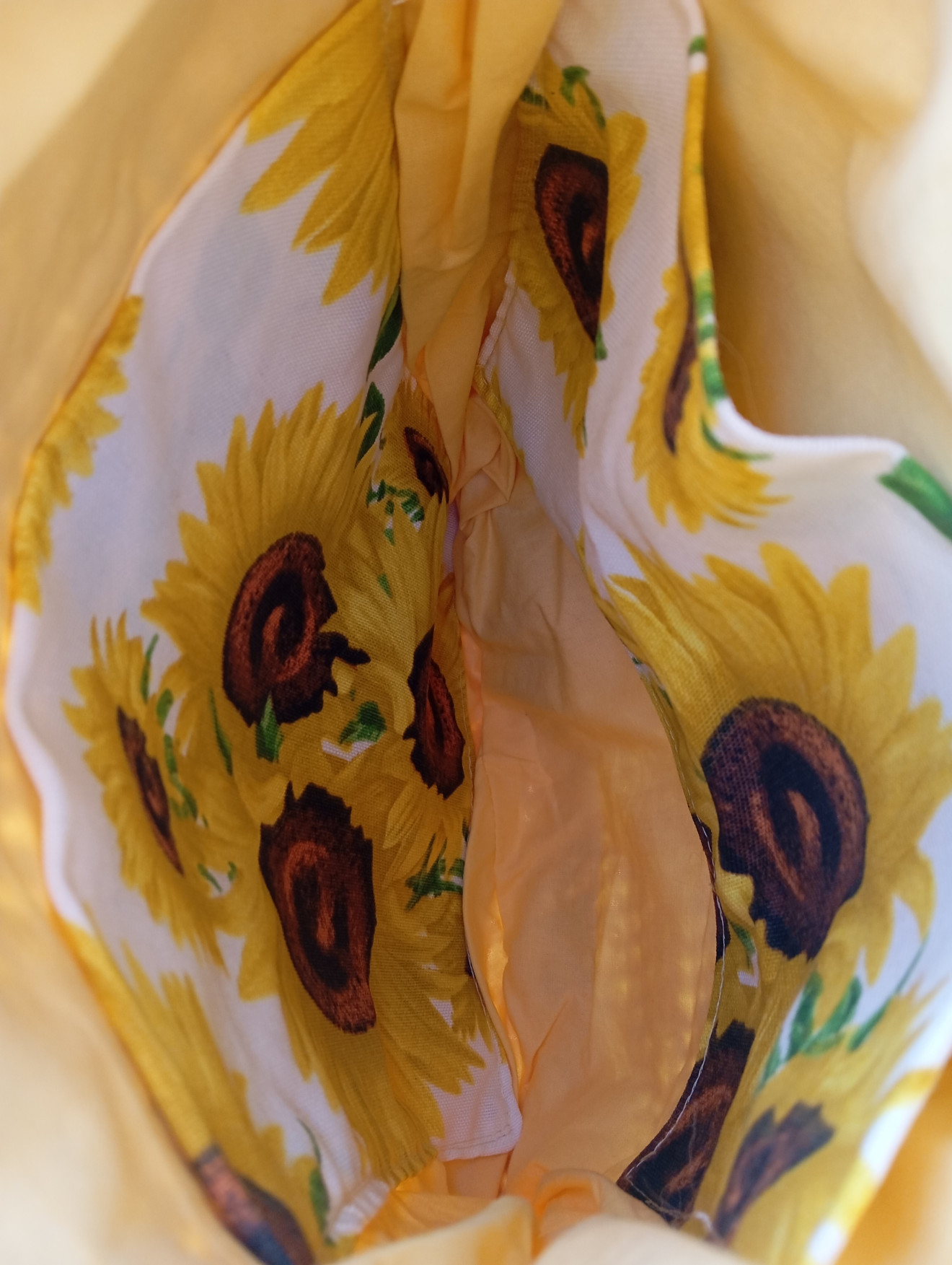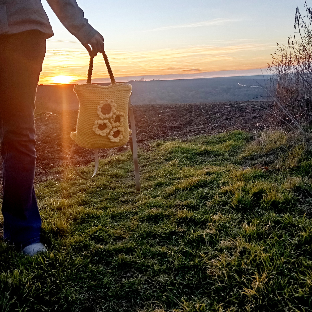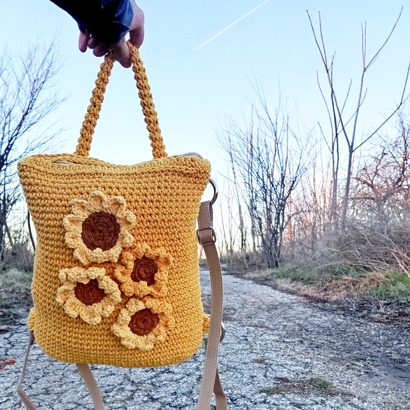 Раница, която може да се носи като чанта - 3 в 1. С декорация от плетени слънчогледи. ? ?️ Размери Обиколка 65 см. Височина 32 см. ✓ Външен плетен заден джоб на гърба. ✓ Закопчаване с цип отгоре. ✓ Има подплата с два вътрешни джоба. ???Може да се носи в ръка, през рамо и като раница. Дръжките от изкуствена кожа се свалят, за да може да се променя начина на носене. ? Може да се пере. ? Издръжлива, благодарение на твърдото памучно тънко въже, което е използвано за плетенето й. ✨ Възможно е да се изработи в други цветове. Изпълняваме индивидуални поръчки. ? Всички плетива пристигат опаковани в кутия с панделка, готови за подаряване. Ще е чудесен подарък за дама, която обича слънчогледите или цветята. ✨ Подготвят се индивидуално и може да се добави лично послание. ? Напишете съобщение, ако го познаете за себе си или за подарък! Поздрави! Пълноцветни дарове ?