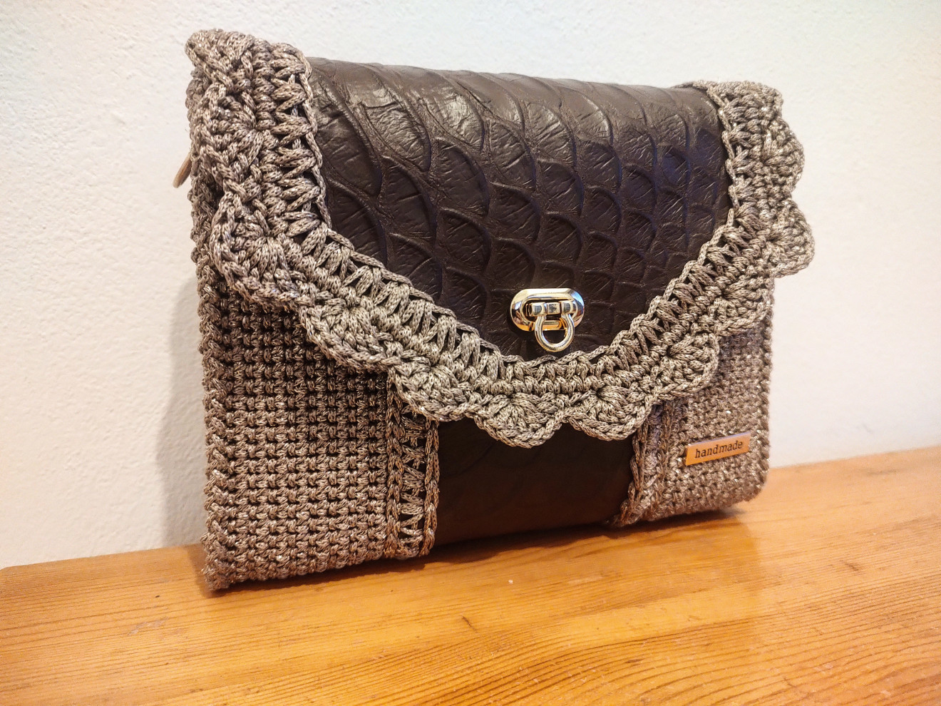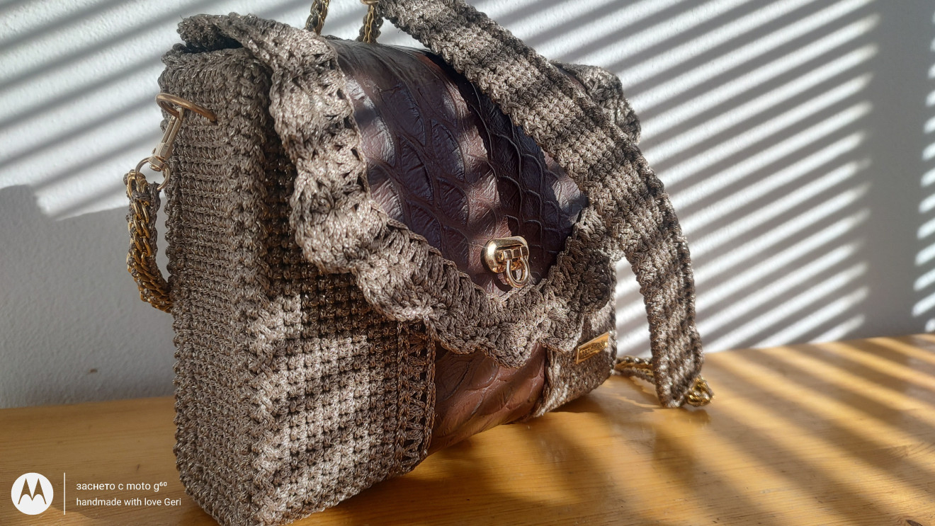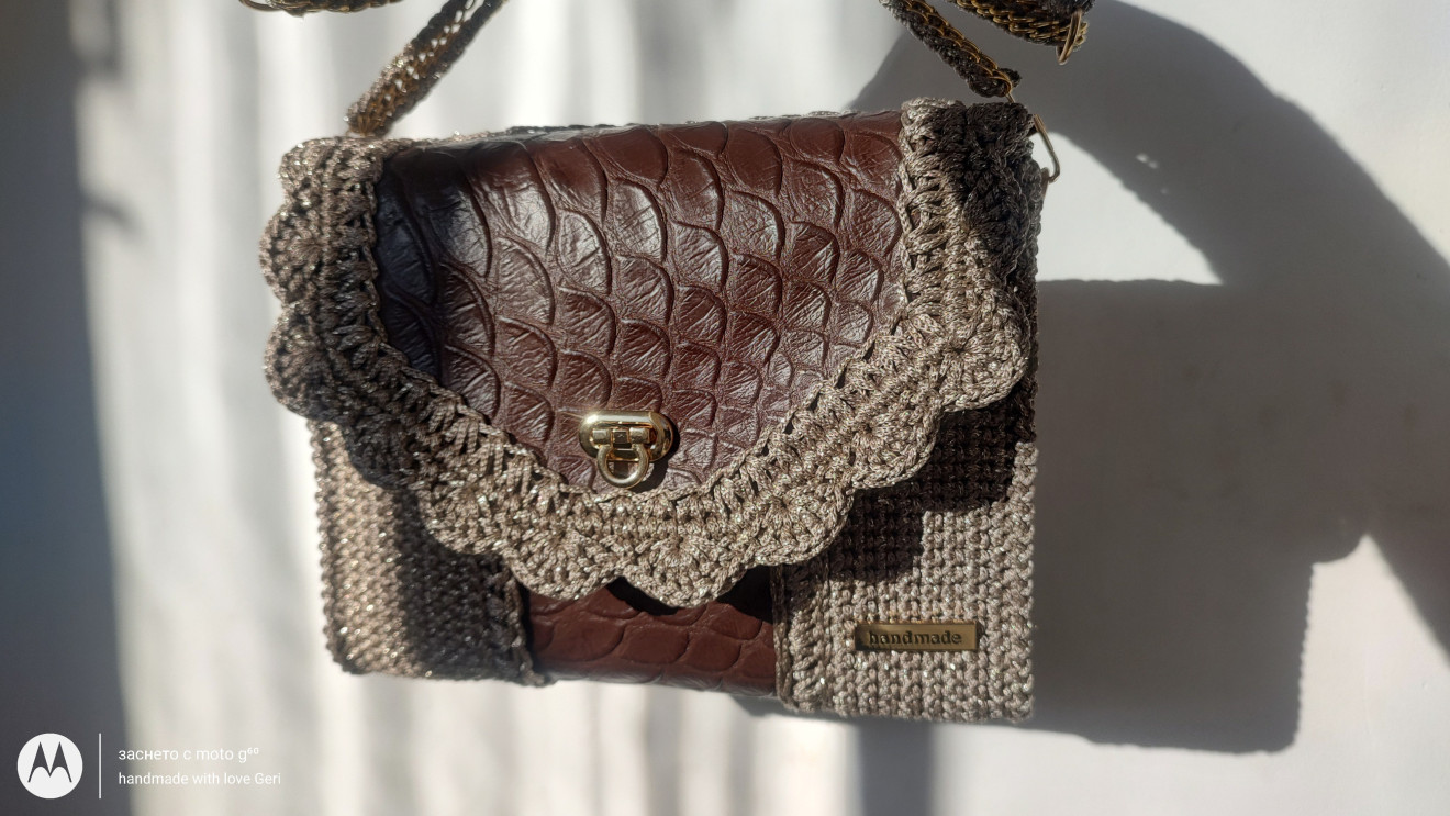 Естествена кожа и полиестерно макраме с лъскава нишка вплетени в едно , и комбинация с метални елементи в златисто. П.с. нямам налична същата кожа ( чантата не е налична) , но имам други цветове и десени , може да се изработи в комбинация по избор . За повече информация може да ми пишете на лично съобщение и на страницата ми във фейсбук "творенията на Гери"!
