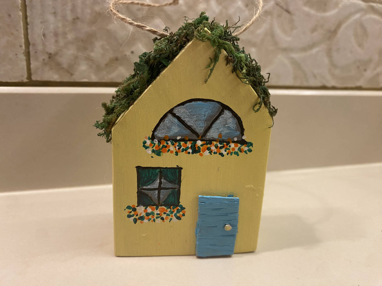 Рисувана дървена къщичка, декорирана с естествен мъх.