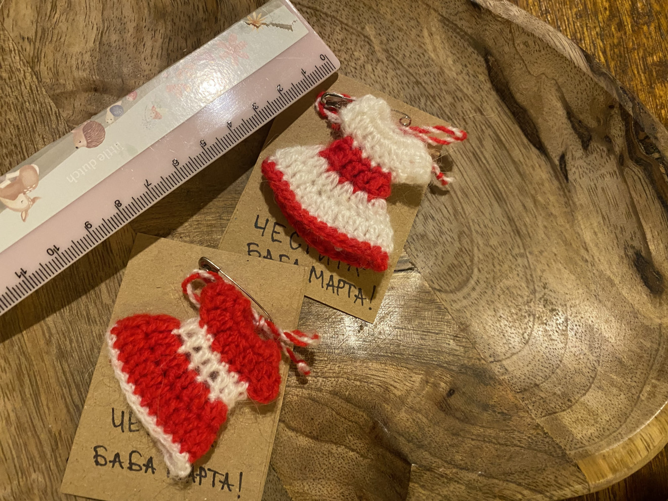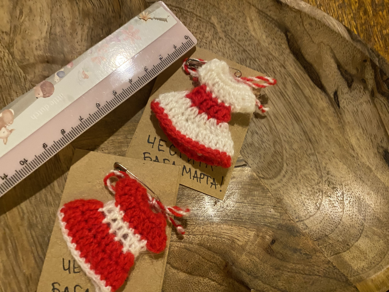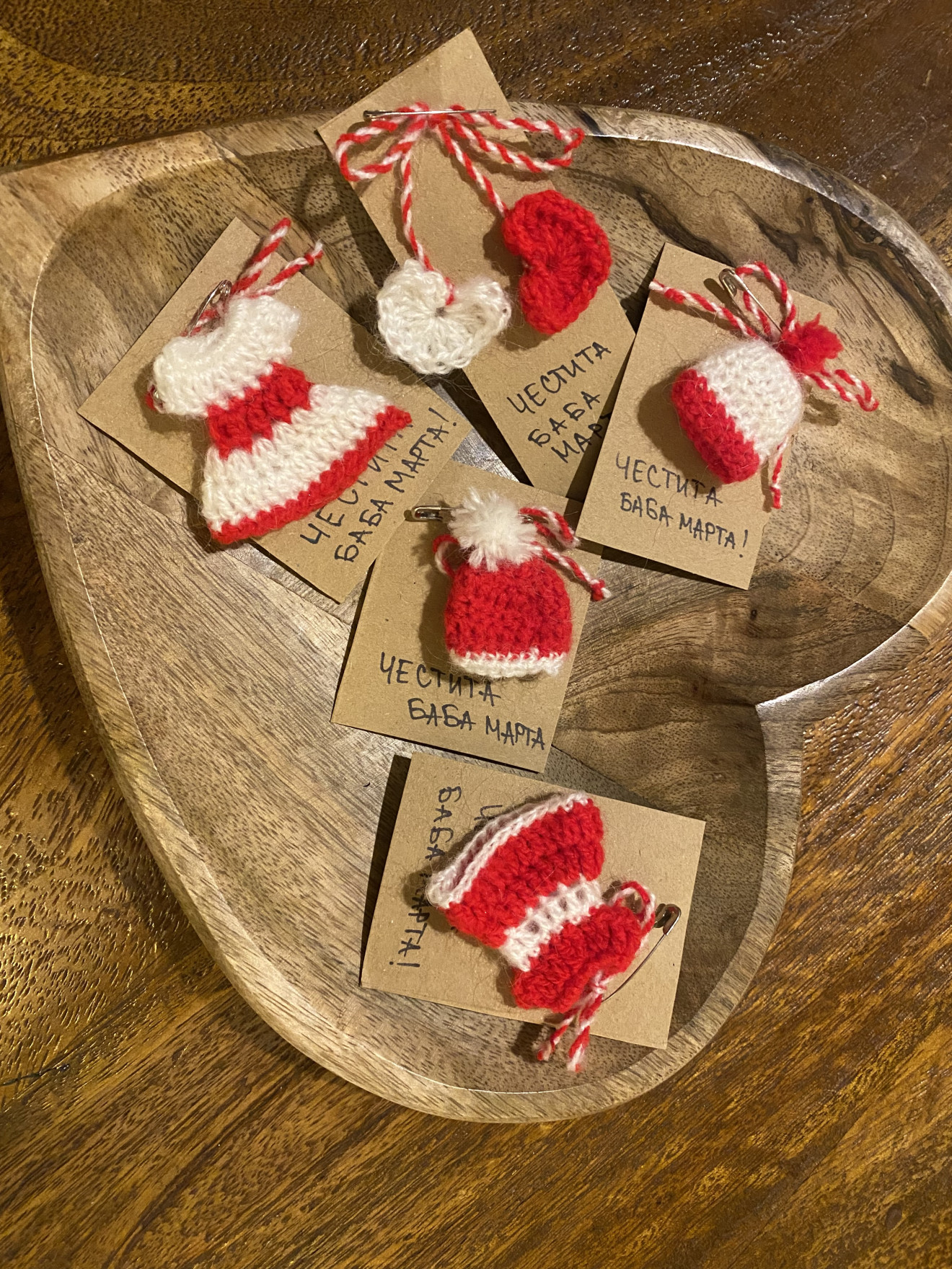Мартенички, изплетени на една кука, с много любов и внимание към детайла. Традиционни, същевременно артистични и красиви. Опаковани, придружени с първомартенско стихче. Цени: -шапка с помпон- 7 лева/брой - рокличка- 7 лева/брой - сърчица- 4 лева/ мартеничка с едно червено и едно бяло сърчице Усмивки! :) Мария